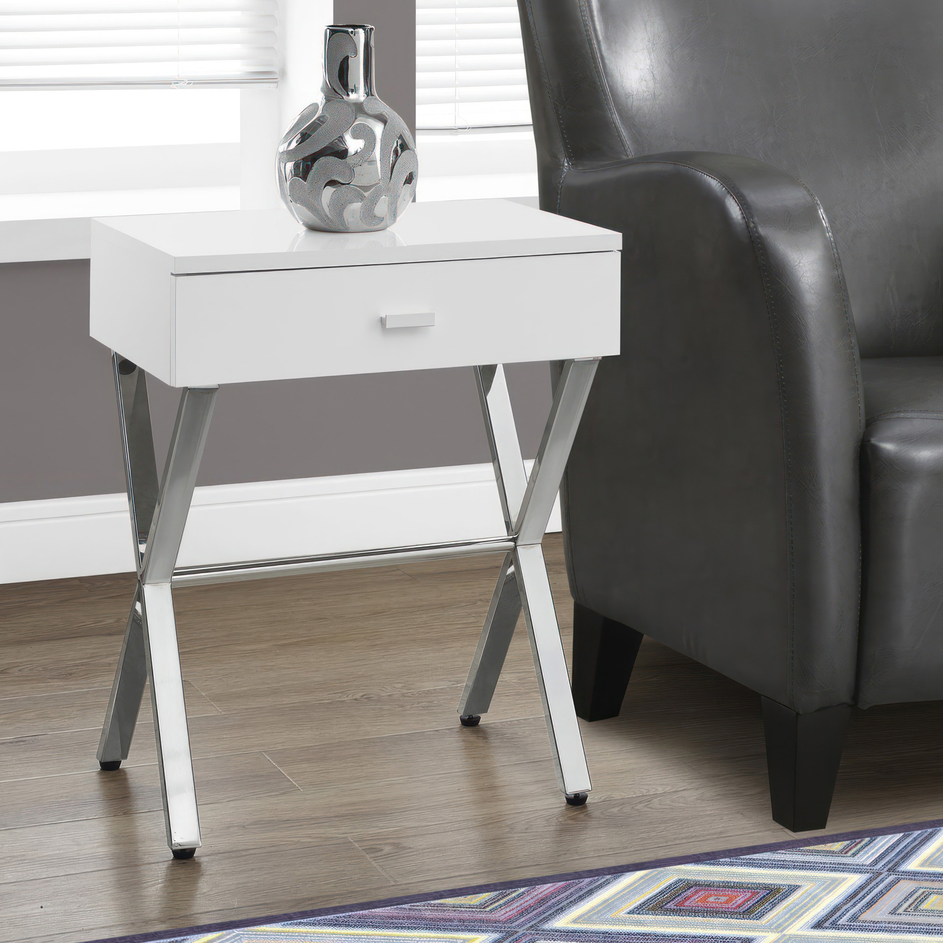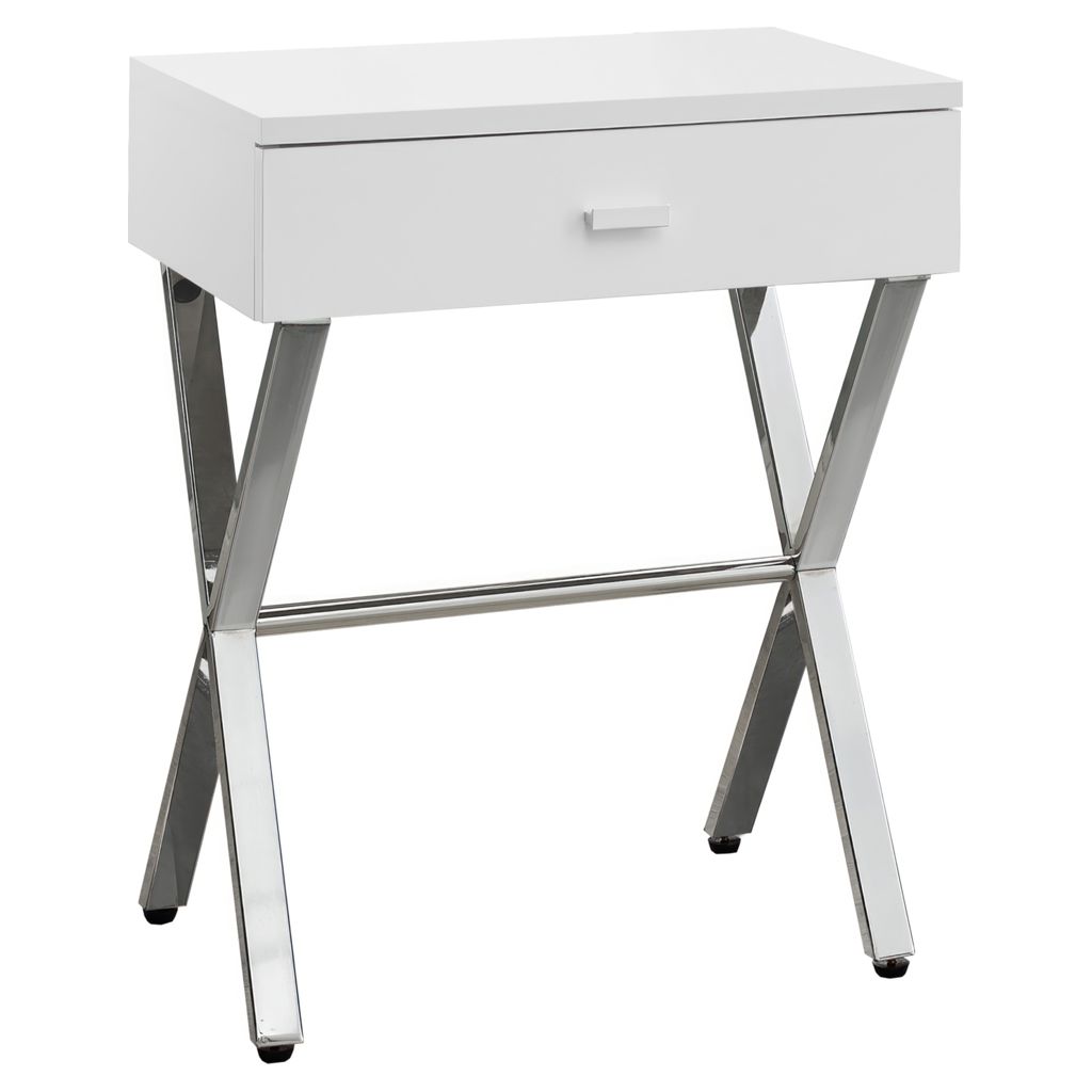 For a more modern look in your living room, family room, office or bedroom, this elegant white gloss/chrome metal end table will meet your expectations.