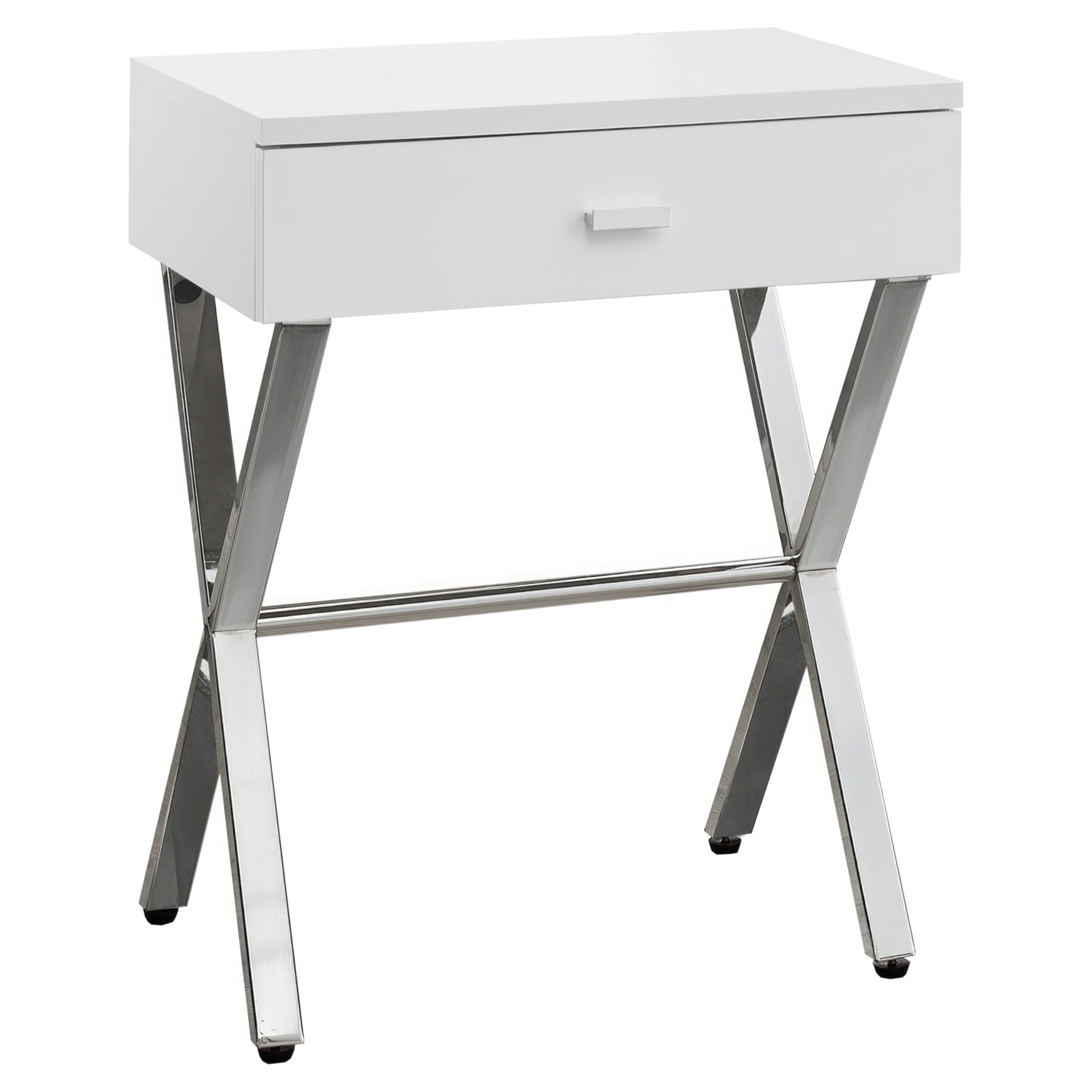 Bring more modernity to your home with this white glossy finish side table on all sides that is supported by an ultra-stylish chrome metal base.