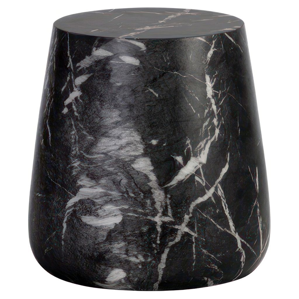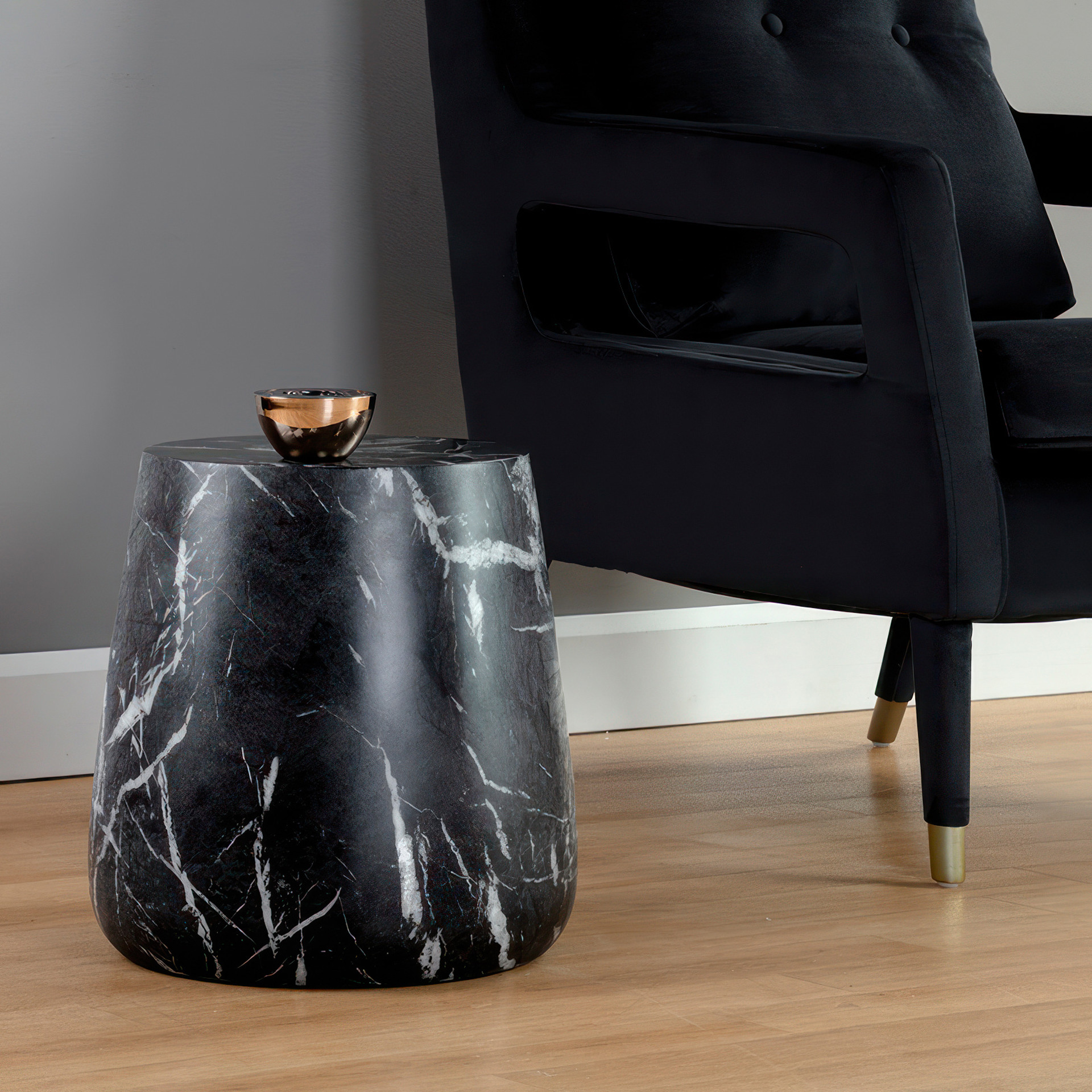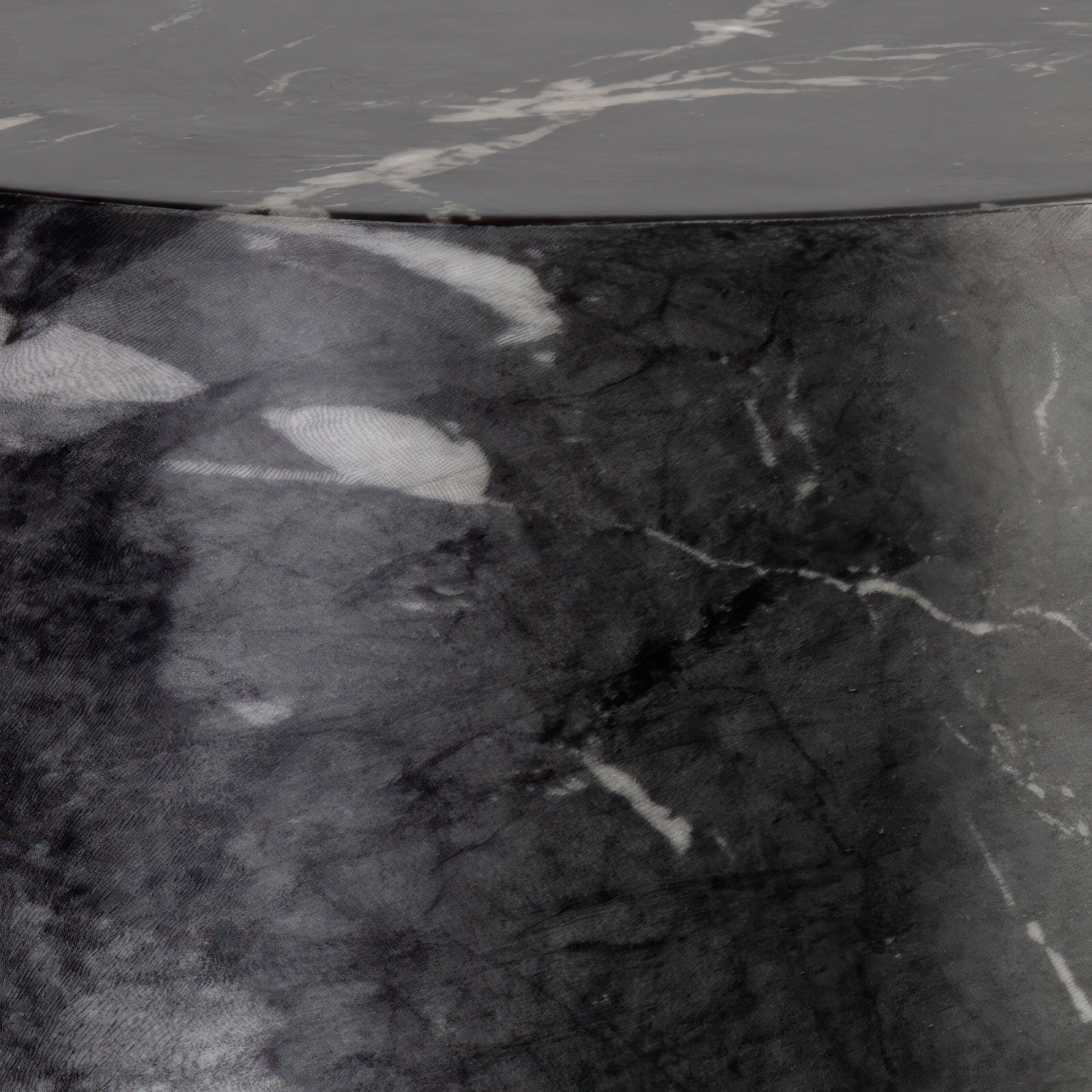 This is a great concrete side table with a black and white marble look finish. A versatile and functional piece suitable for indoor and outdoor covered spaces.