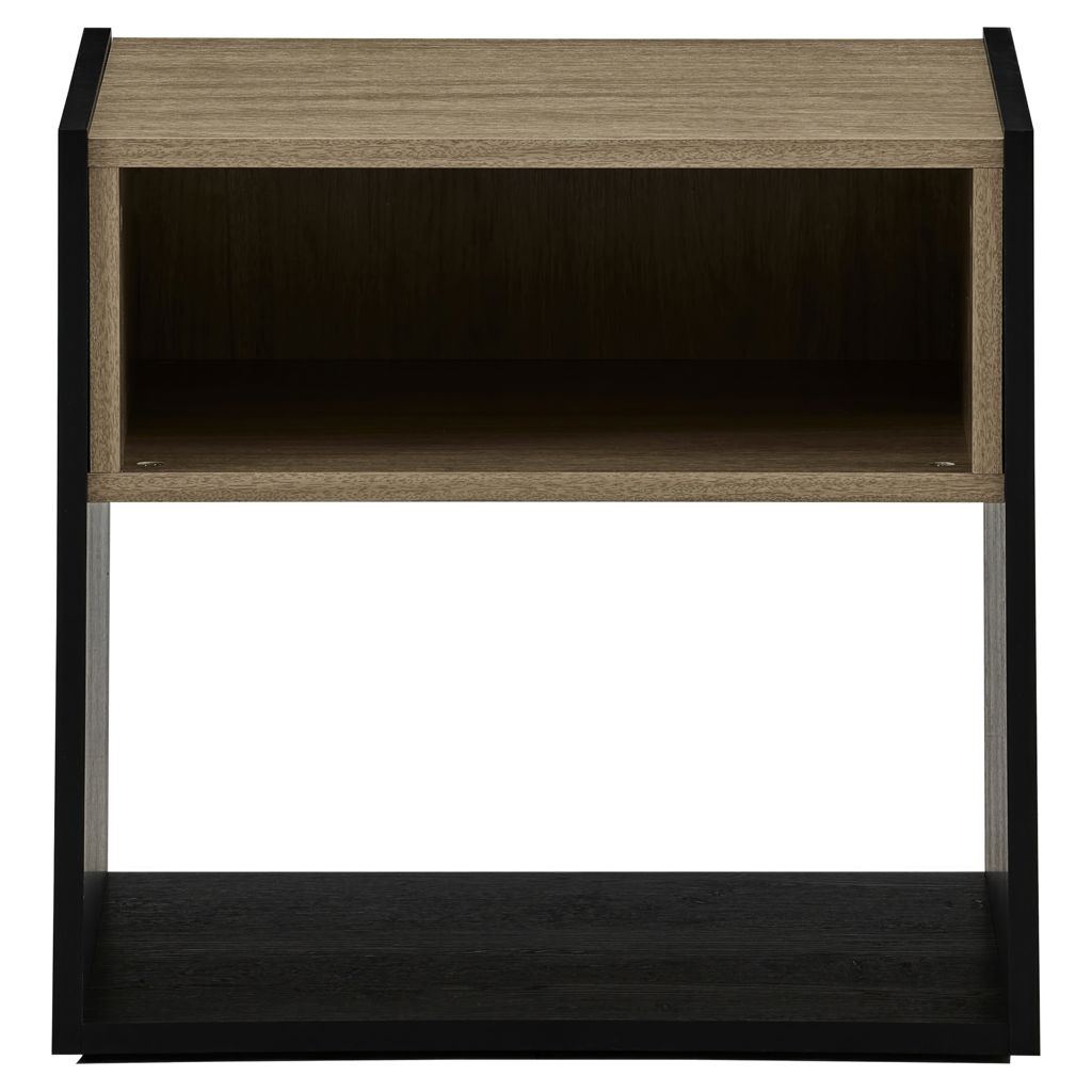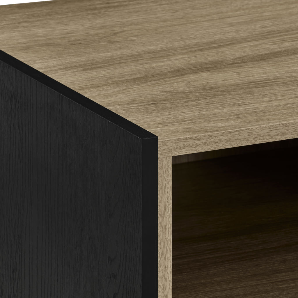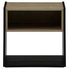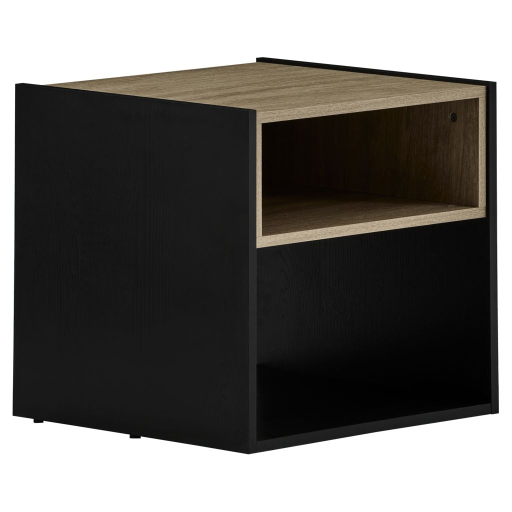 The two-tone finish creates a sophisticated contrast between deep black and warm wood tones, adding a modern touch to your living room or bedroom. Perfect for placing a lamp, book, or remote control, it optimizes space while remaining highly functional.