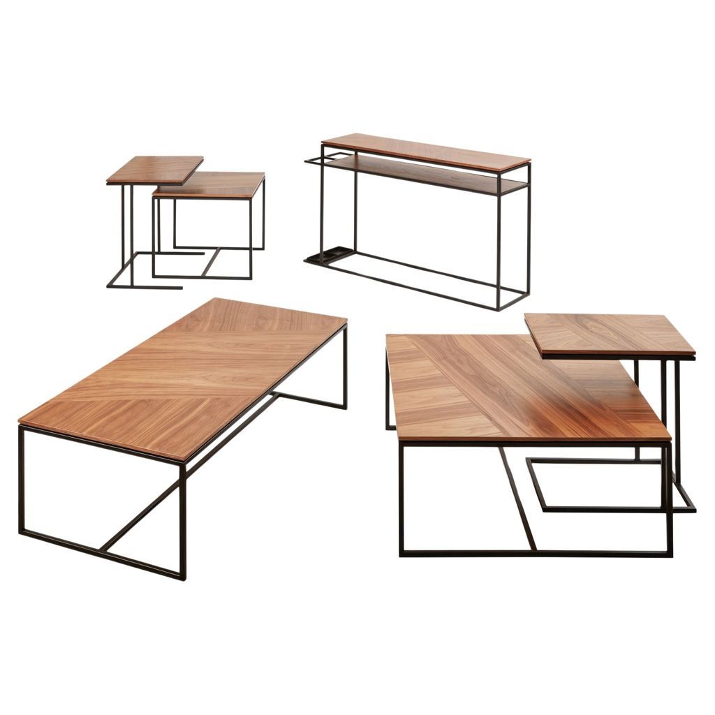The rectangular top features a dynamic arrangement of walnut wood grain panels, which rest on a slim, solid steel base. A subtle reveal along the edge of the table creates the illusion of a floating tabletop. Part of the Tobias table series, matching perfectly with the Tobias square coffee table, rectangular coffee table, side table and nesting table.