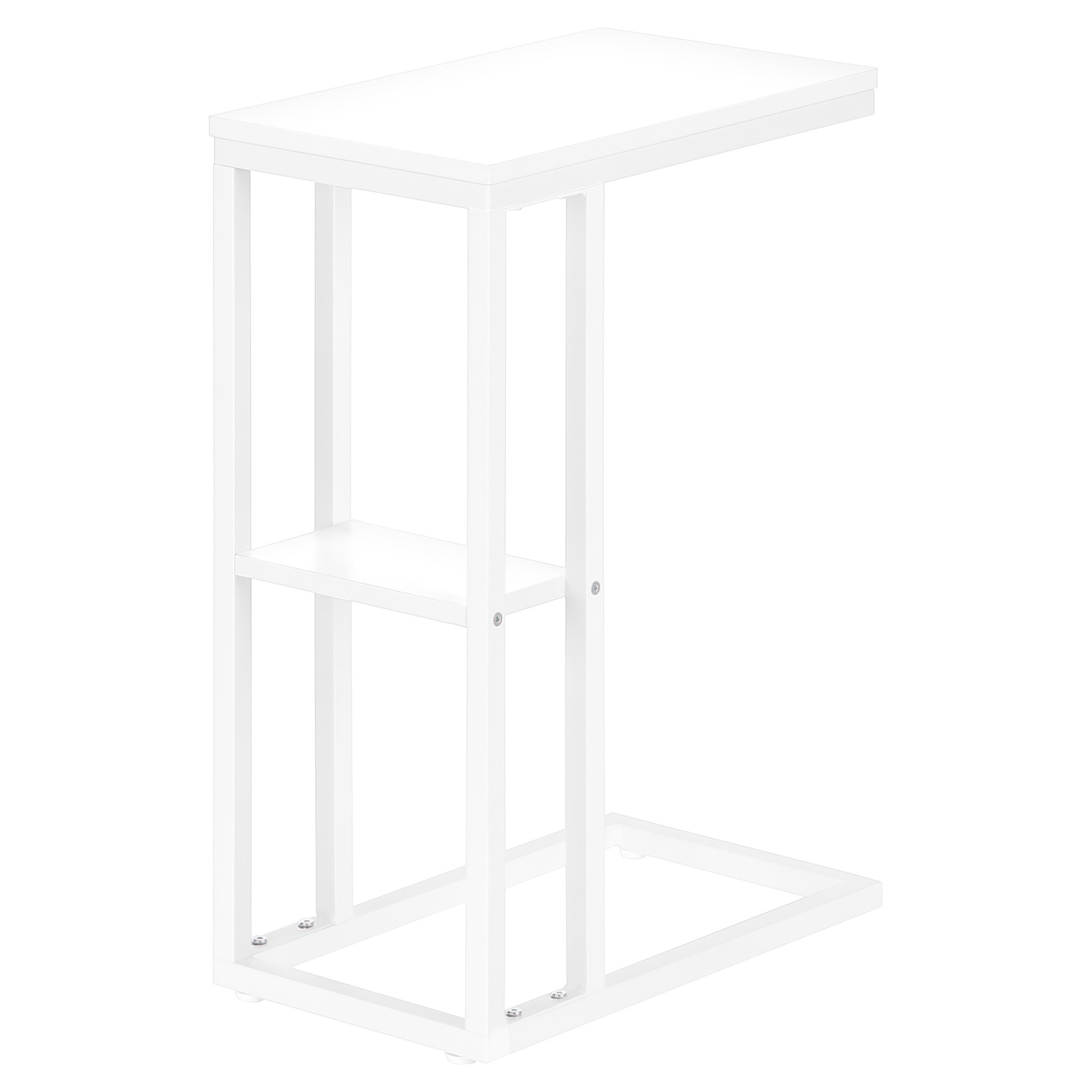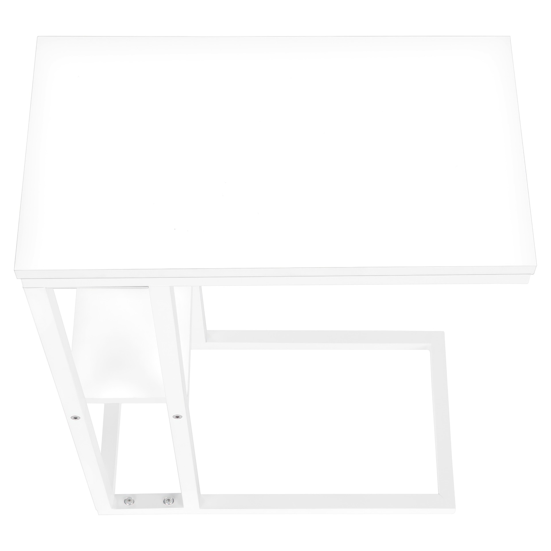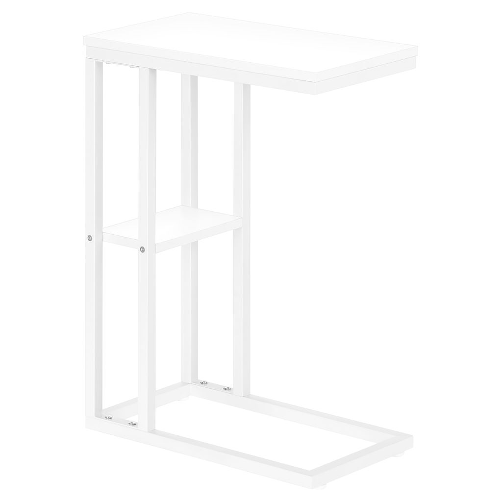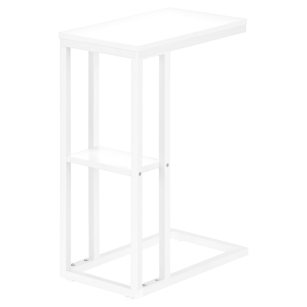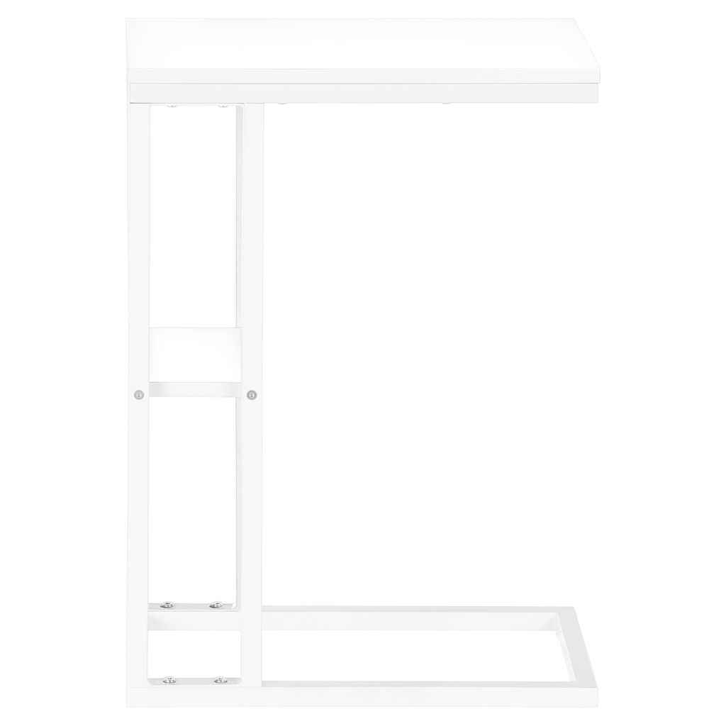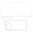 Straight lines and right angles give this C-shaped side table a sleek, modern look. The white rectangular table is supported by a white metal frame. It includes a shelf underneath the table for storing small items. Slide this versatile side table under a sofa or chair to serve snacks or place mobile devices. It can also be used as a side table next to a bed.