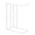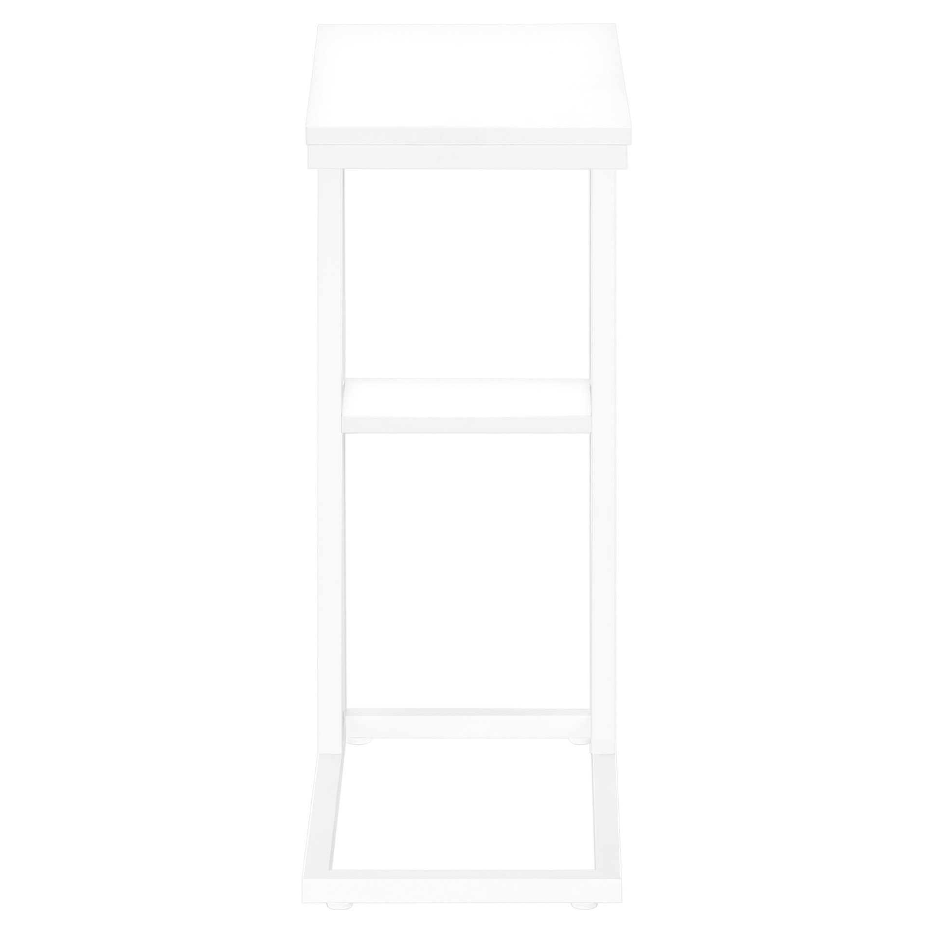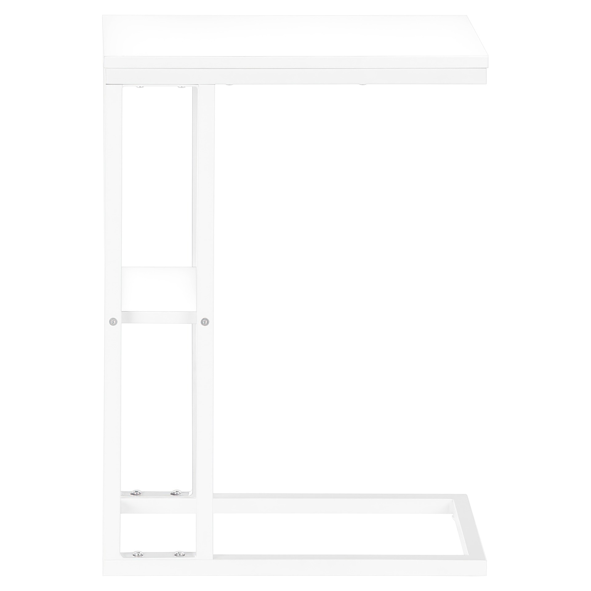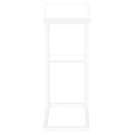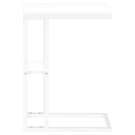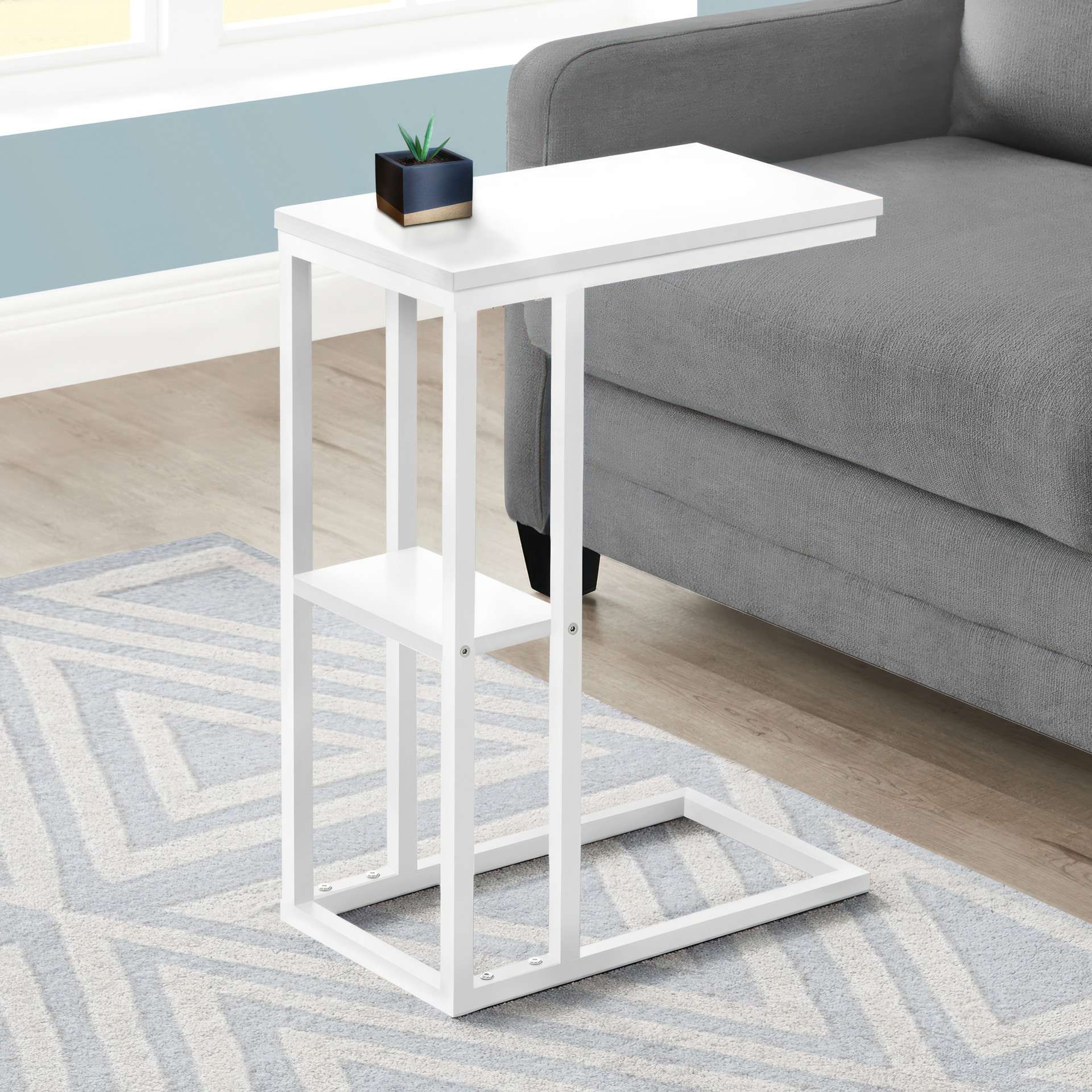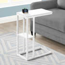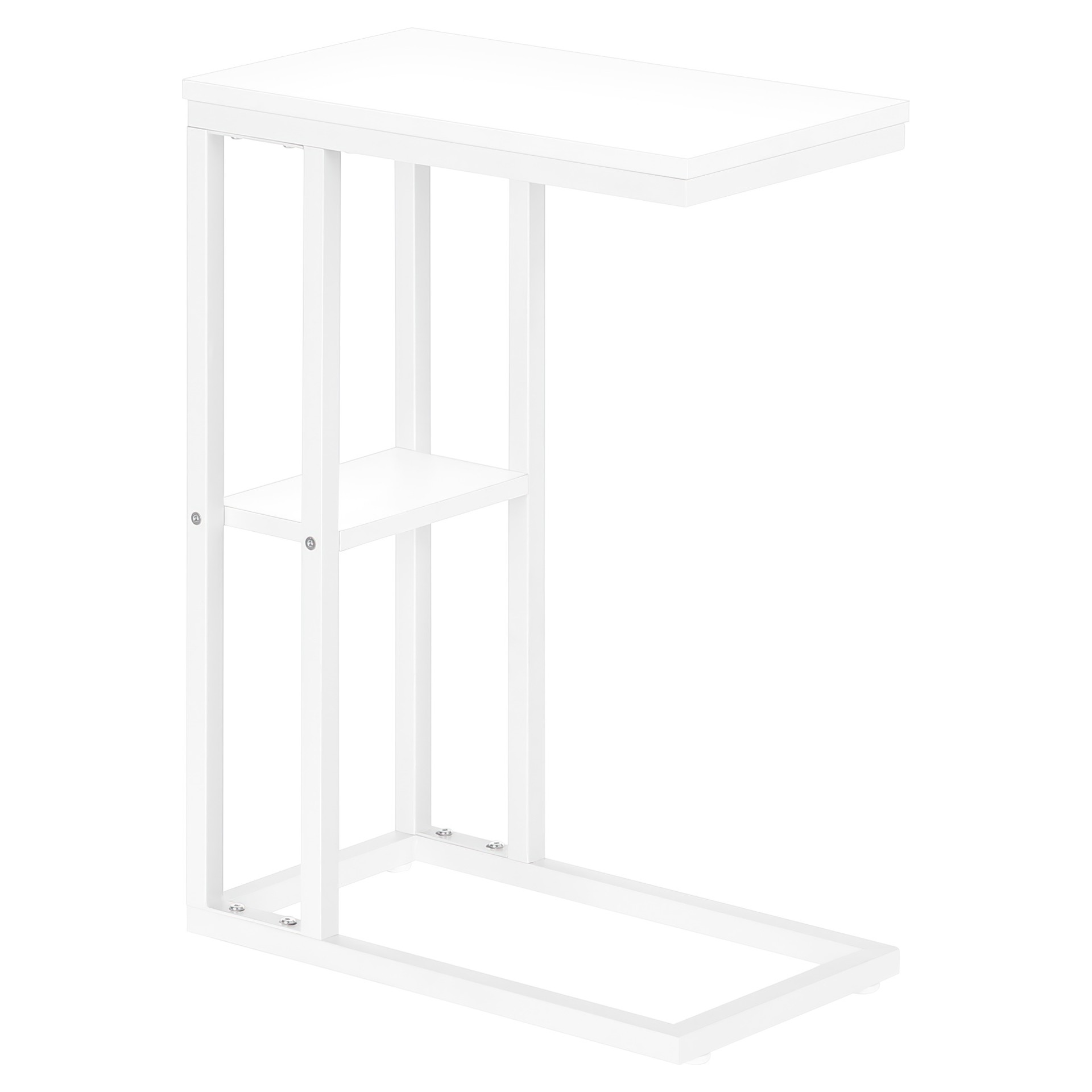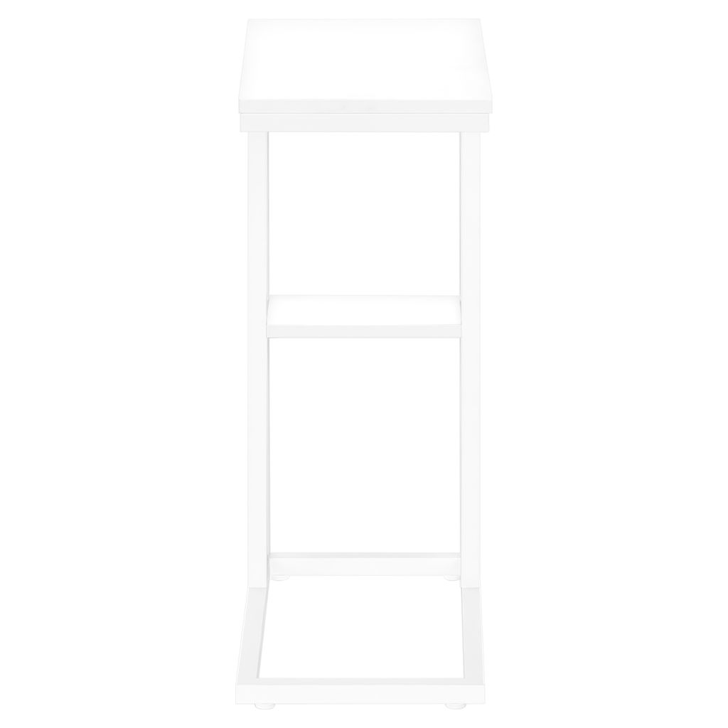 Straight lines and right angles give this C-shaped side table a sleek, modern look. The white rectangular table is supported by a white metal frame. It includes a shelf underneath the table for storing small items. Slide this versatile side table under a sofa or chair to serve snacks or place mobile devices. It can also be used as a side table next to a bed.