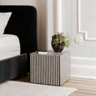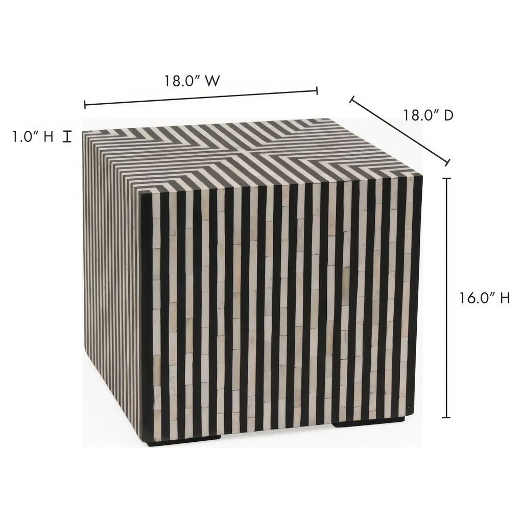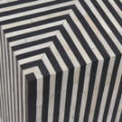 Simplistic and bold, the Terning side table's hypnotic art deco design is an exercise in contrasts. A veneer of ethically sourced white and black camel bone with resin adds a visual statement that contrasts with its simple construction and square shape.