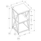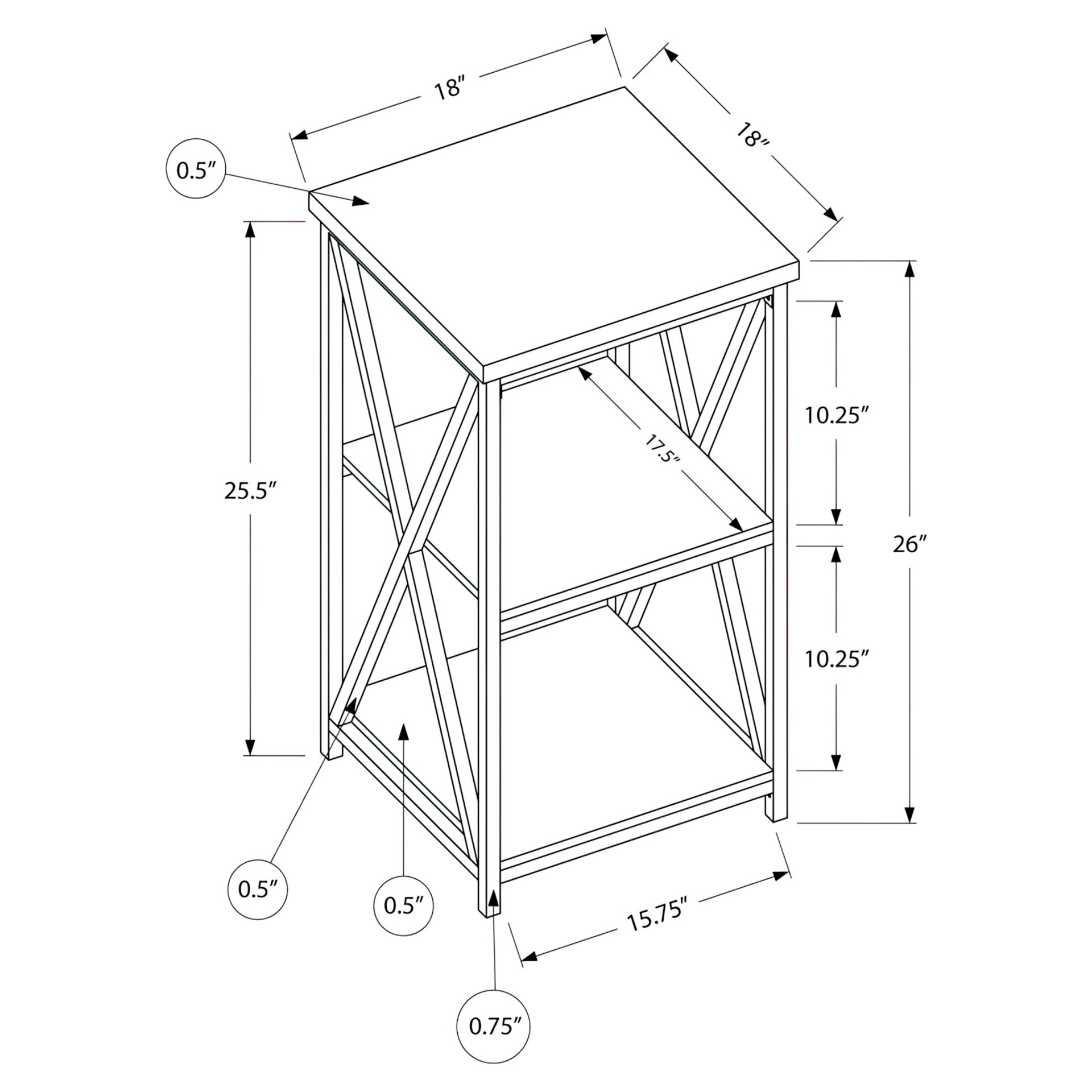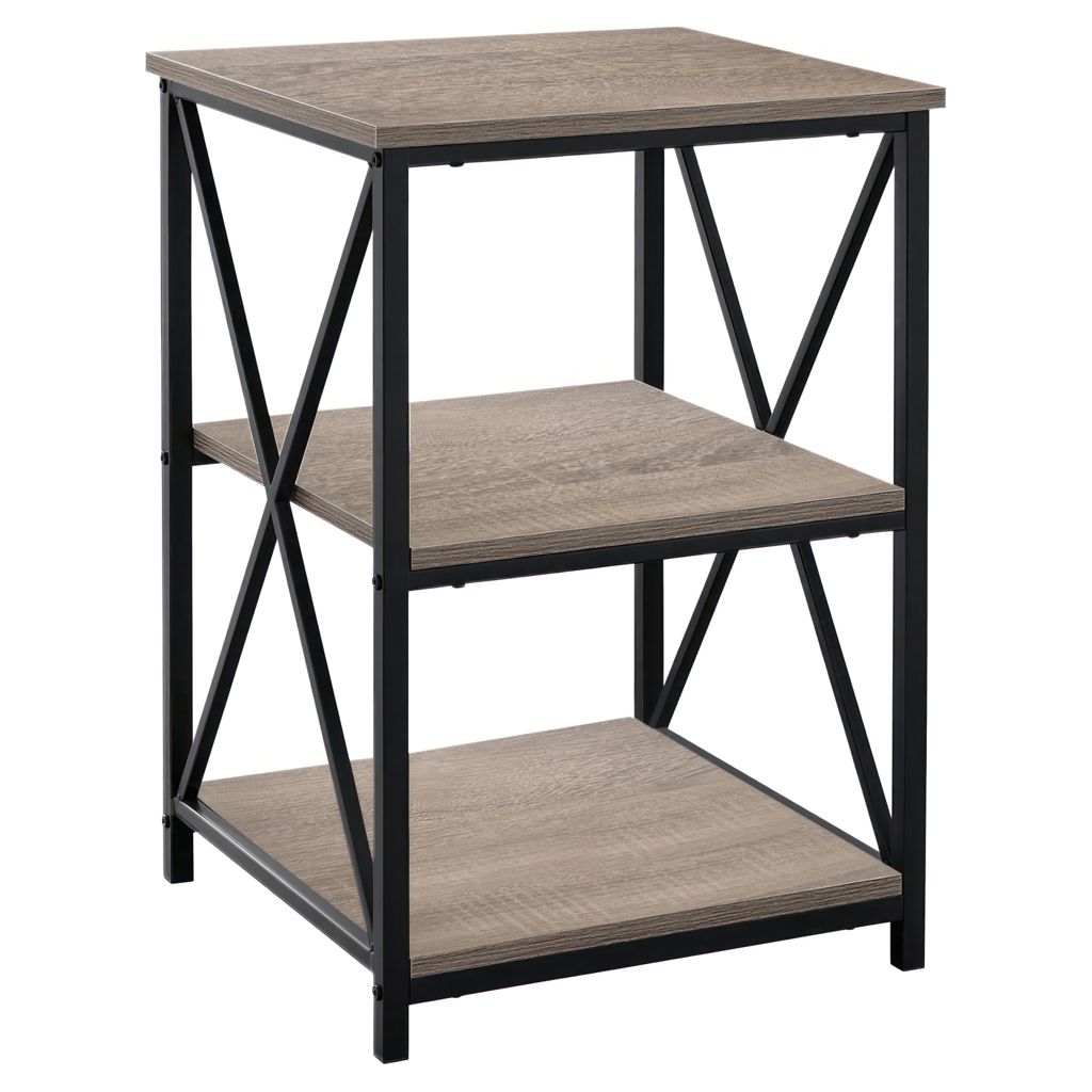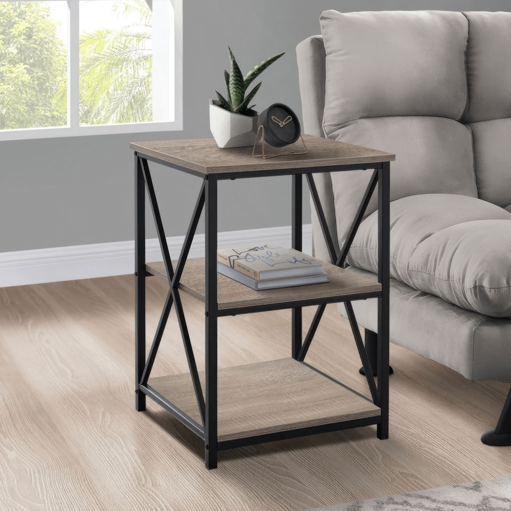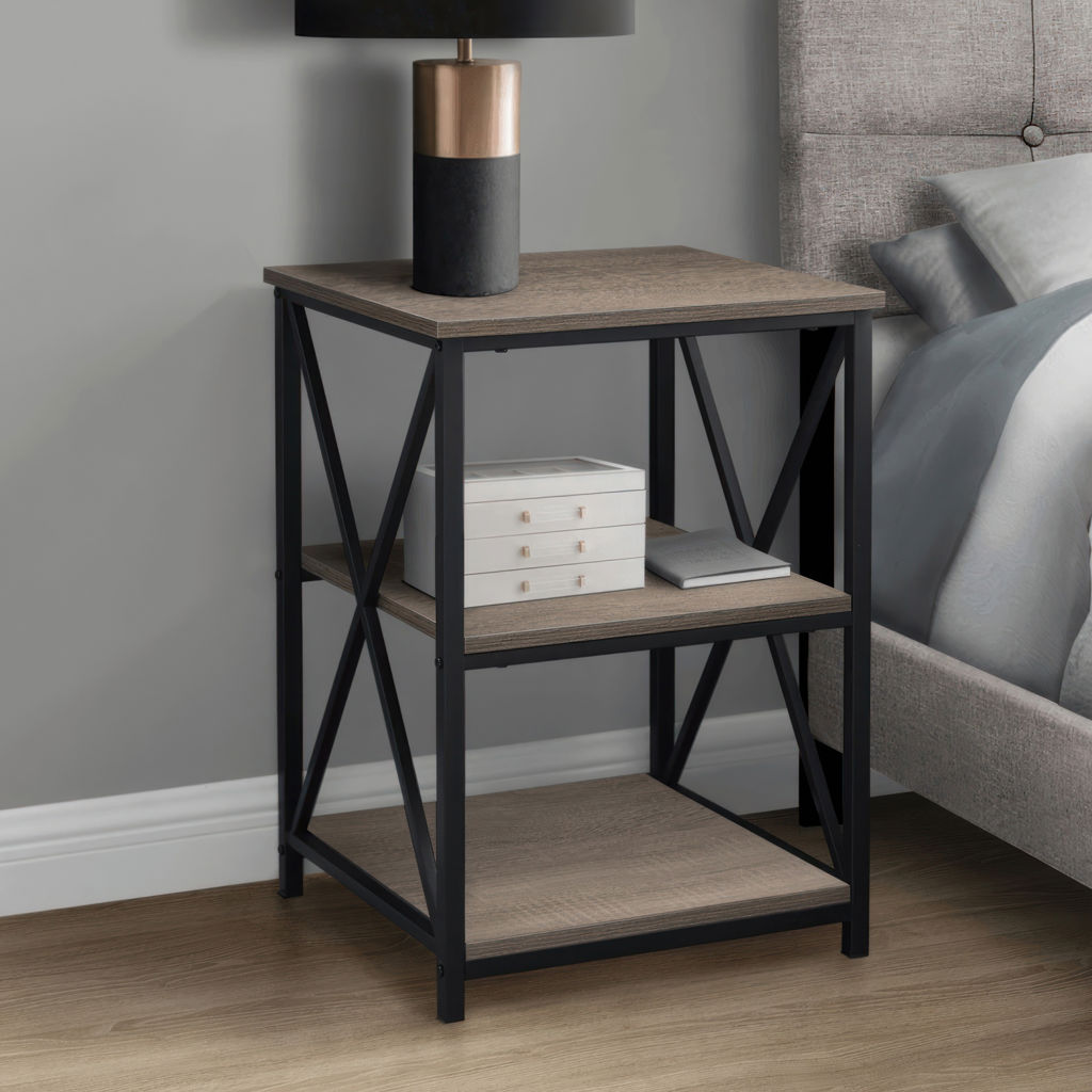 This simple, contemporary style end table with an industrial look is a multi-functional accent piece suitable for any room. The stylish black metal legs with an X design on the two sides, contrasts with the warmth of the dark taupe wood look laminate square tops. The two open bottom shelves offer a convenient storage space for books, magazines, or decorative objects with room on top for a small lamp or a place to set down your drink. Bring it into the bedroom as a sleek and compact nightstand for a clean modern touch.