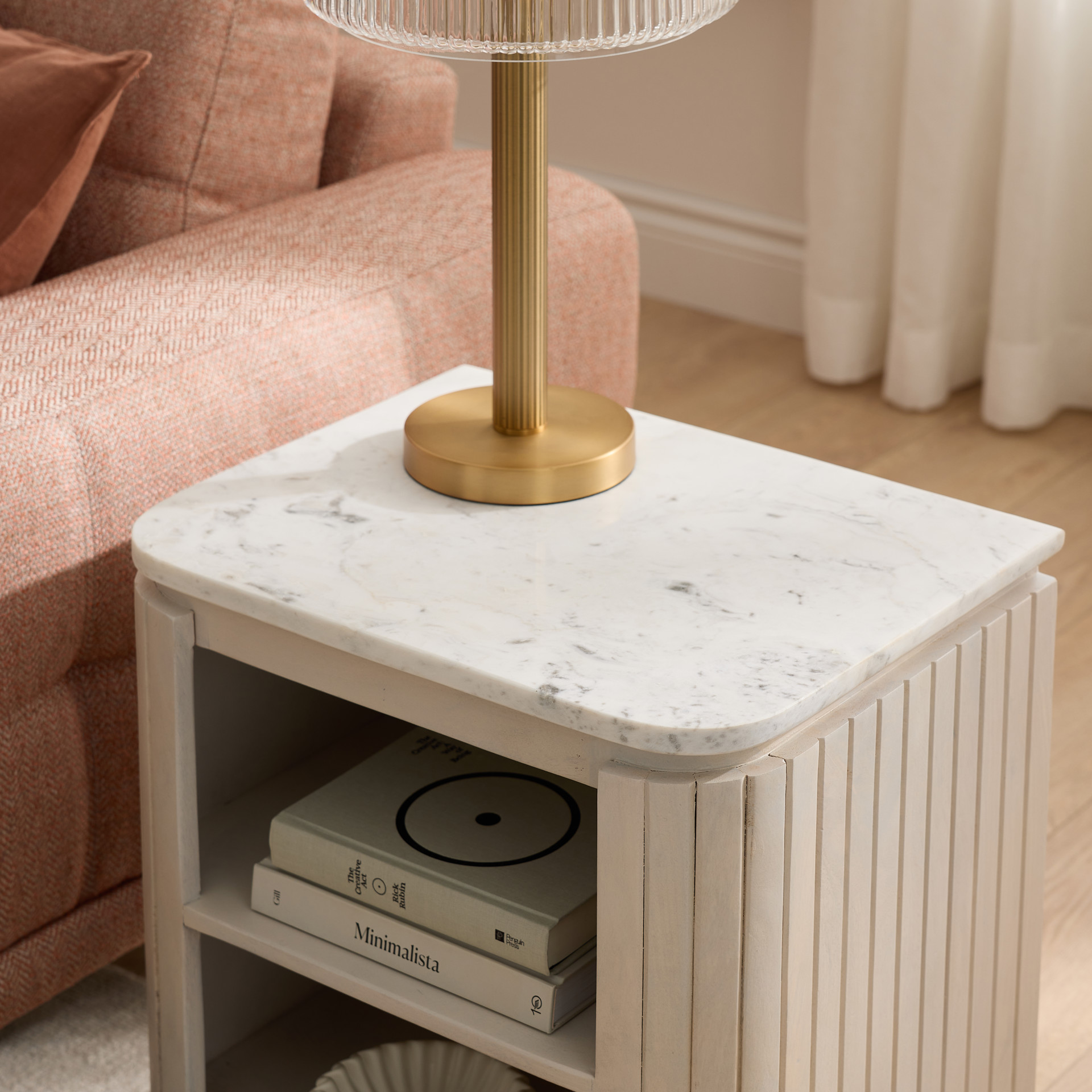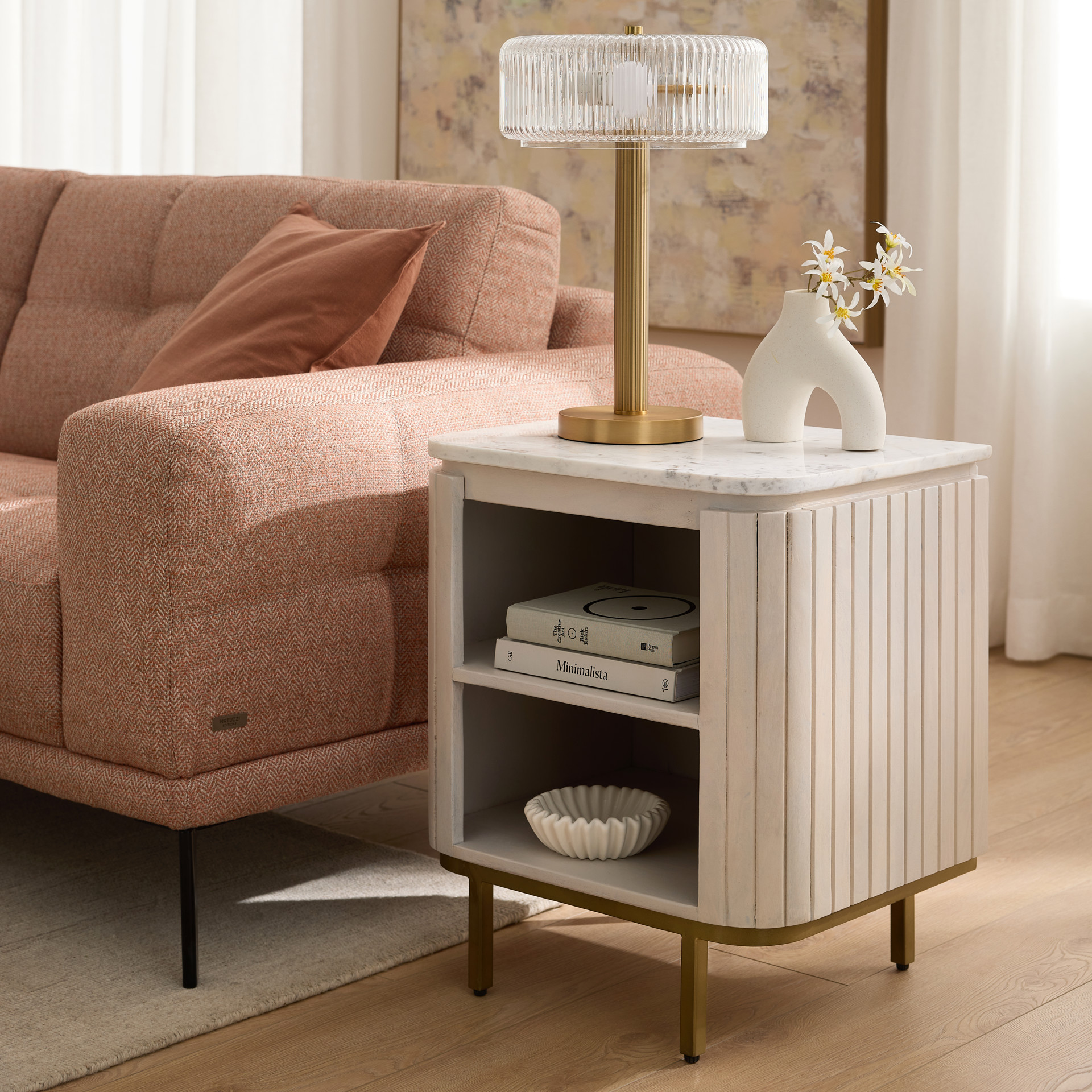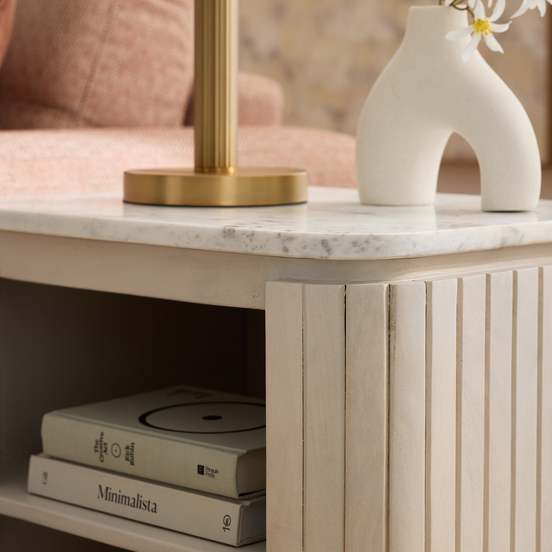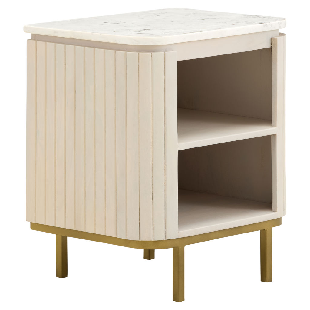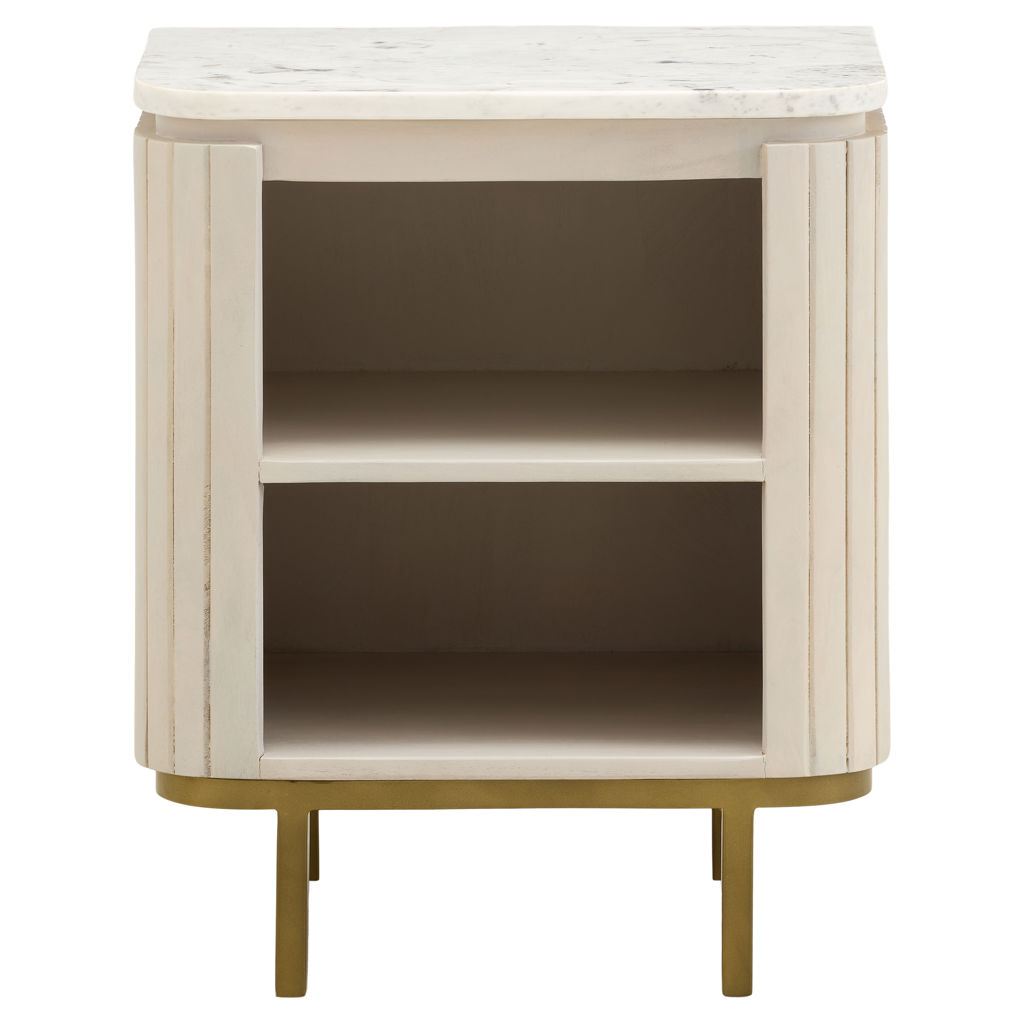 The veined marble top adds a touch of understated luxury, while the acacia frame provides strength and character with its natural variations. Two open shelves offer practical storage space for books, decorative pieces, or everyday essentials.