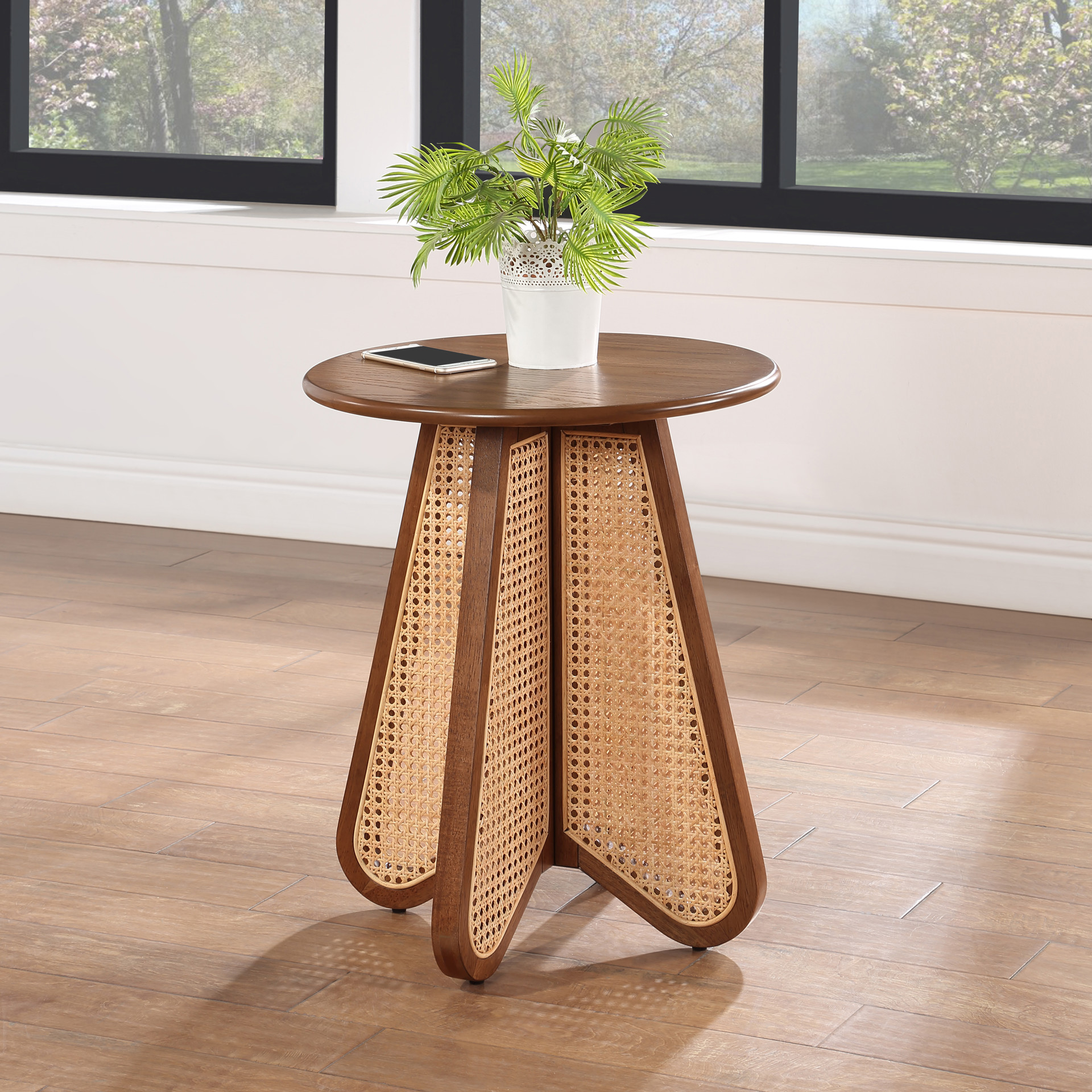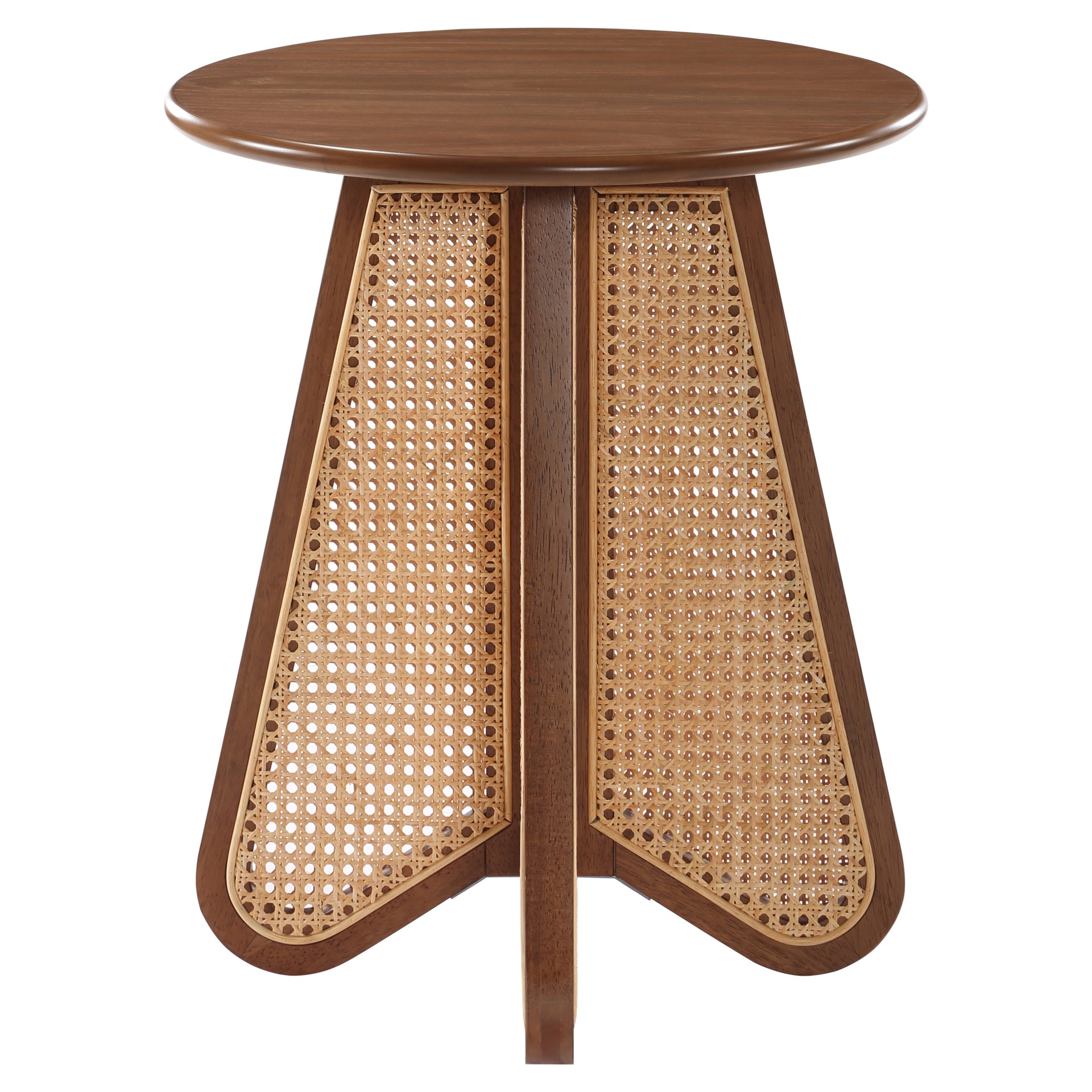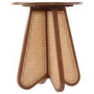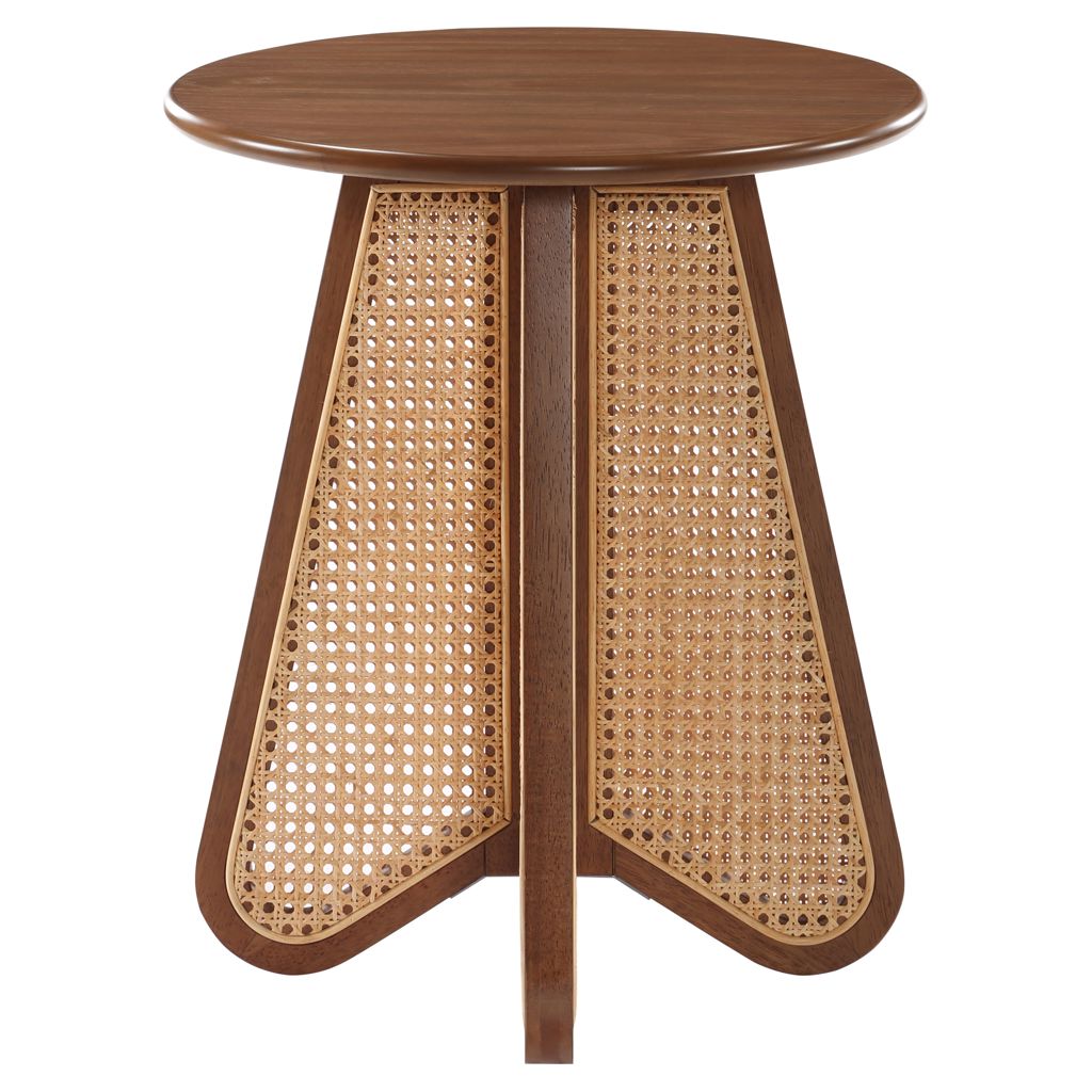 An expansive round oak veneer top gives you room for resting a drink or book or lamp to brighten the night. Construction with rubberwood and wood products gives this Butterfly table a resilient design, while its natural cane bottom adds a striking visual and instantly draws the eye.