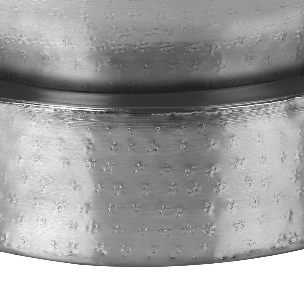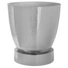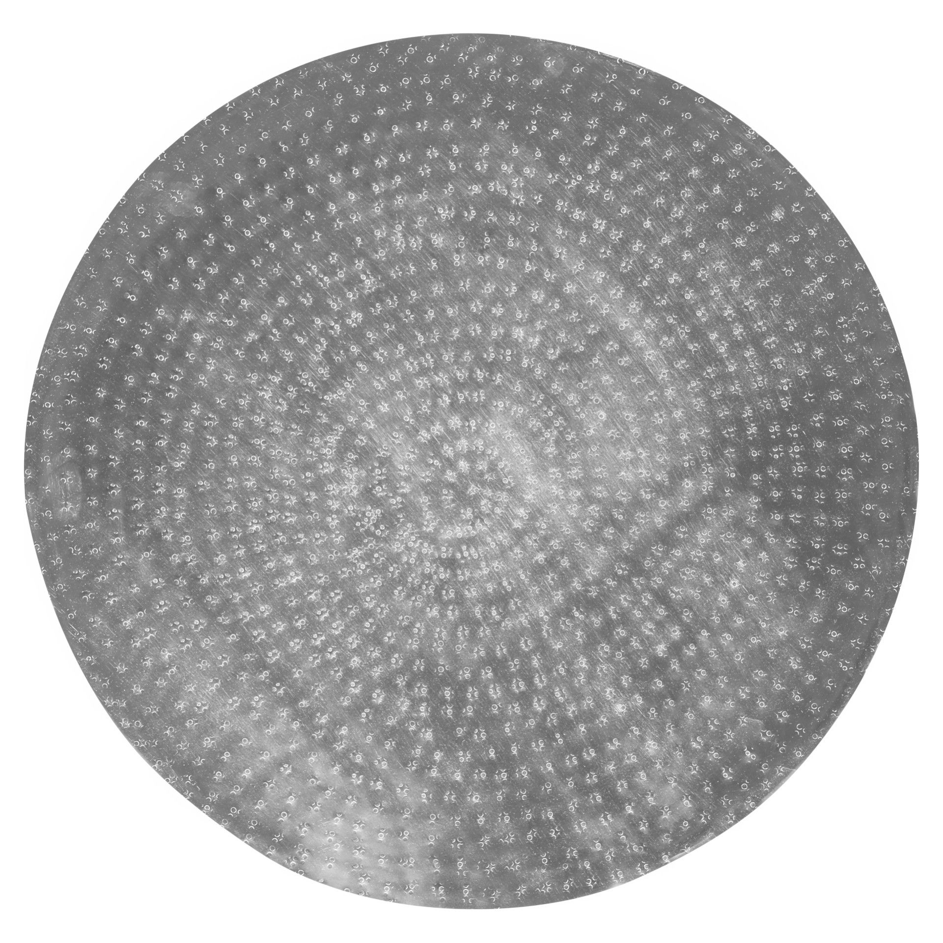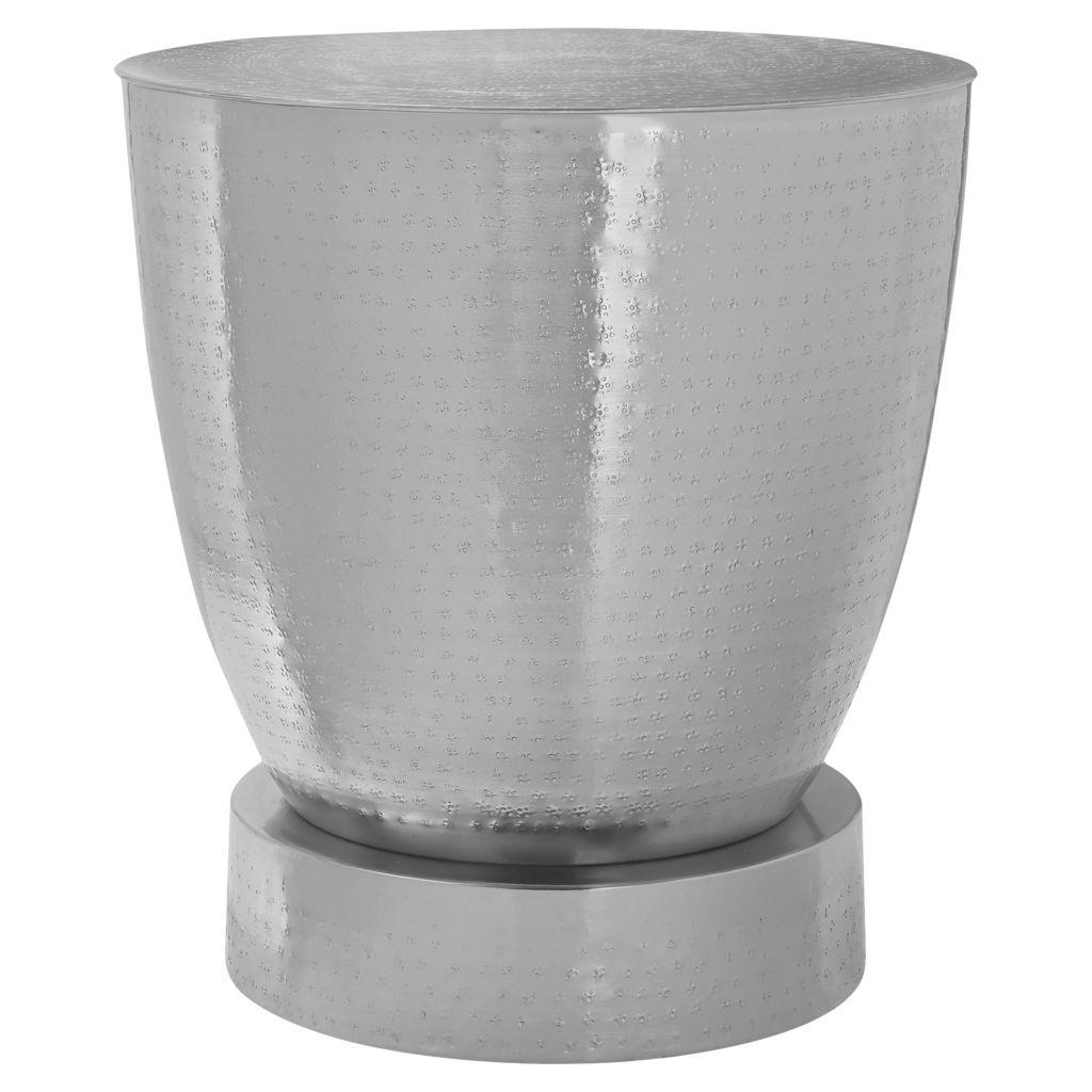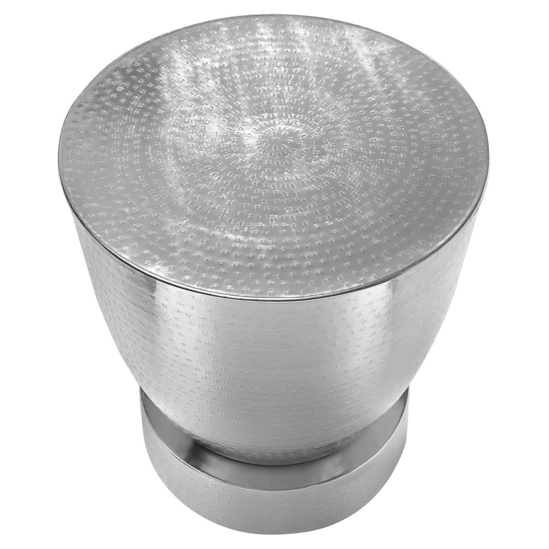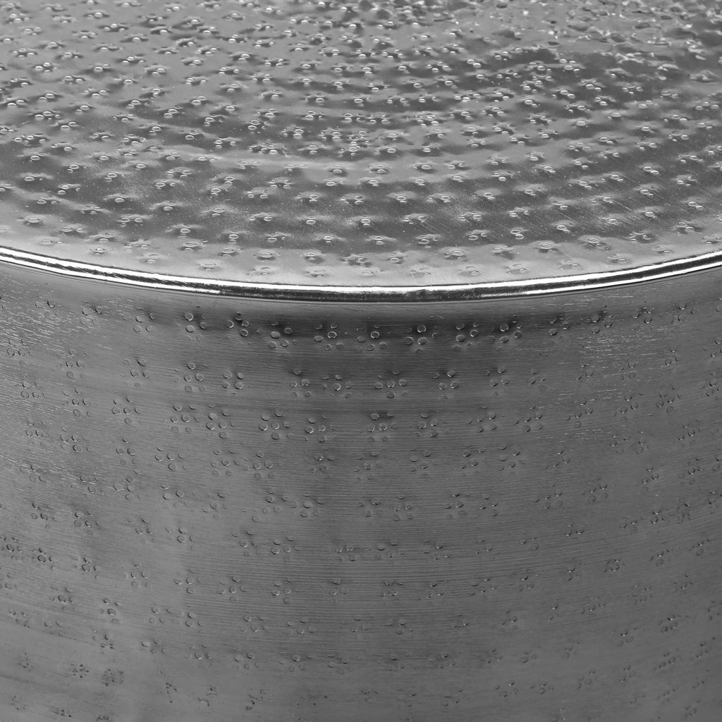 Add some dazzle and fashionable style to a room with this unique 22" high, drum shaped accent table on a round metal base. The chrome metal finish with a hammered pattern on all sides captures a boho-chic feel in a classic style.