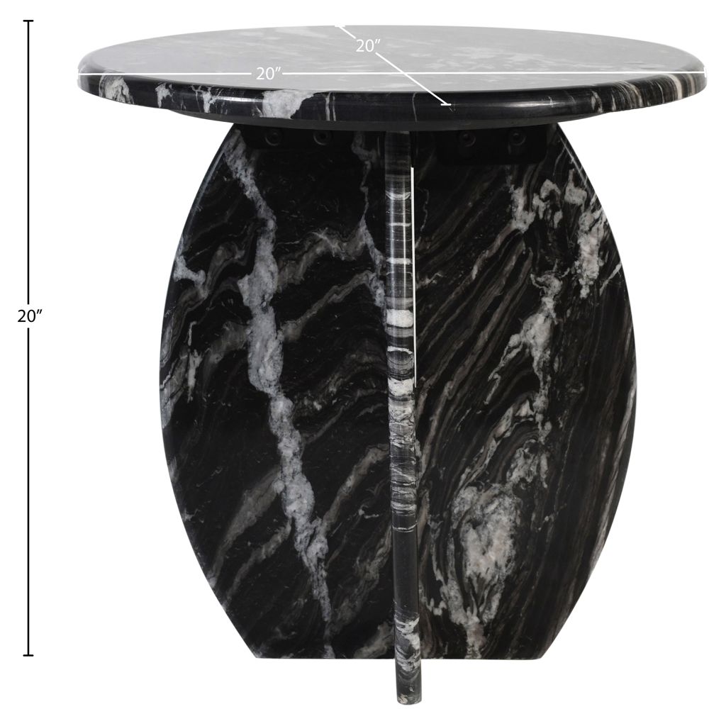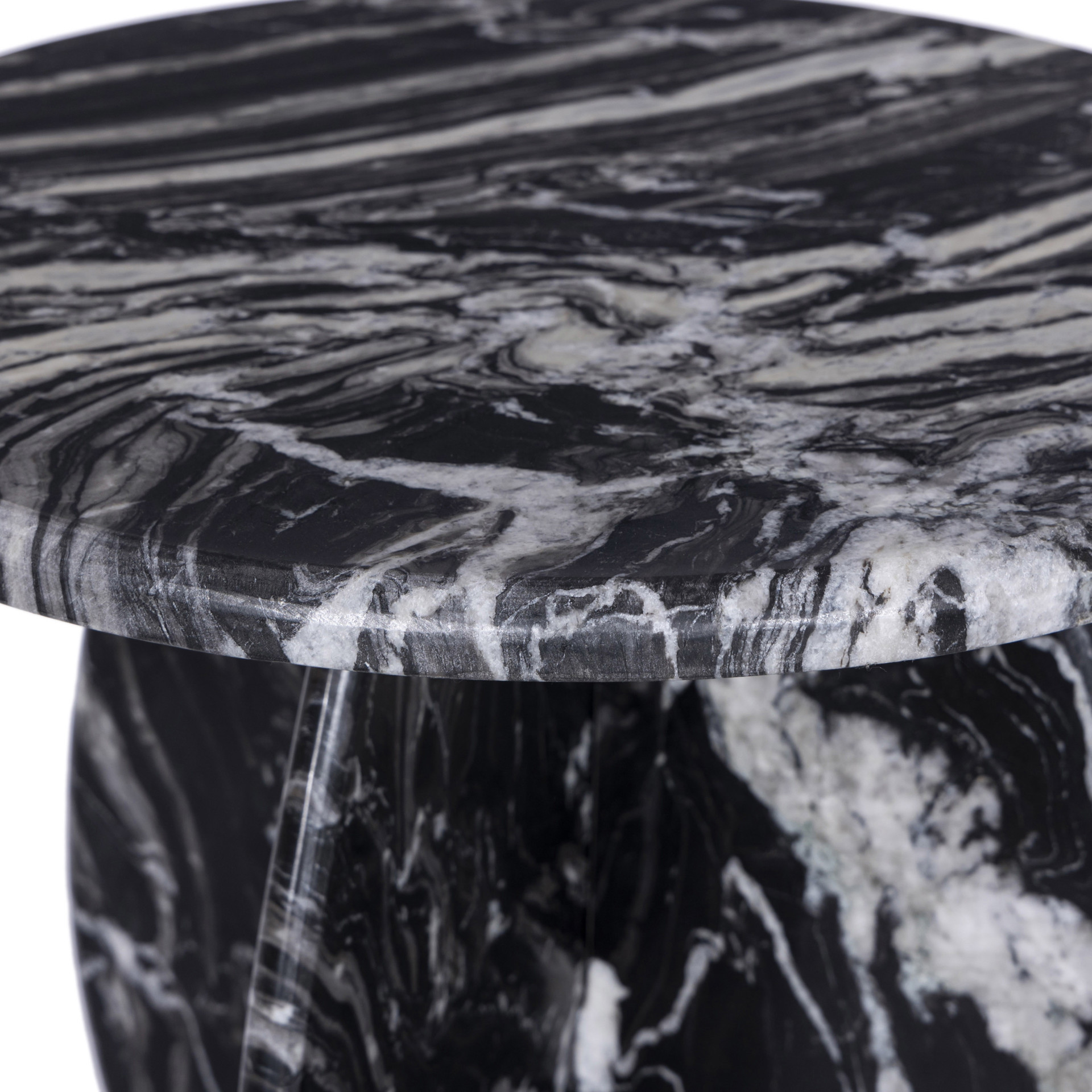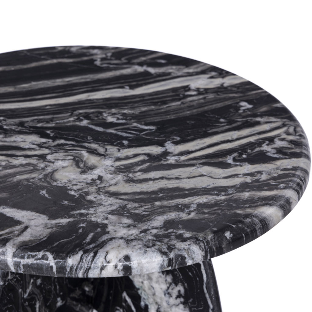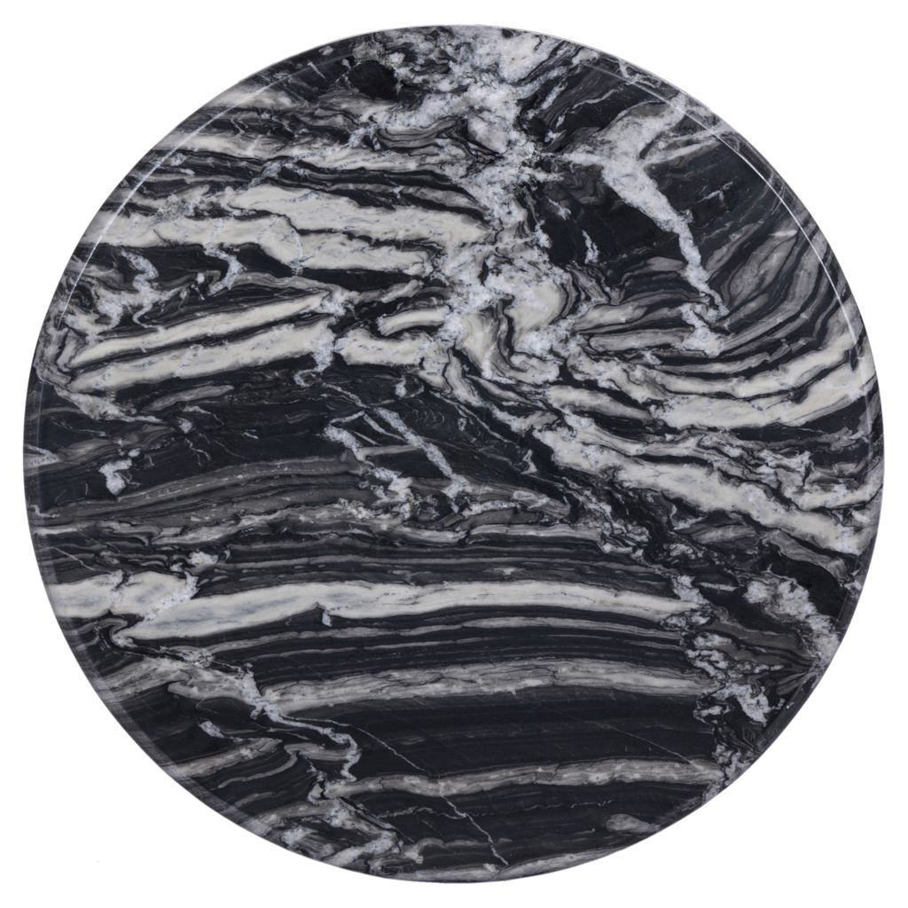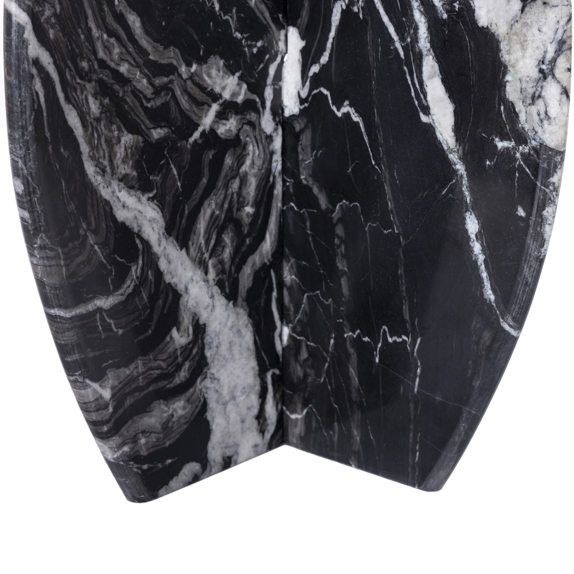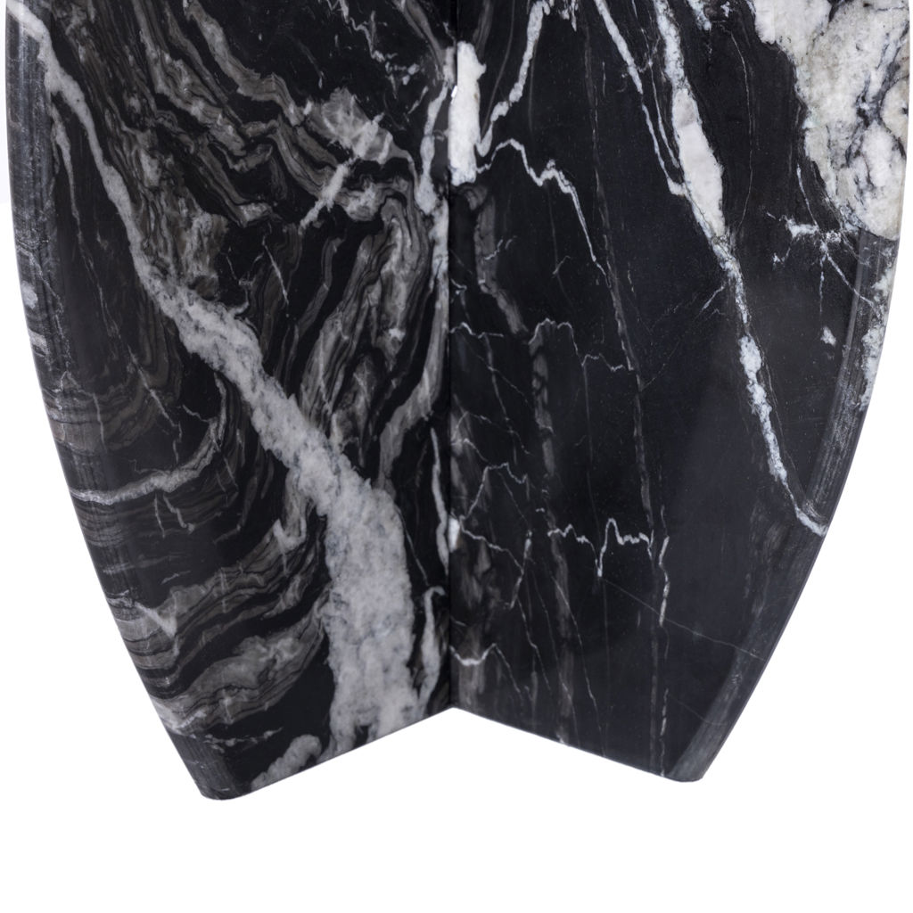 This table oozes sophistication from its wavy black marble with light grey veining construction to its uniquely shaped base.