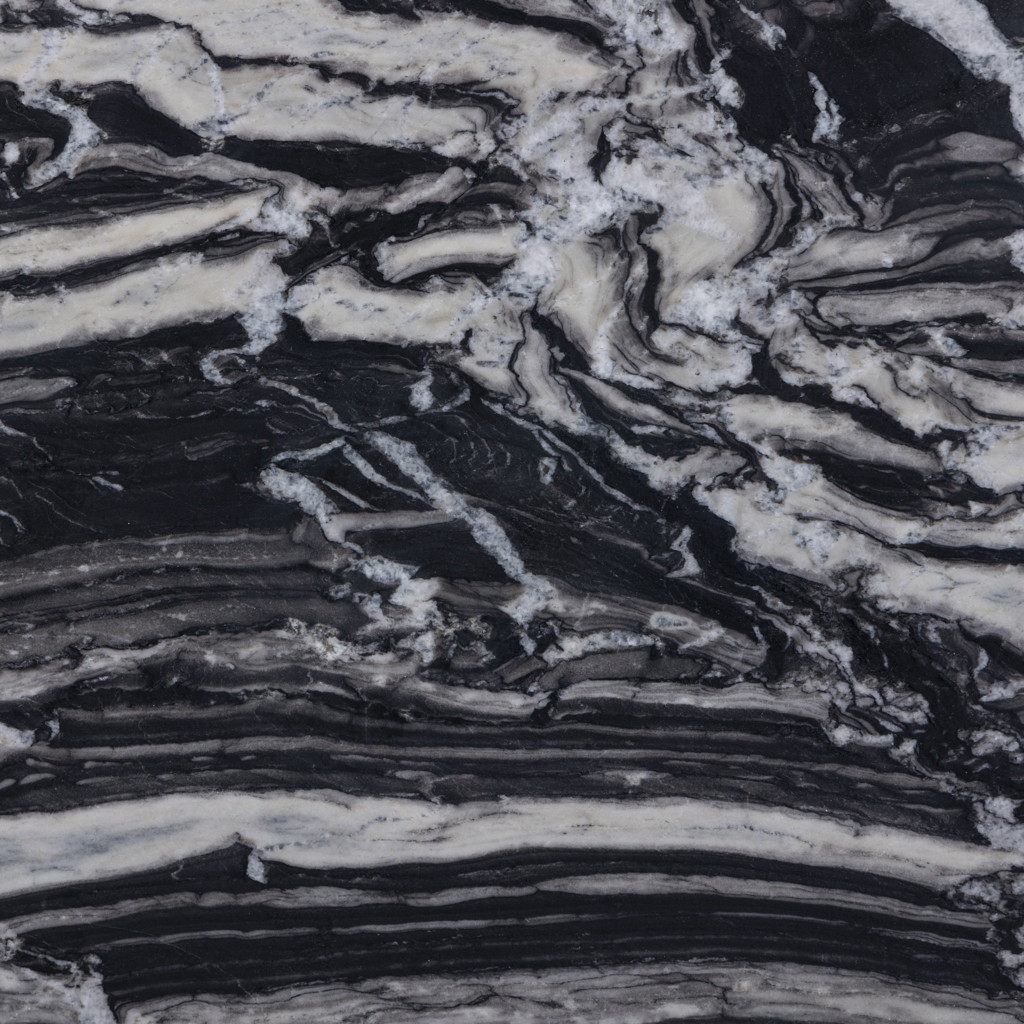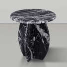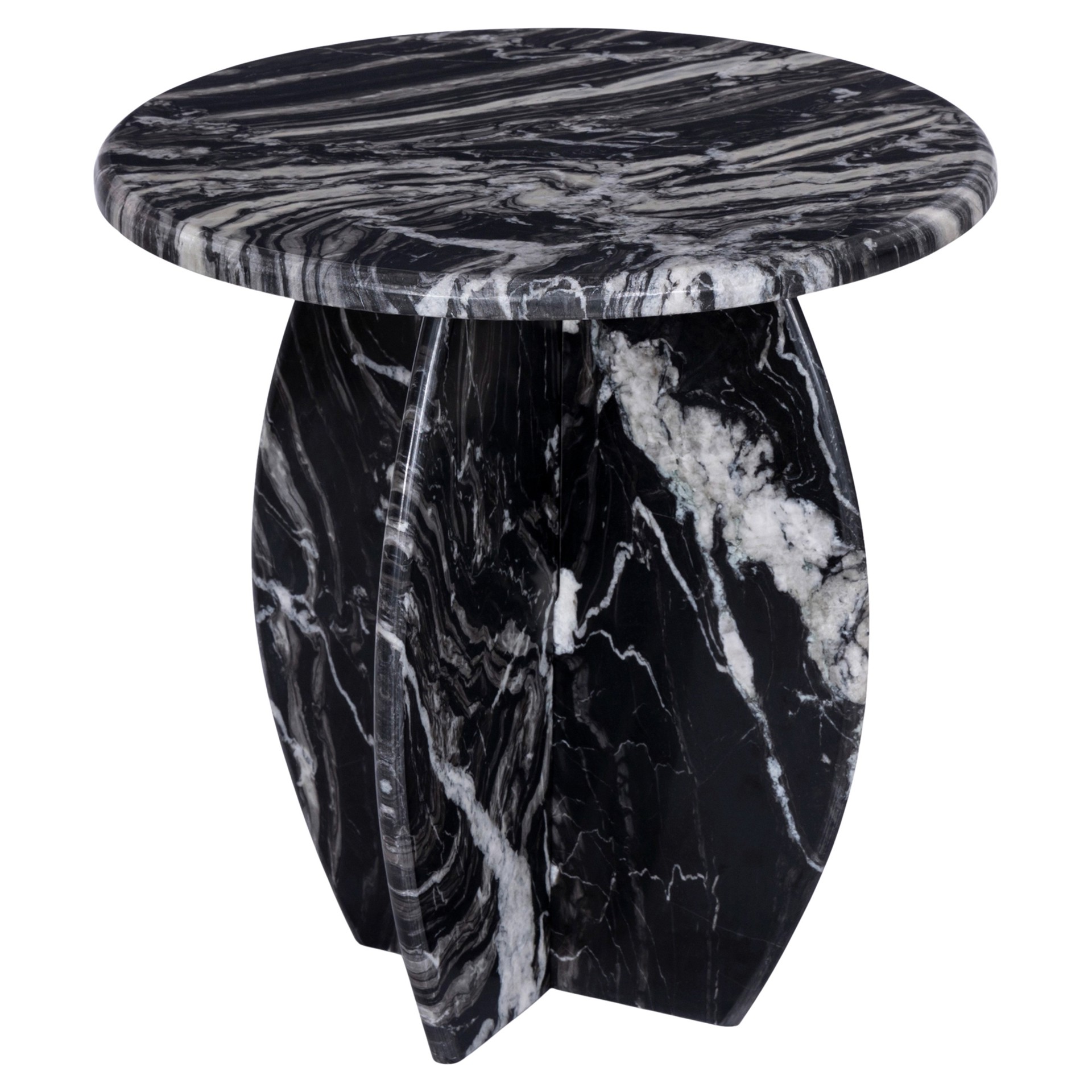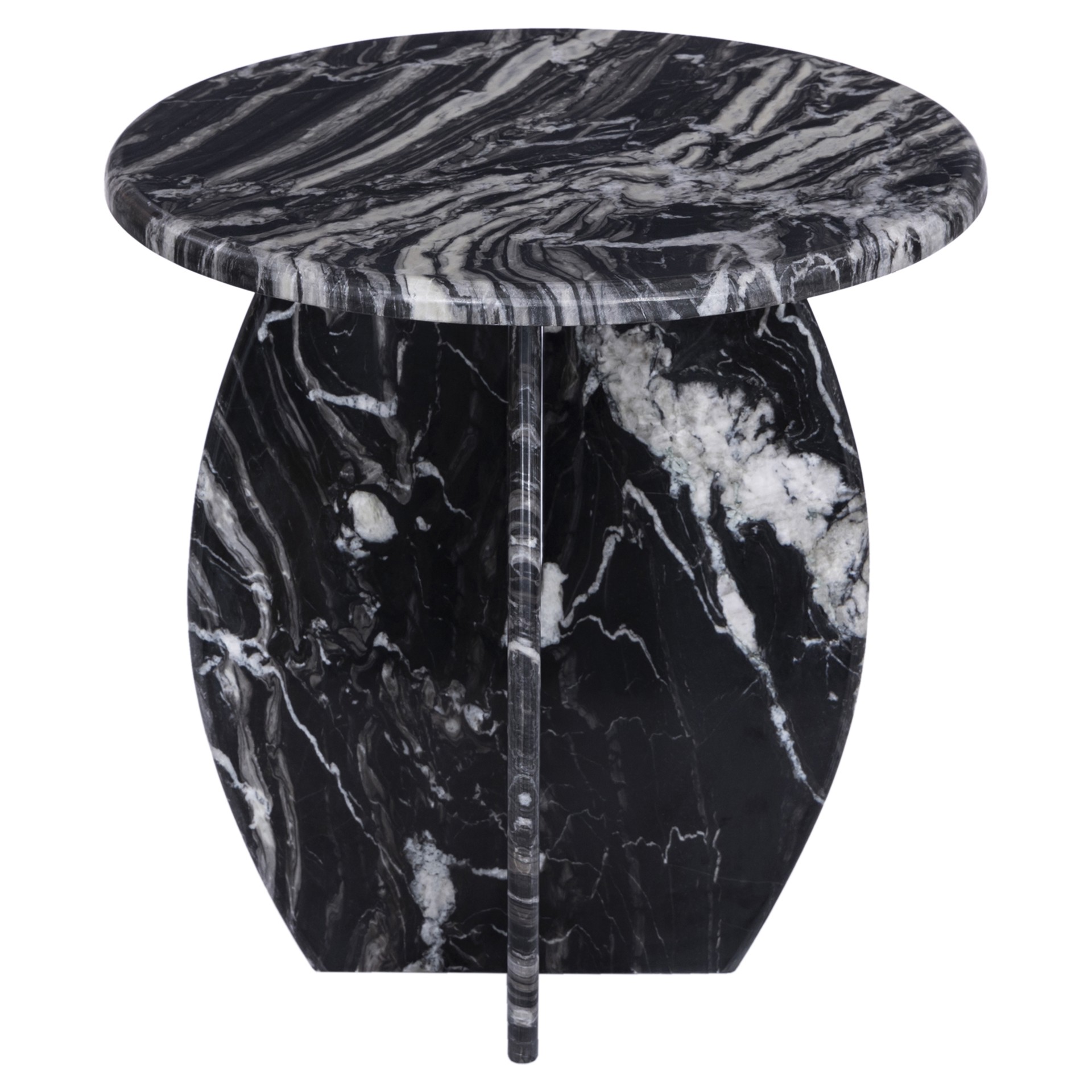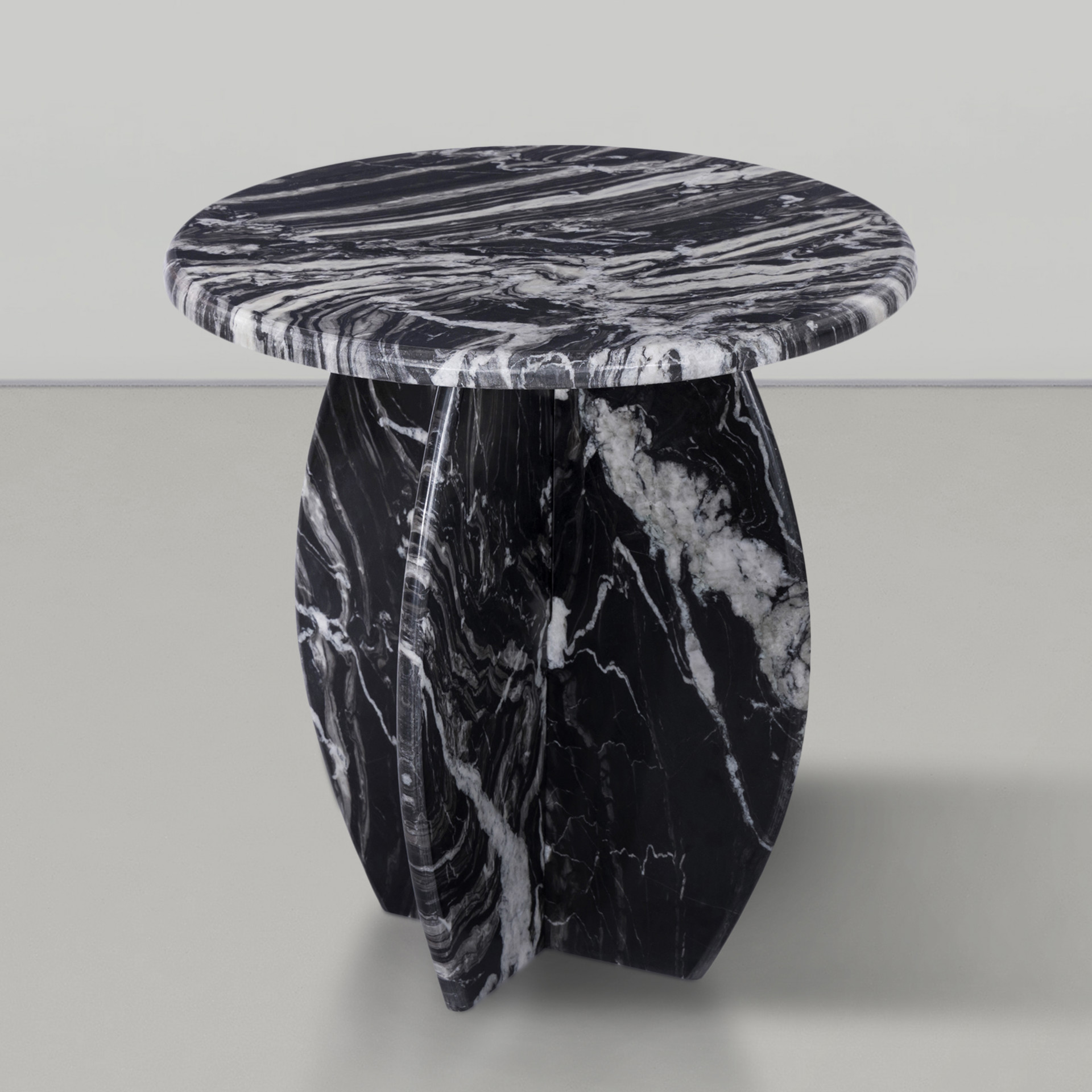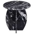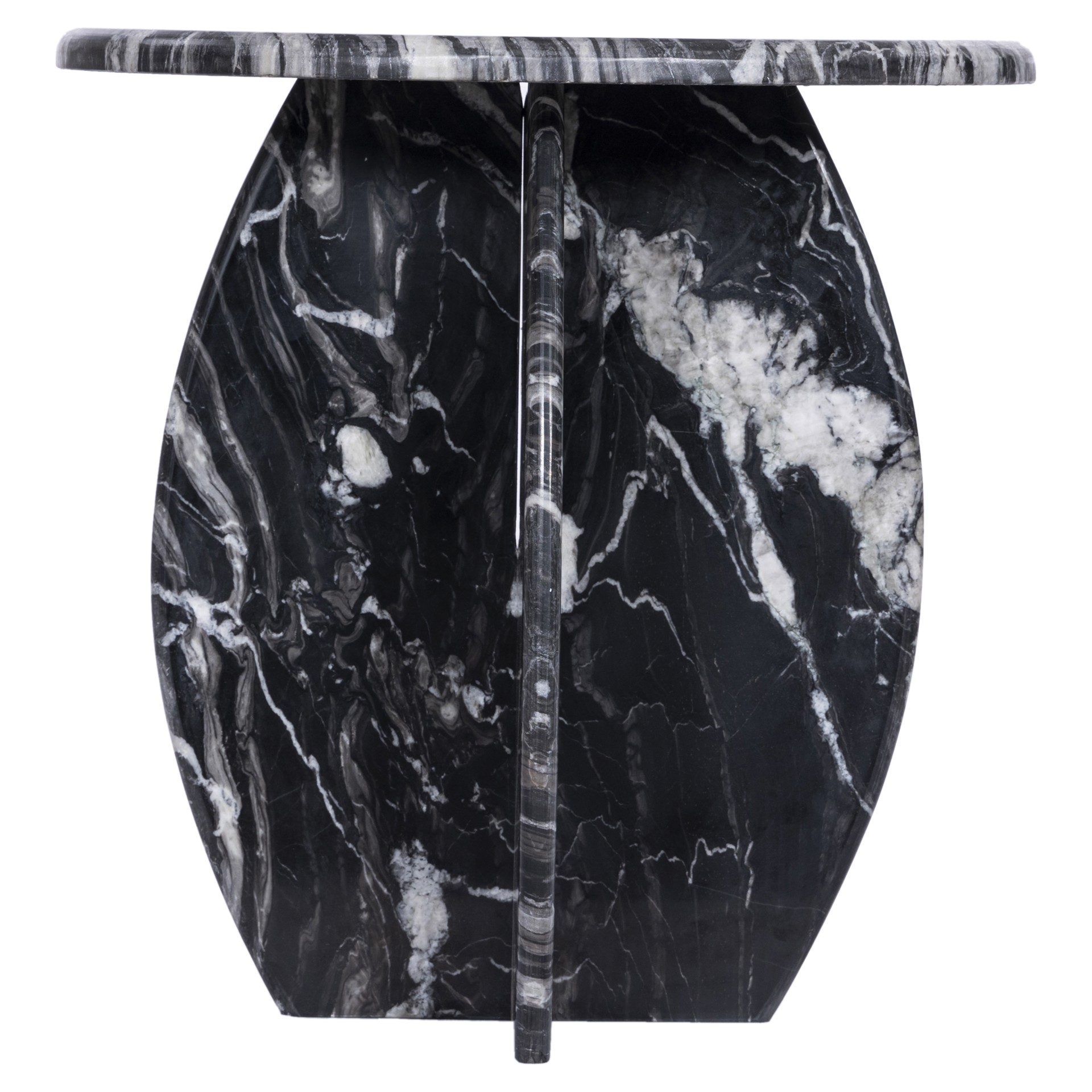 This table oozes sophistication from its wavy black marble with light grey veining construction to its uniquely shaped base.