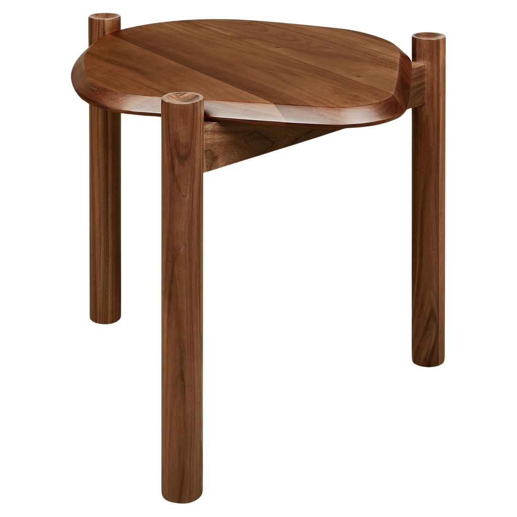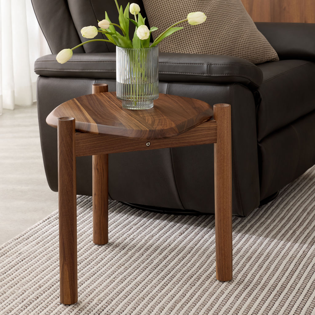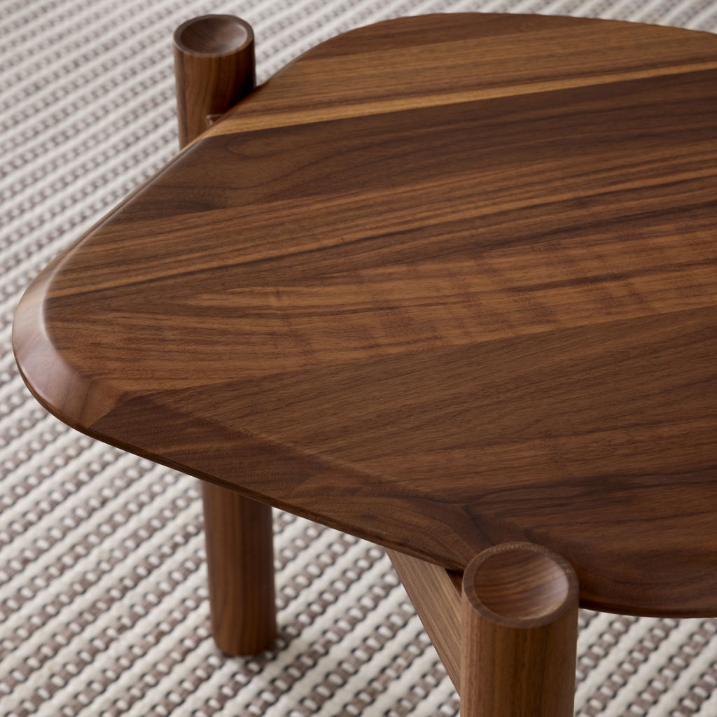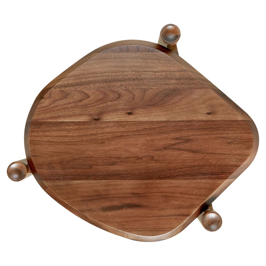 The Monarch End Table juxtaposes organic shapes and natural wood grain with precision craftsmanship and sculptural details.