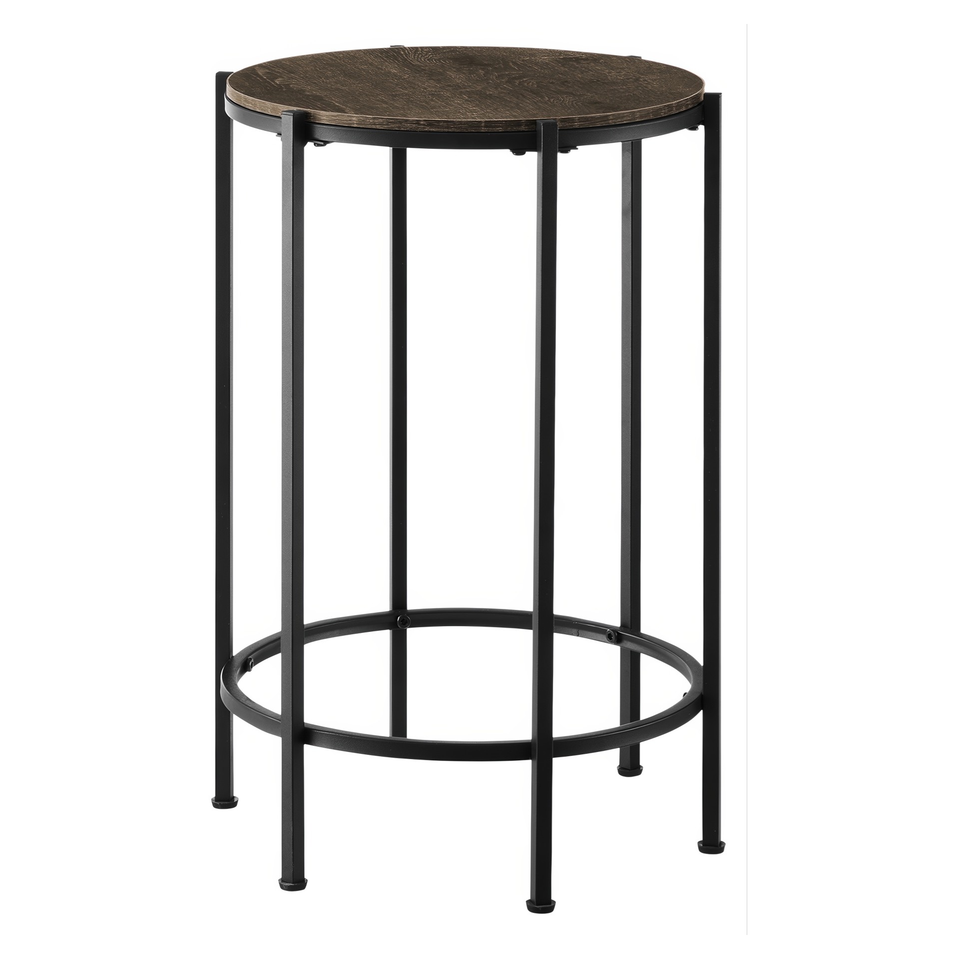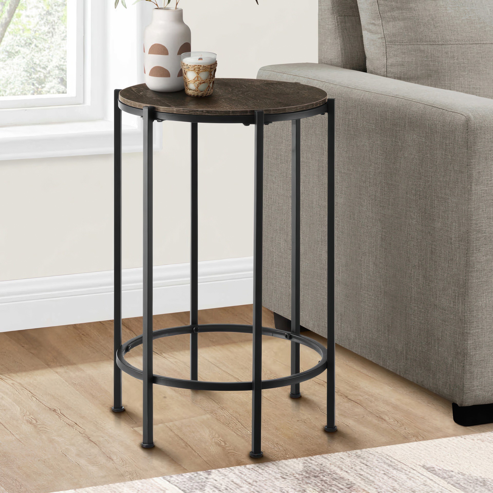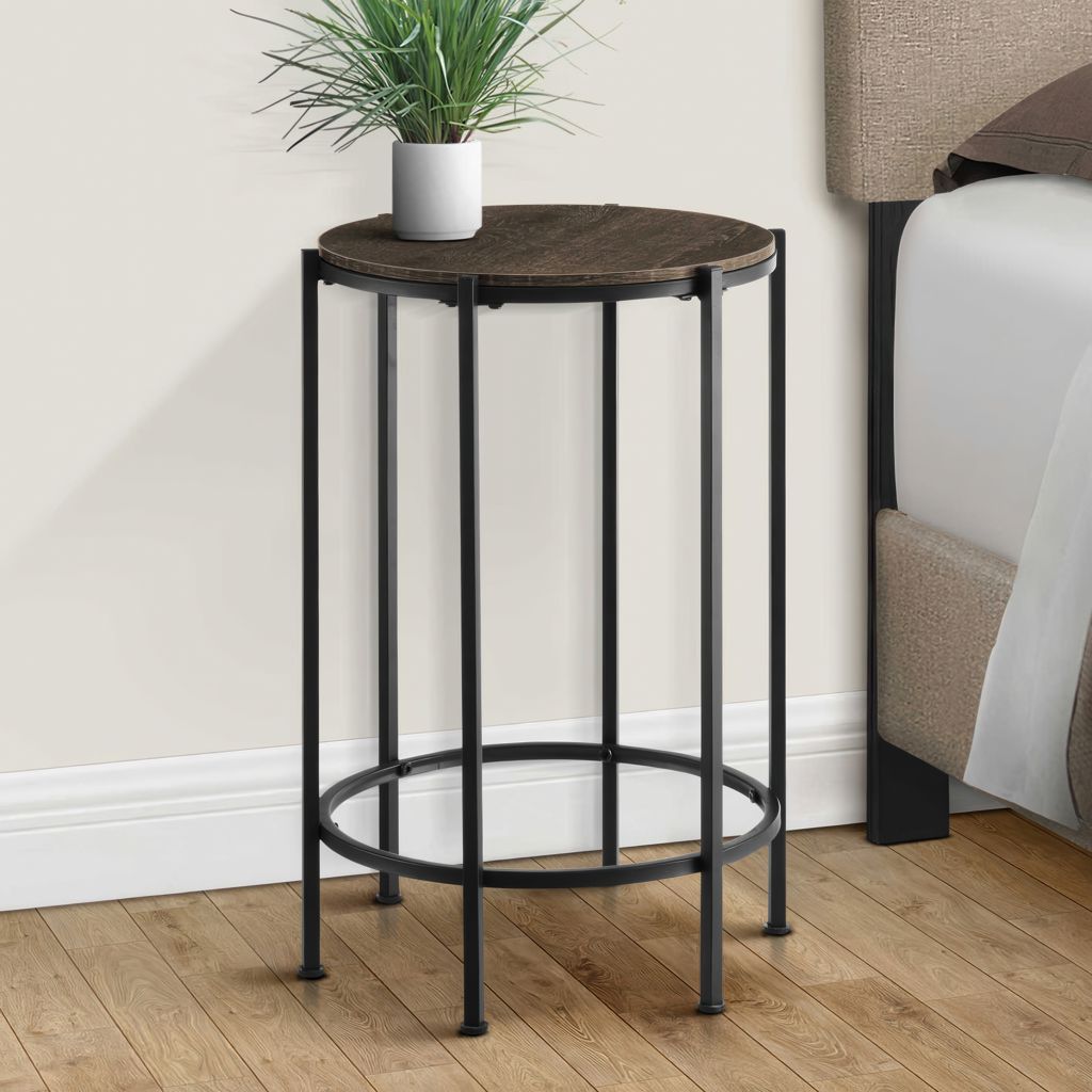 The perfect combination of style and functionality, this sleek and modern accent table brings fashionable style with a chic, dark oak laminate finish on the round table top and black metal legs.