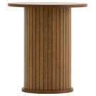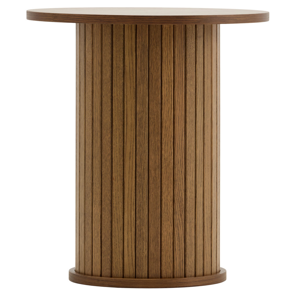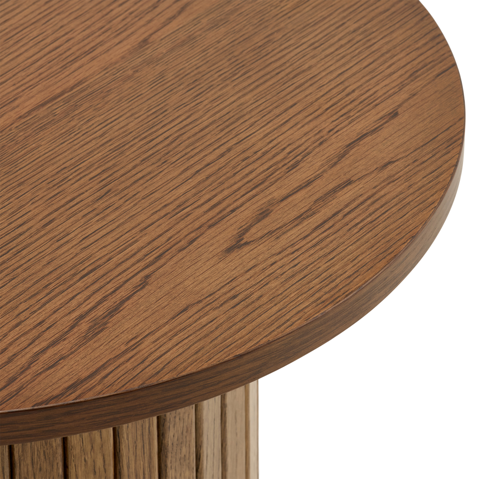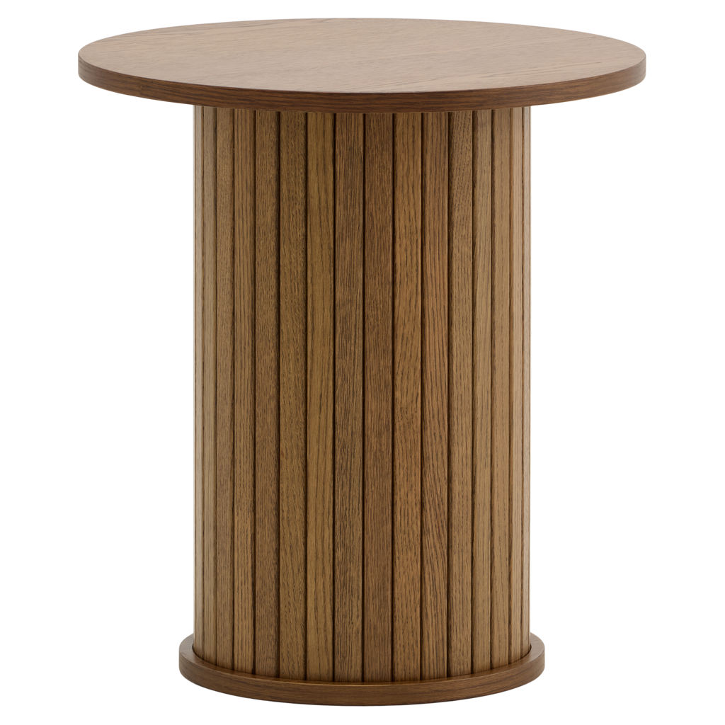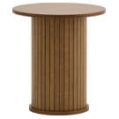 Add an elegant and functional touch to your home with this oak veneer side table. Compact and refined, it stands out with its cylindrical design featuring vertical grooves and a round top in a natural finish.