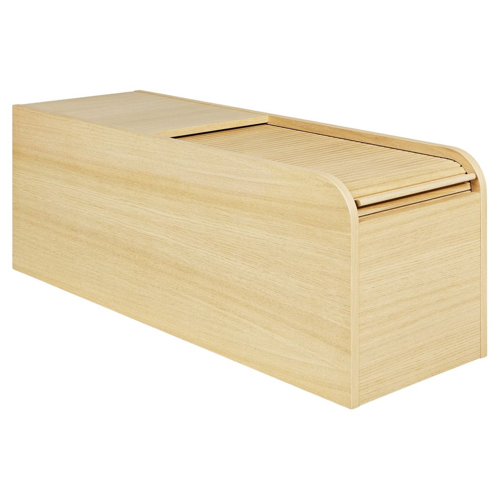 The tambour door, which opens smoothly into the back of the storage box, proves that beautiful form follows function, displaying a simplicity of design engineering without the use of hardware and fasteners.