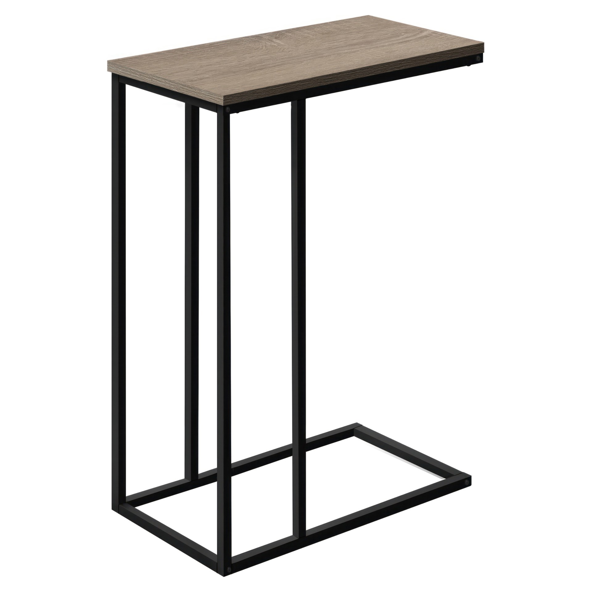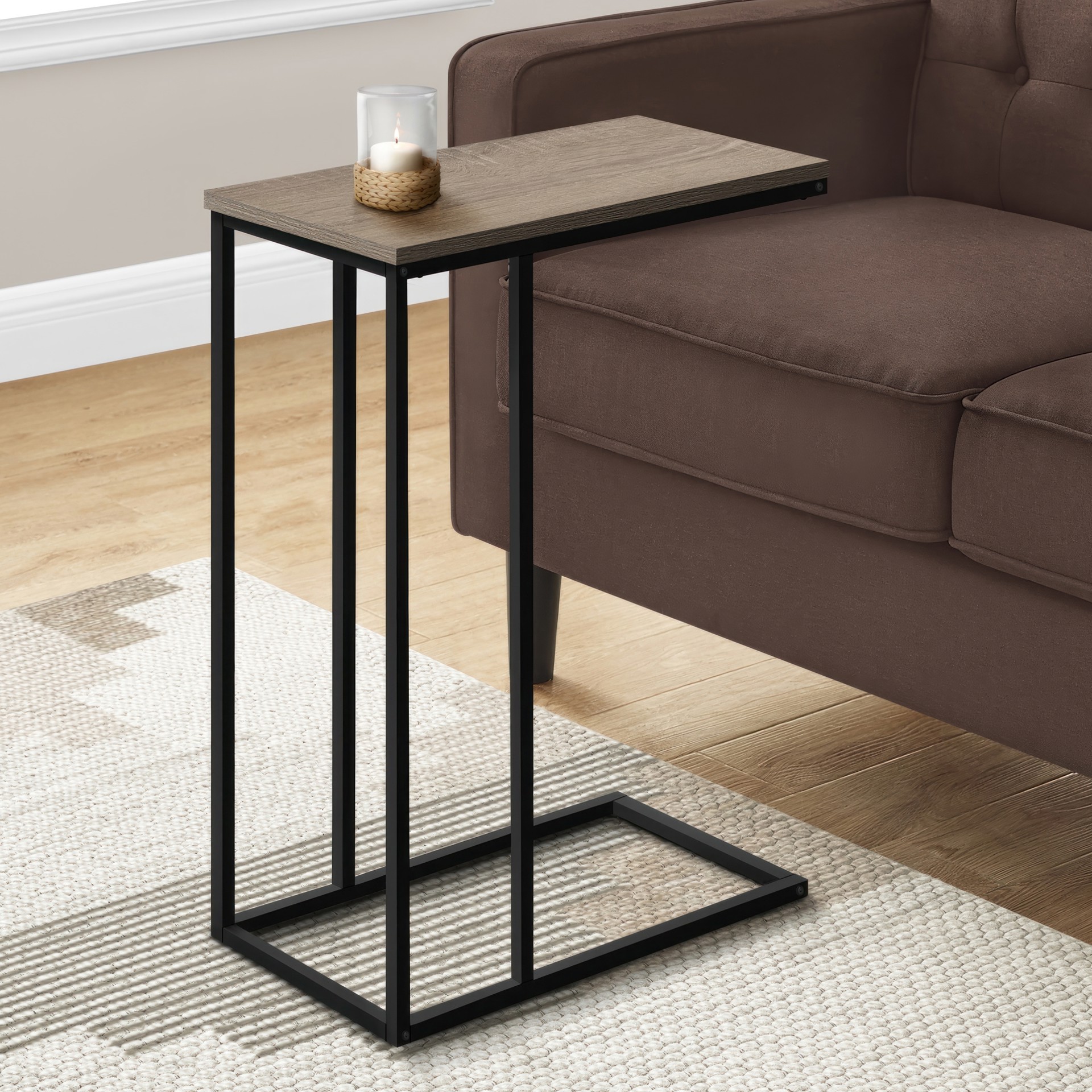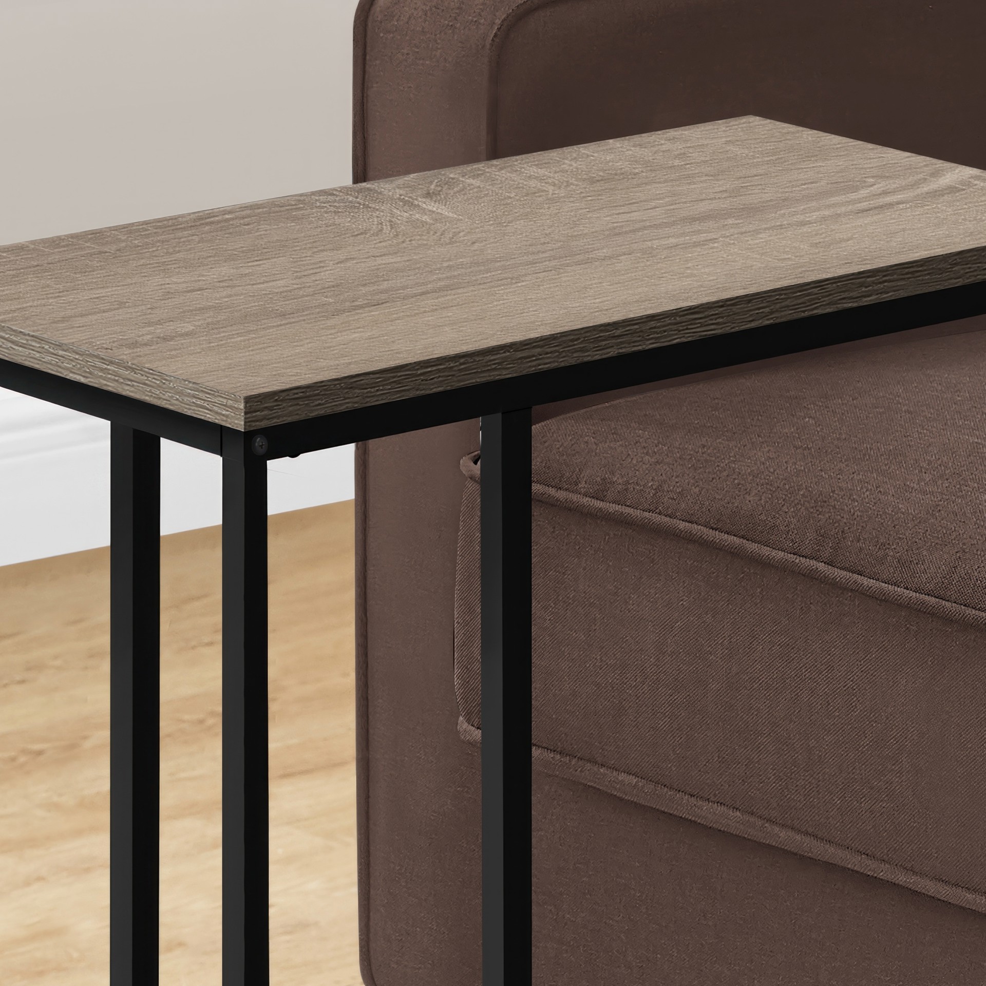 Refresh your home decor with this C-shaped side table in a dark taupe faux wood finish.