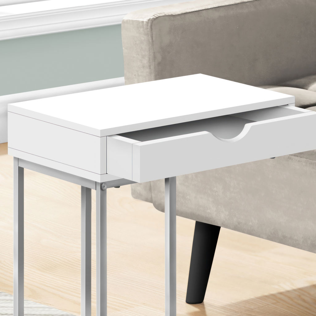 Stylish and versatile, this portable side table features a smooth white laminate finish top and silver metal frame that adds a modern look anywhere you need a small side table with storage.