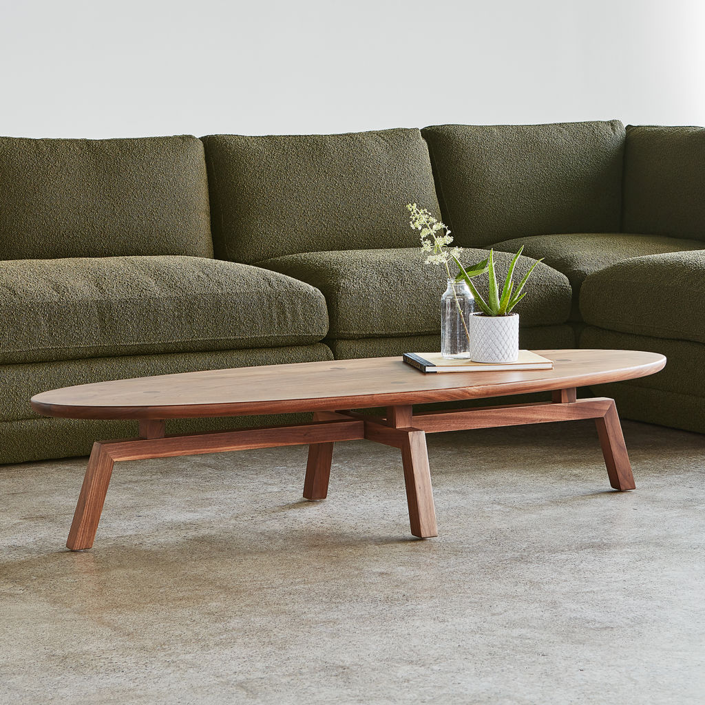 Combining classic mid-century style with the casual vibe of 1970s modernism, the Solana oval coffee table showcases solid wood craftsmanship and sculptural beauty.
