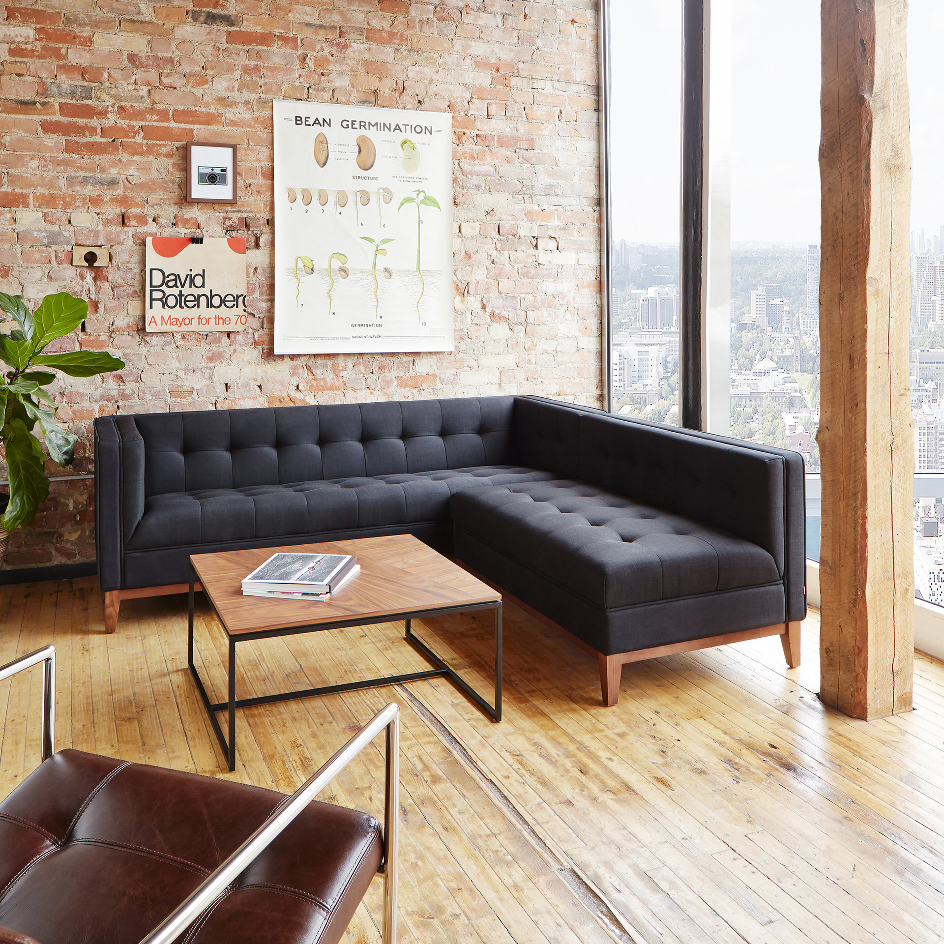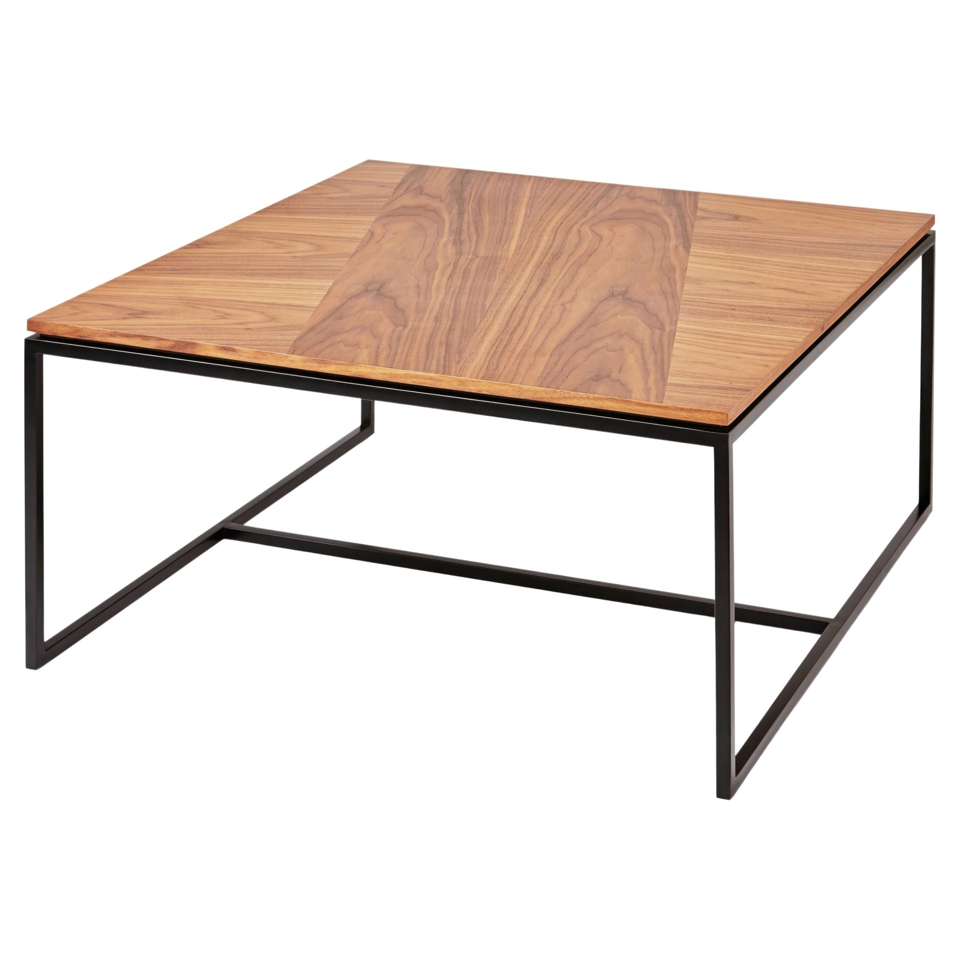 The Tobias Coffee Table is a minimalist, geometric accent piece well suited for modern spaces. The square top features a dynamic arrangement of walnut wood grain panels, which rest on a slim, solid steel base. A subtle reveal along the table edge creates the illusion of a floating top.
