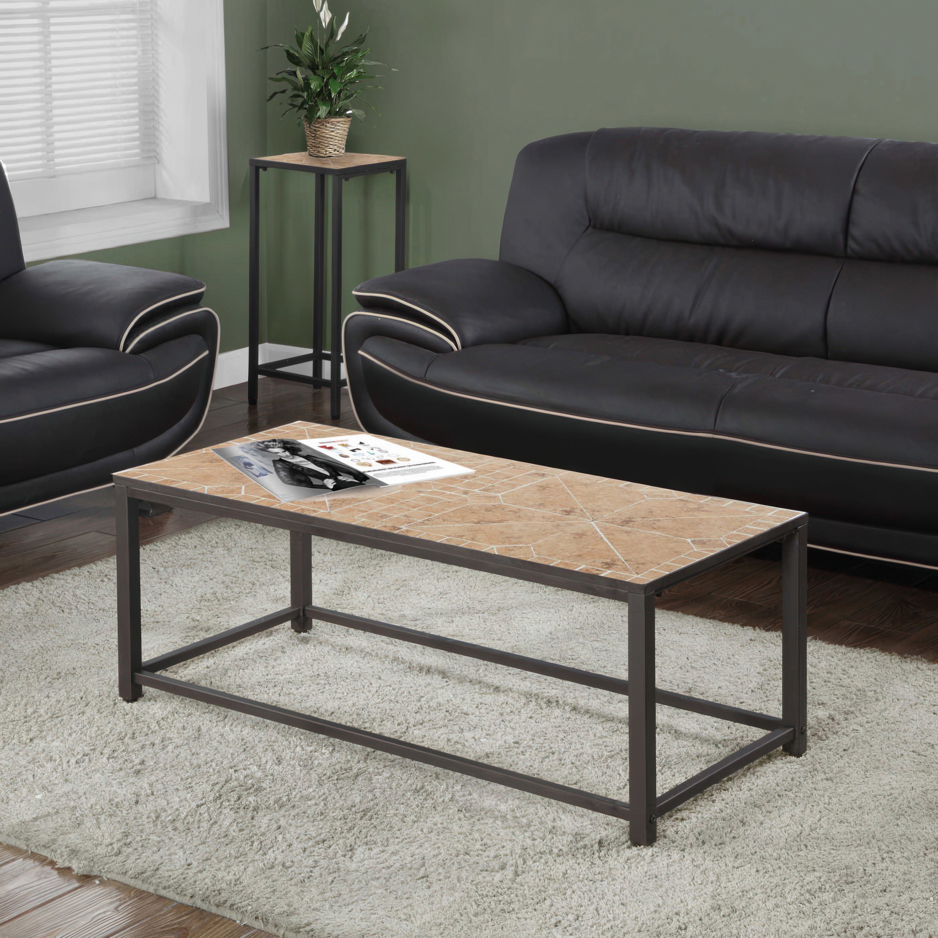 This coffee table perfectly combines functionality and style to transform your living room. Its natural stone mosaic surface in warm tones adds a touch of timeless elegance, while the brown metal frame provides uncompromising strength.