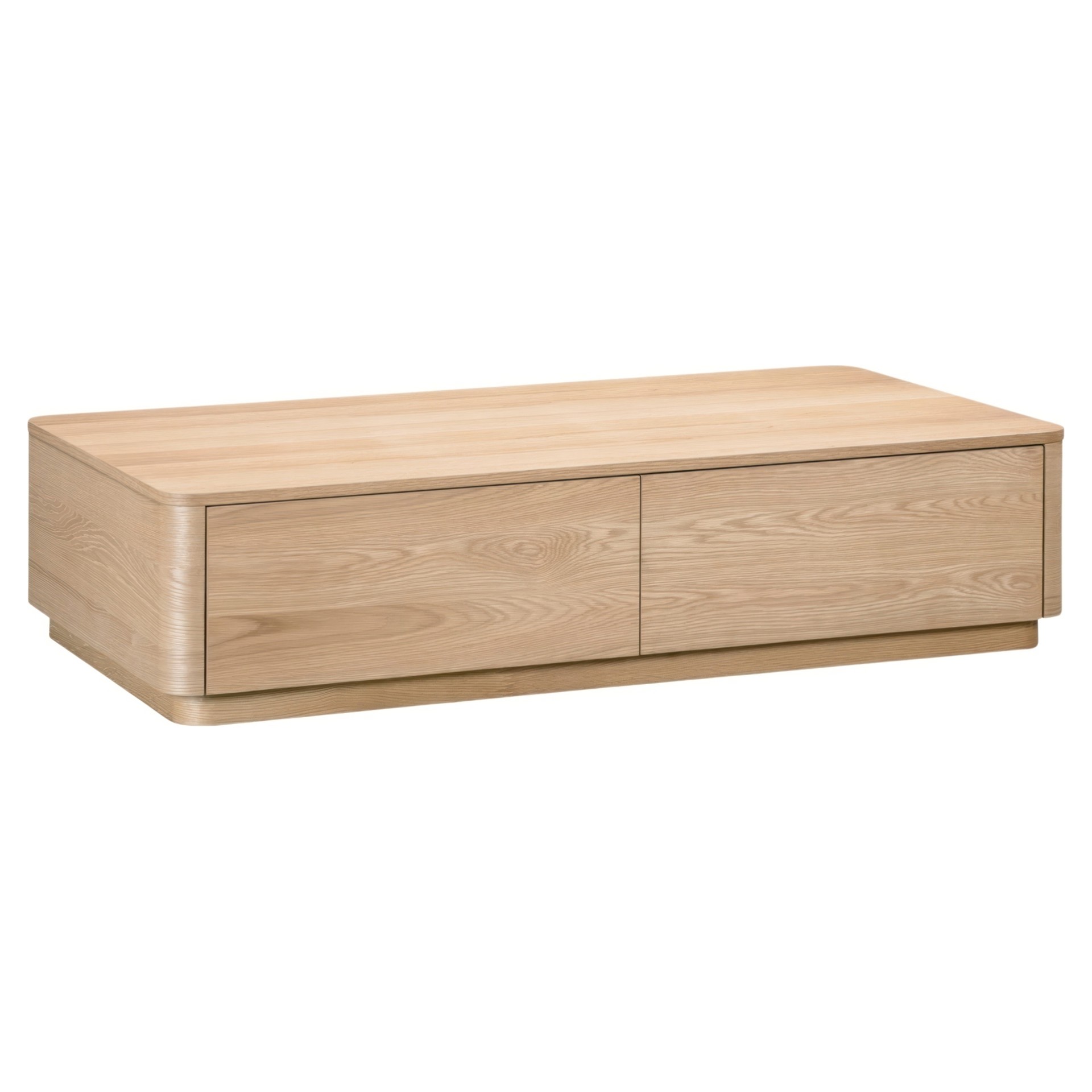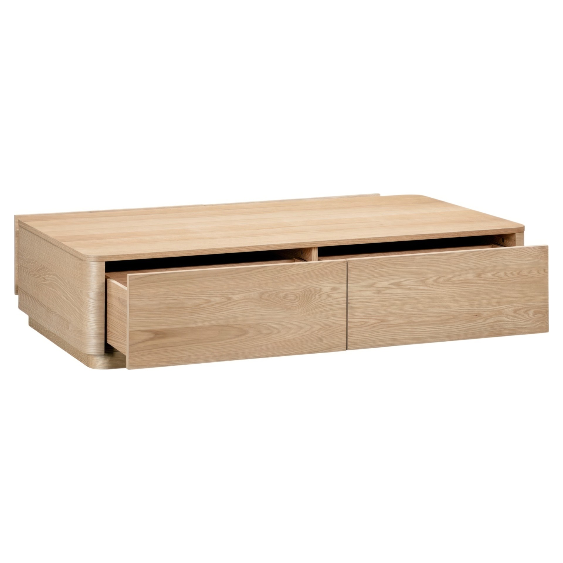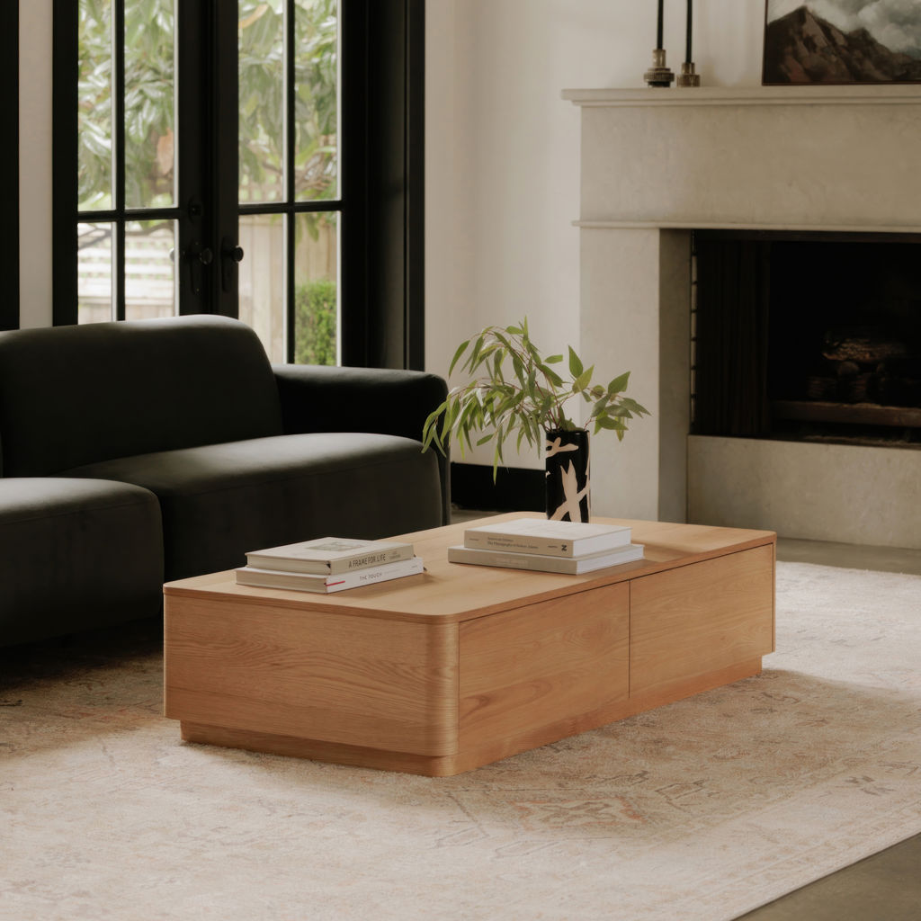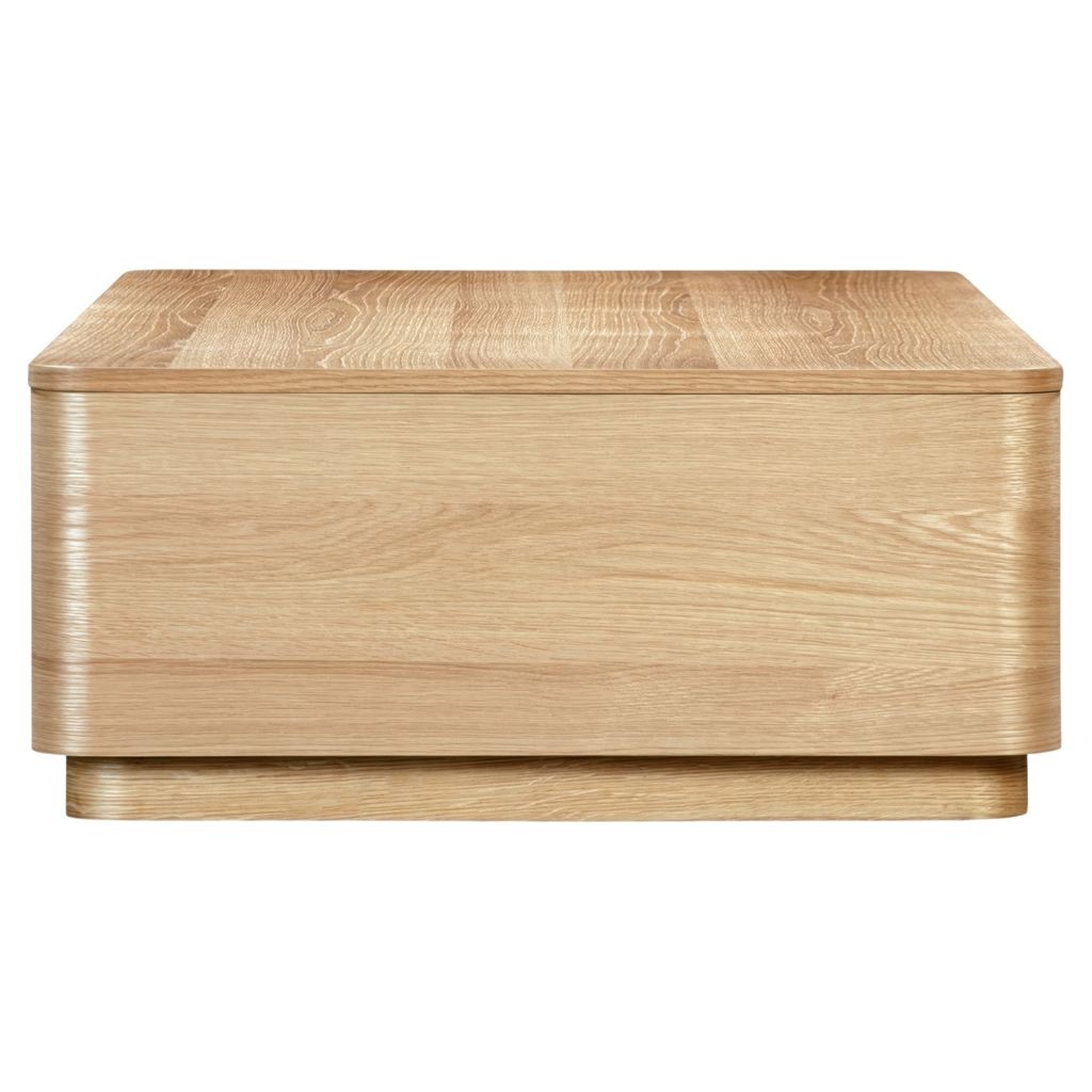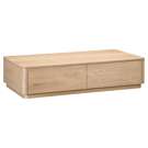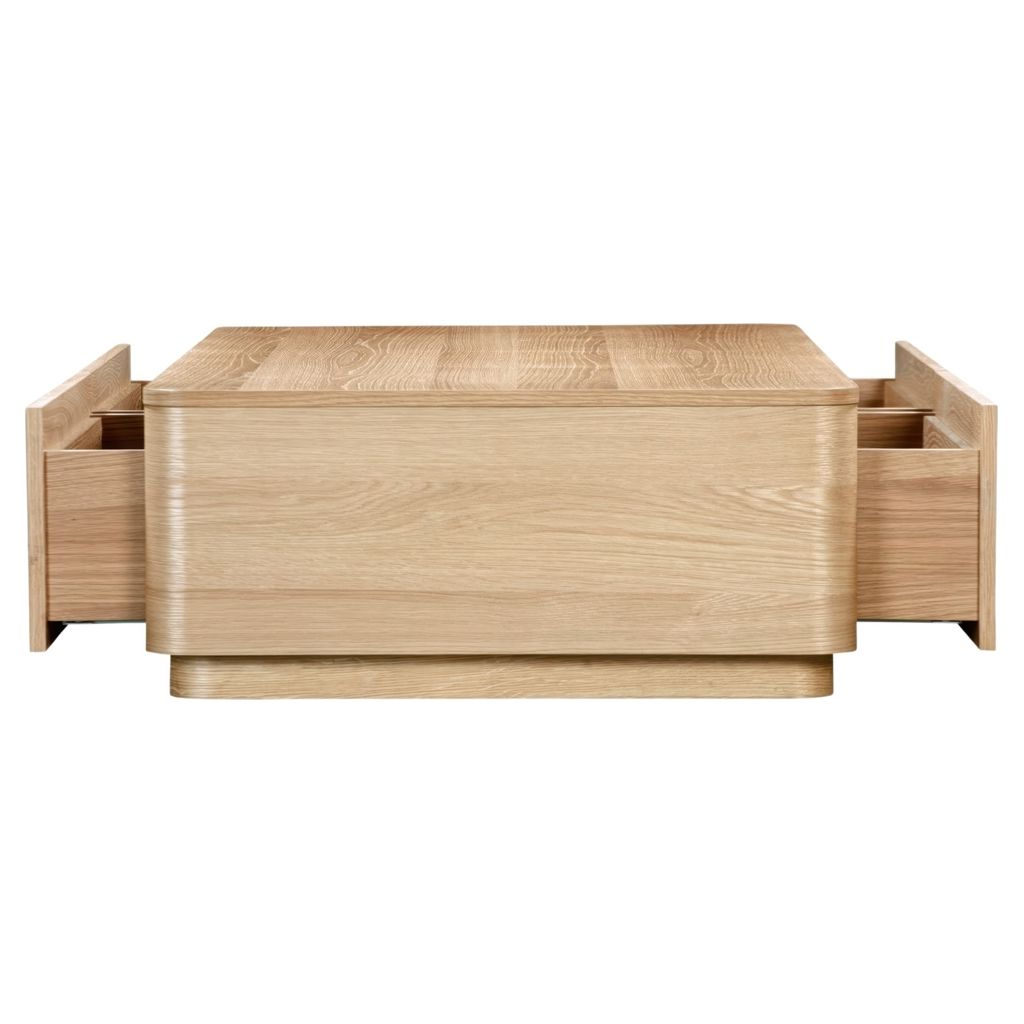 This coffee table boasts gently rounded corners and two large, push to open, smoothly gliding drawers that reveal generous storage space while embracing oak's natural beauty and character.