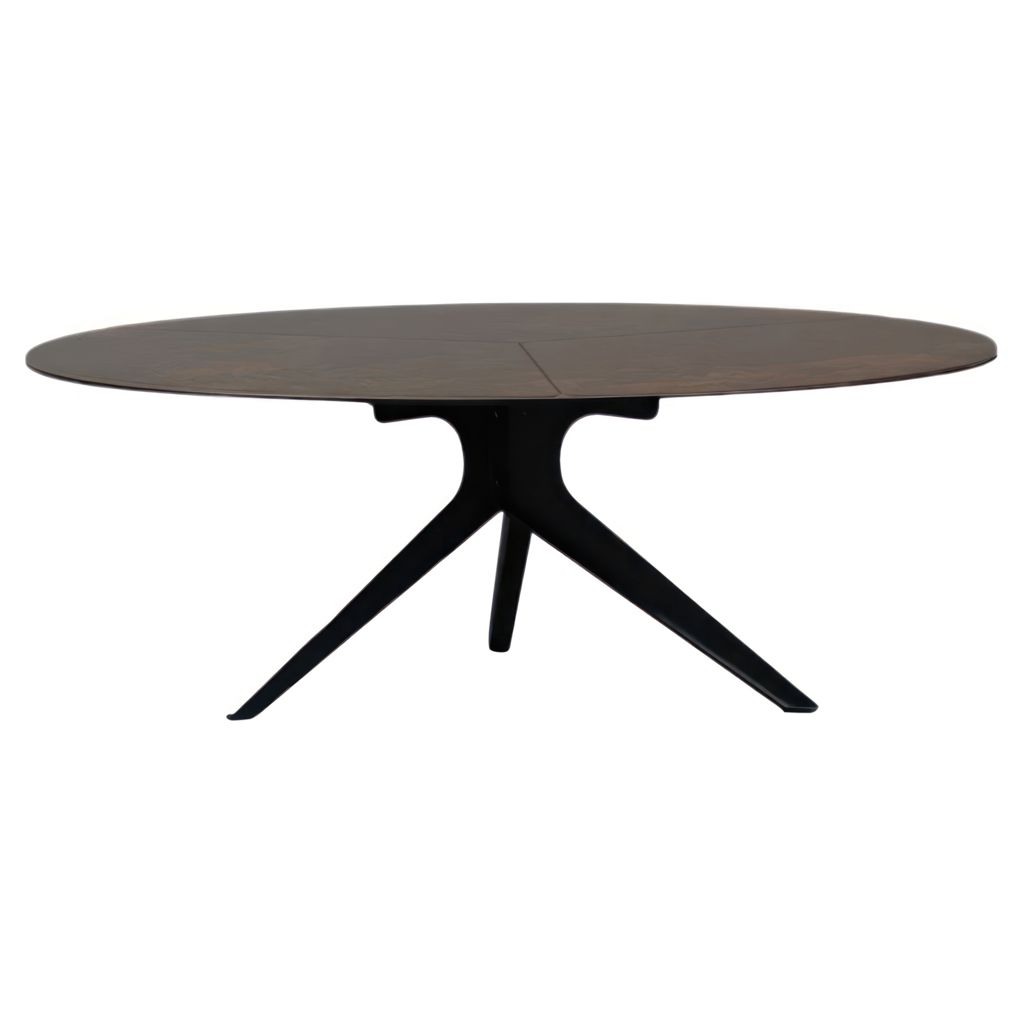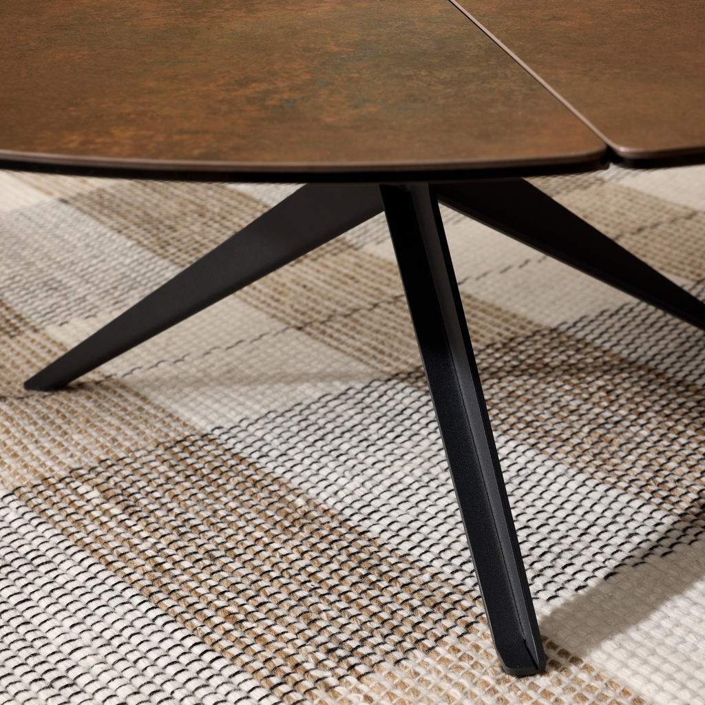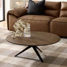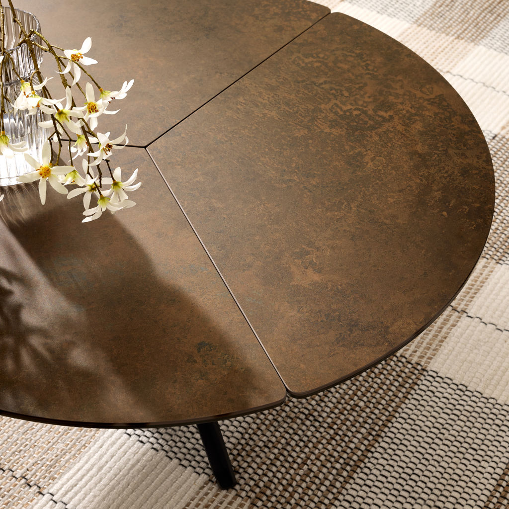 Its round top, with warm tones and a refined texture, creates an elegant focal point while remaining easy to maintain and resistant to everyday wear. The sturdy black base ensures excellent stability and provides a subtle contrast that enhances the surface.