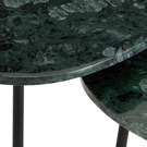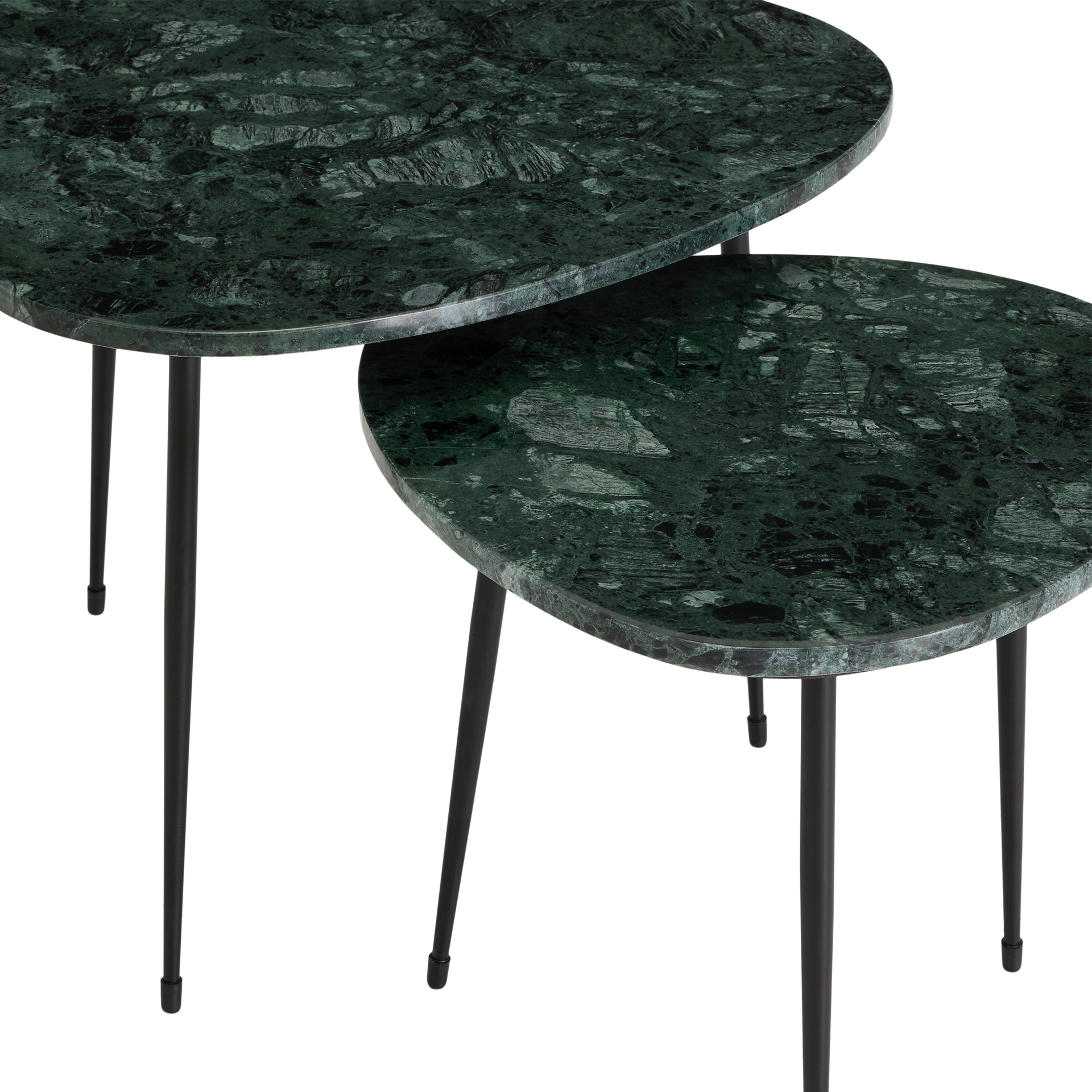The dark green marble table tops are beautifully veined, offering rich color and depth to the surrounding decor.