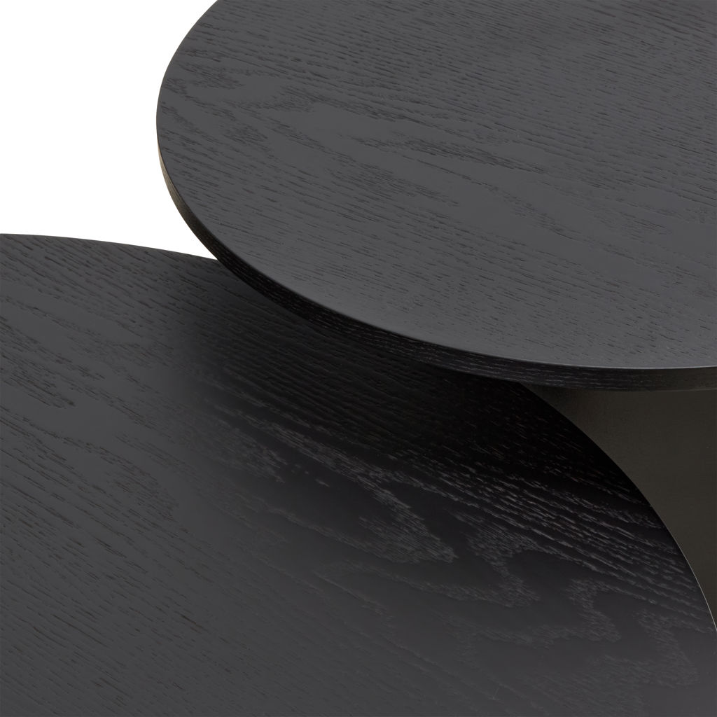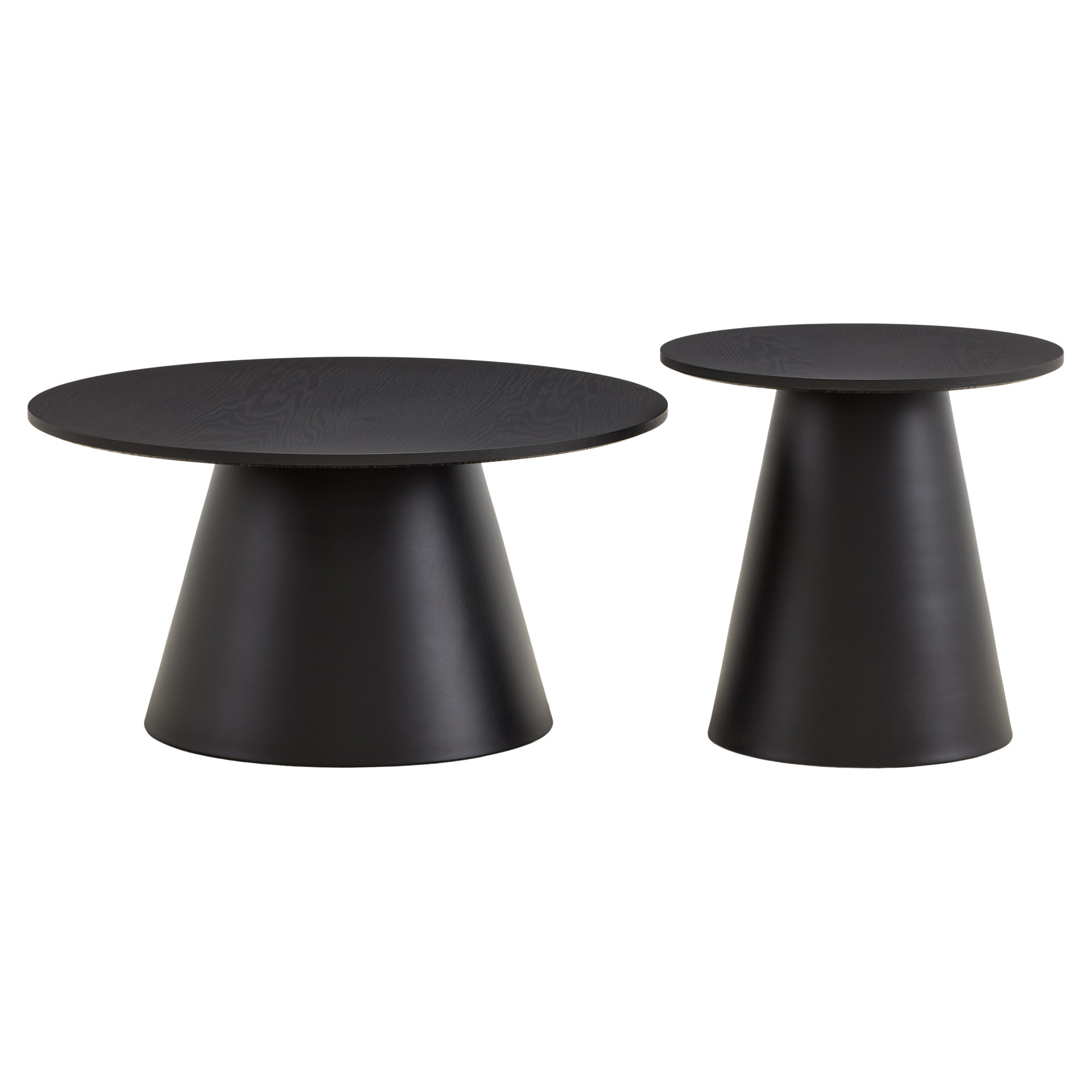 This striking set of two nesting tables features round tops in natural wood veneer paired with bold matte black conical bases, creating a sophisticated contrast and a sculptural presence.