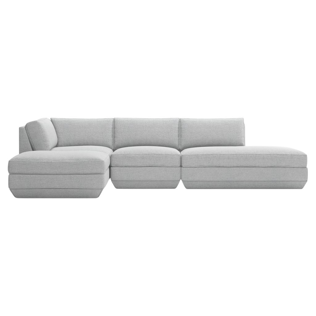 The Podium modular collection is an adaptable seating system that brings modern elegance and luxurious comfort to any space. Podium consists of seven main components (right arm, left arm, armless, corner, ottoman, left lounge, and right lounge) that can be arranged in unlimited configurations to fit any vision or layout. The components can then be easily reconfigured or added later to accommodate your changing lifestyle. Each component features a relaxed silhouette inspired by 1970s modernism: a low, deep seat position created by soft seat and back cushions (filled with eco-friendly synthetic down derived from recycled water bottles) and an attractive, slightly sloped, chamfered base. Frames are constructed with 100% FSC® certified kiln-dried hardwood to support responsible forest management.