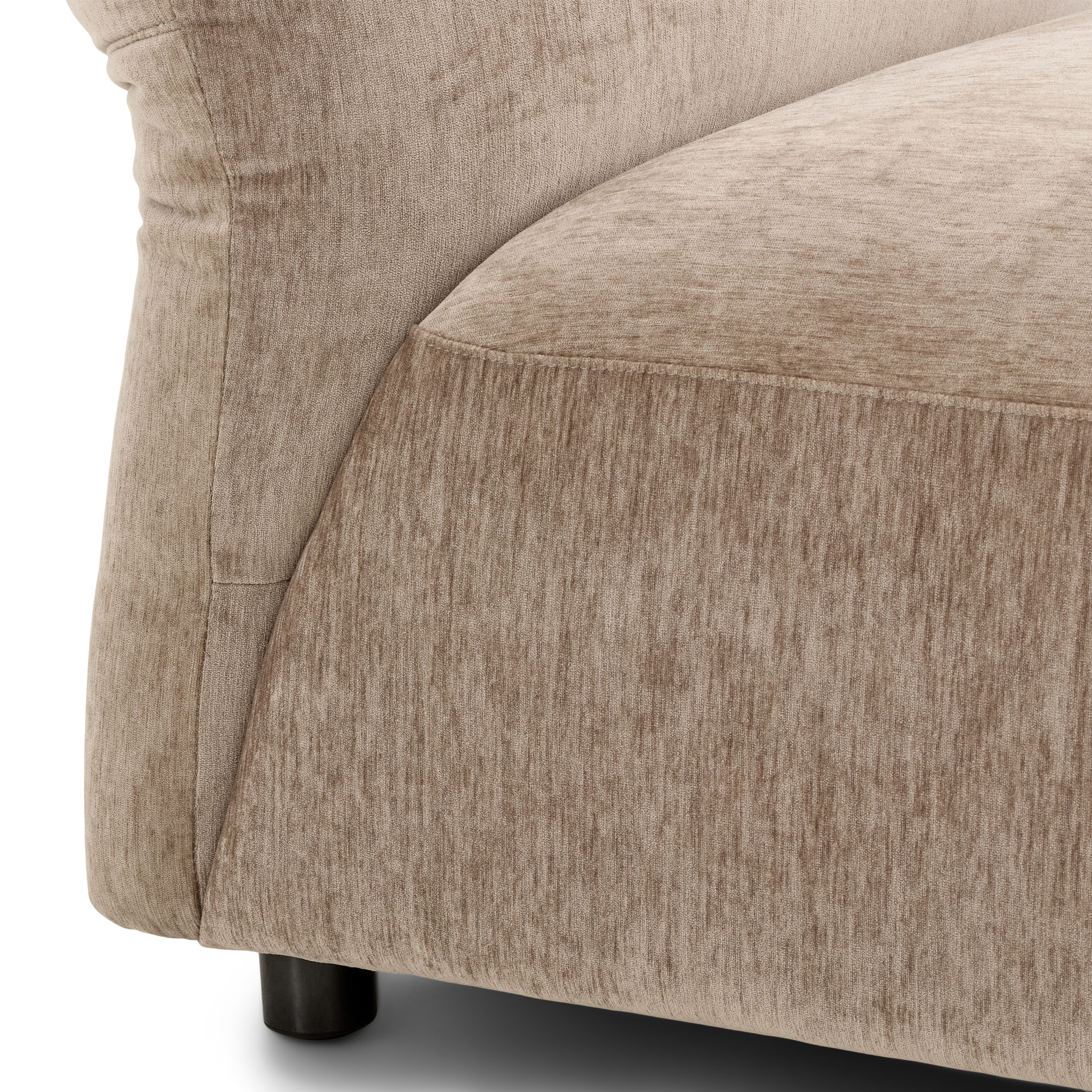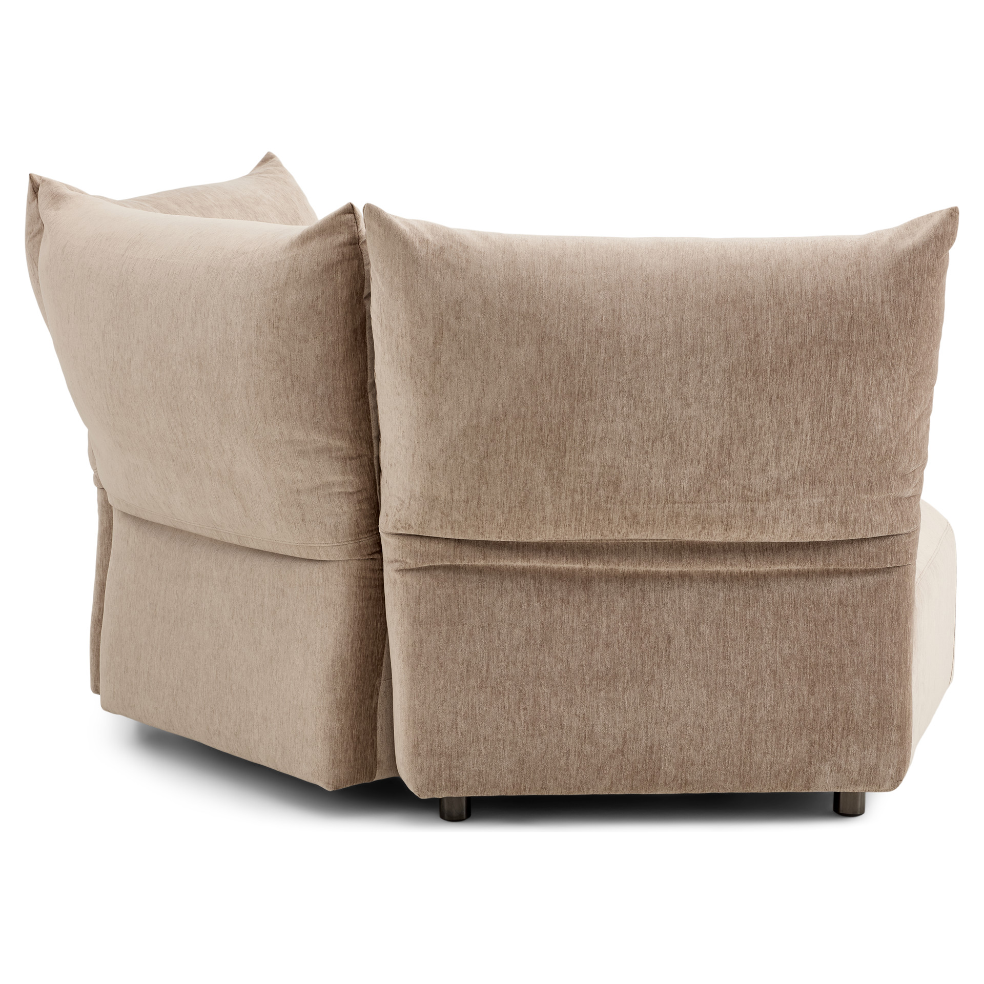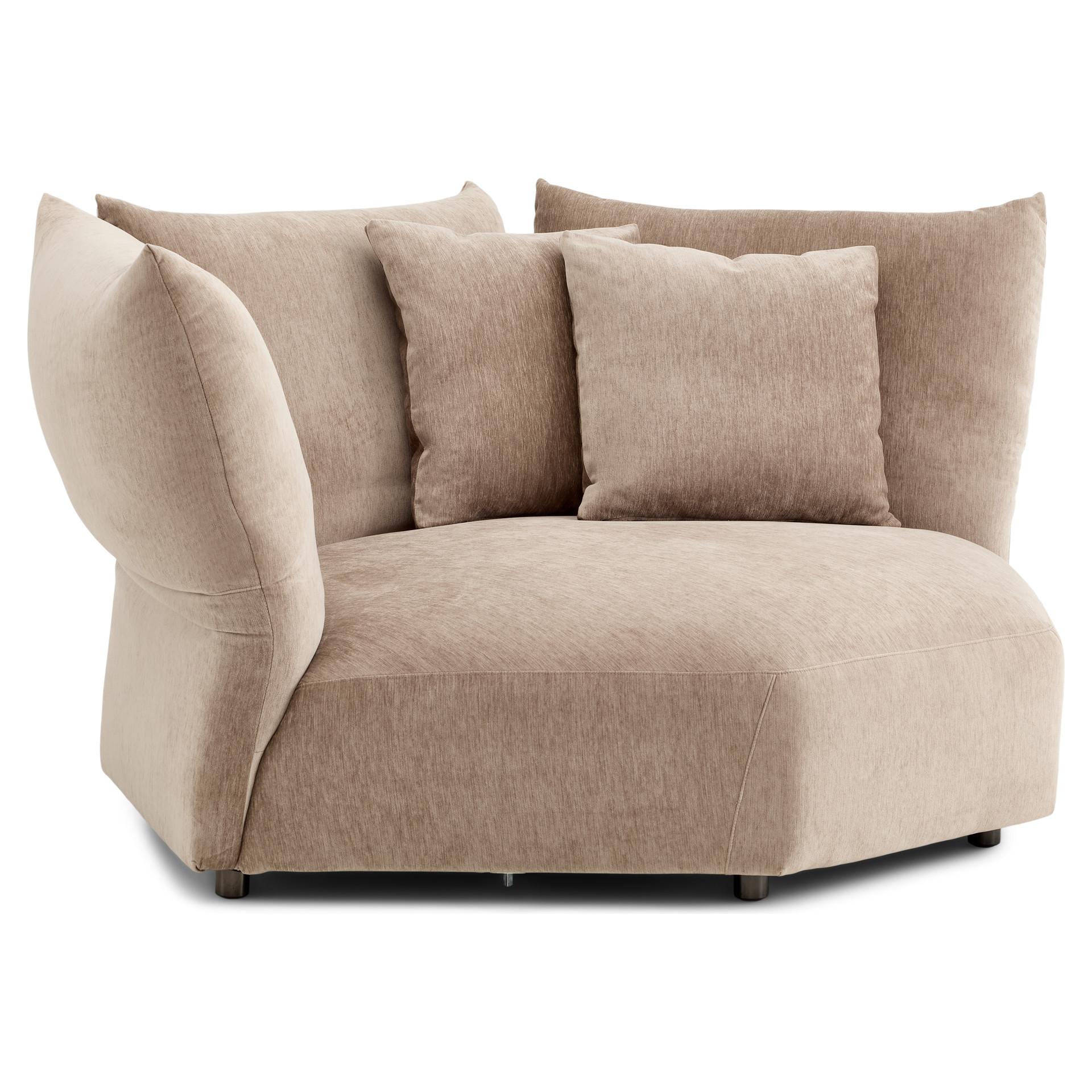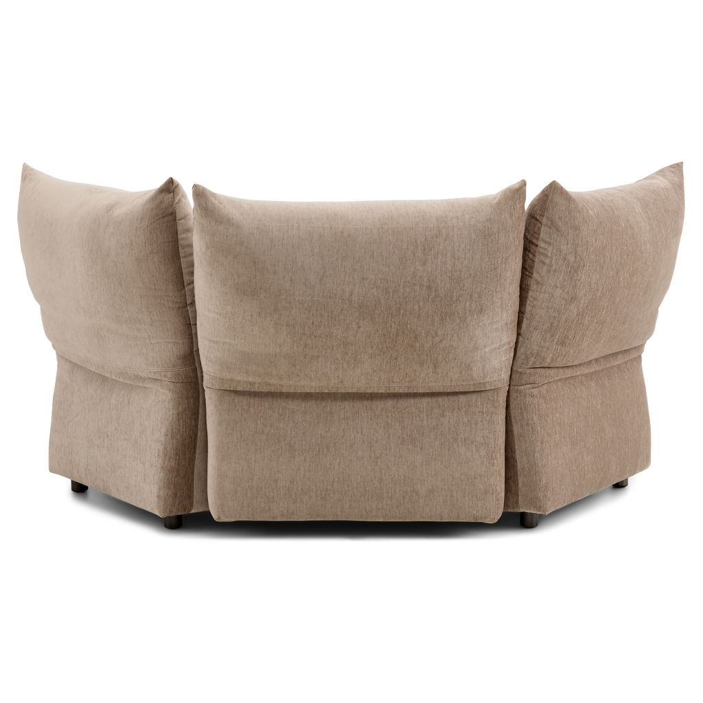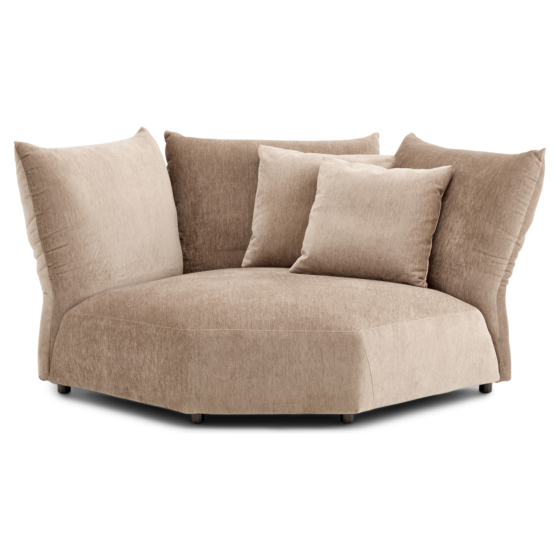 Offered as standard in a soft, plush taupe velvet, the Tobago collection uses 3 basic components (corner chair with extra-deep seat and 3 adjustable backrests, chair with right/left armrests, and chair without armrests) that can be combined to create an unlimited number of seating configurations.