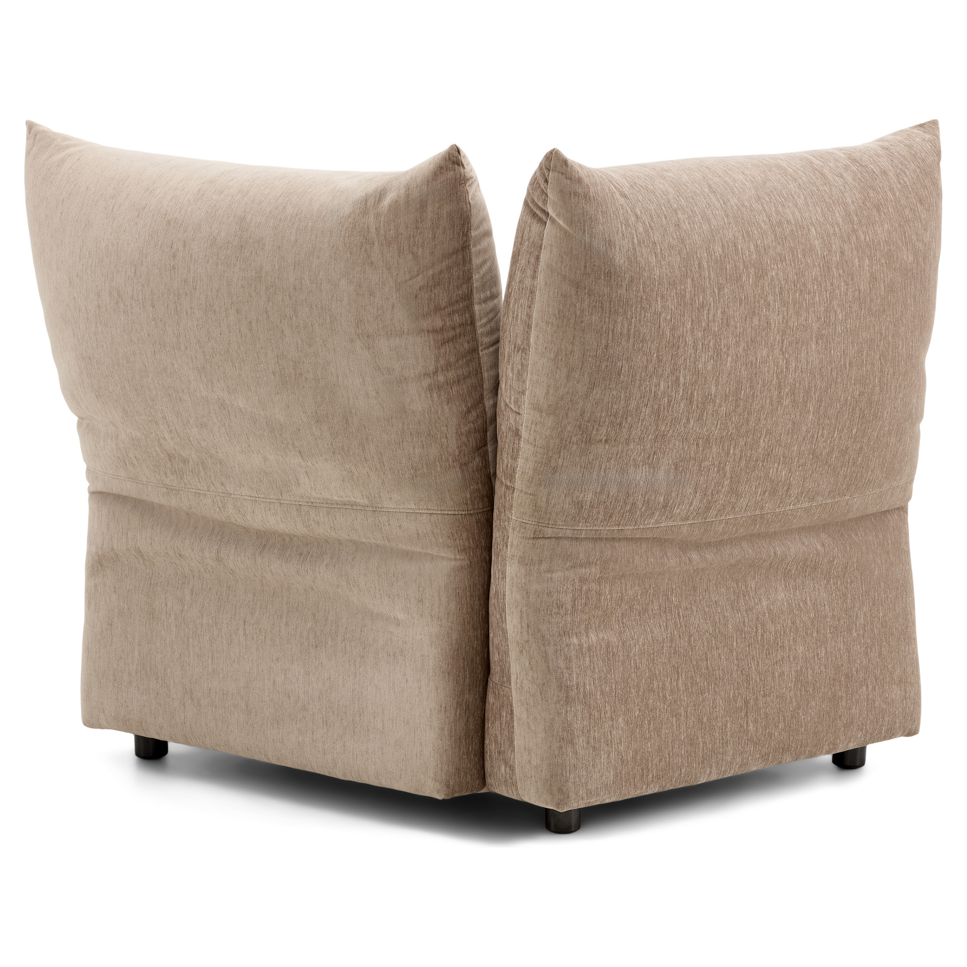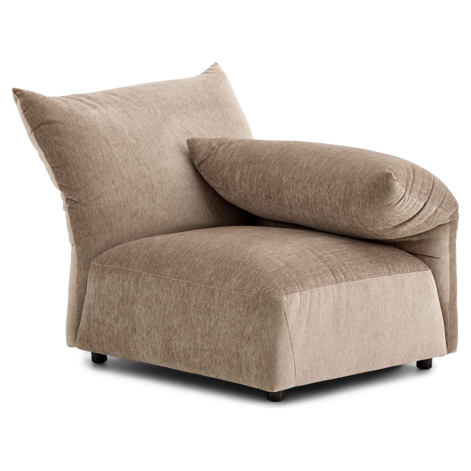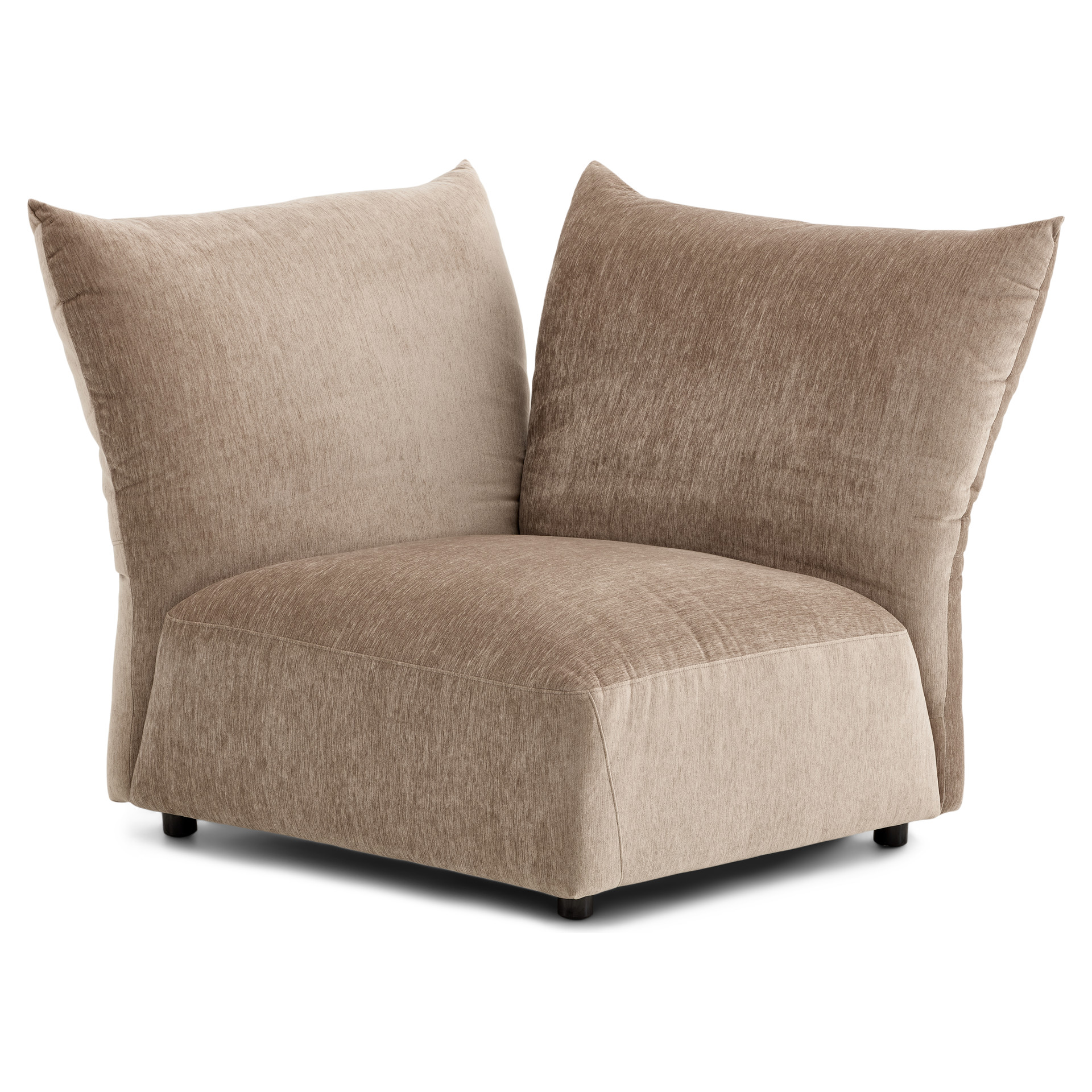 Offered as standard in a soft, plush taupe velvet, the Tobago collection uses 3 basic components (corner chair with extra-deep seat and 3 adjustable backrests, chair with right/left armrests, and chair without armrests) that can be combined to create an unlimited number of seating configurations.