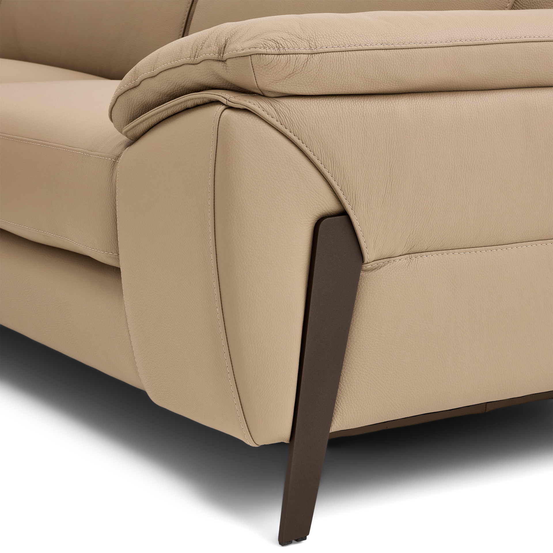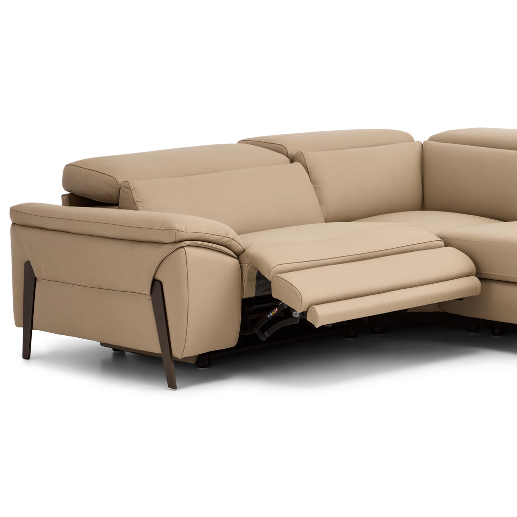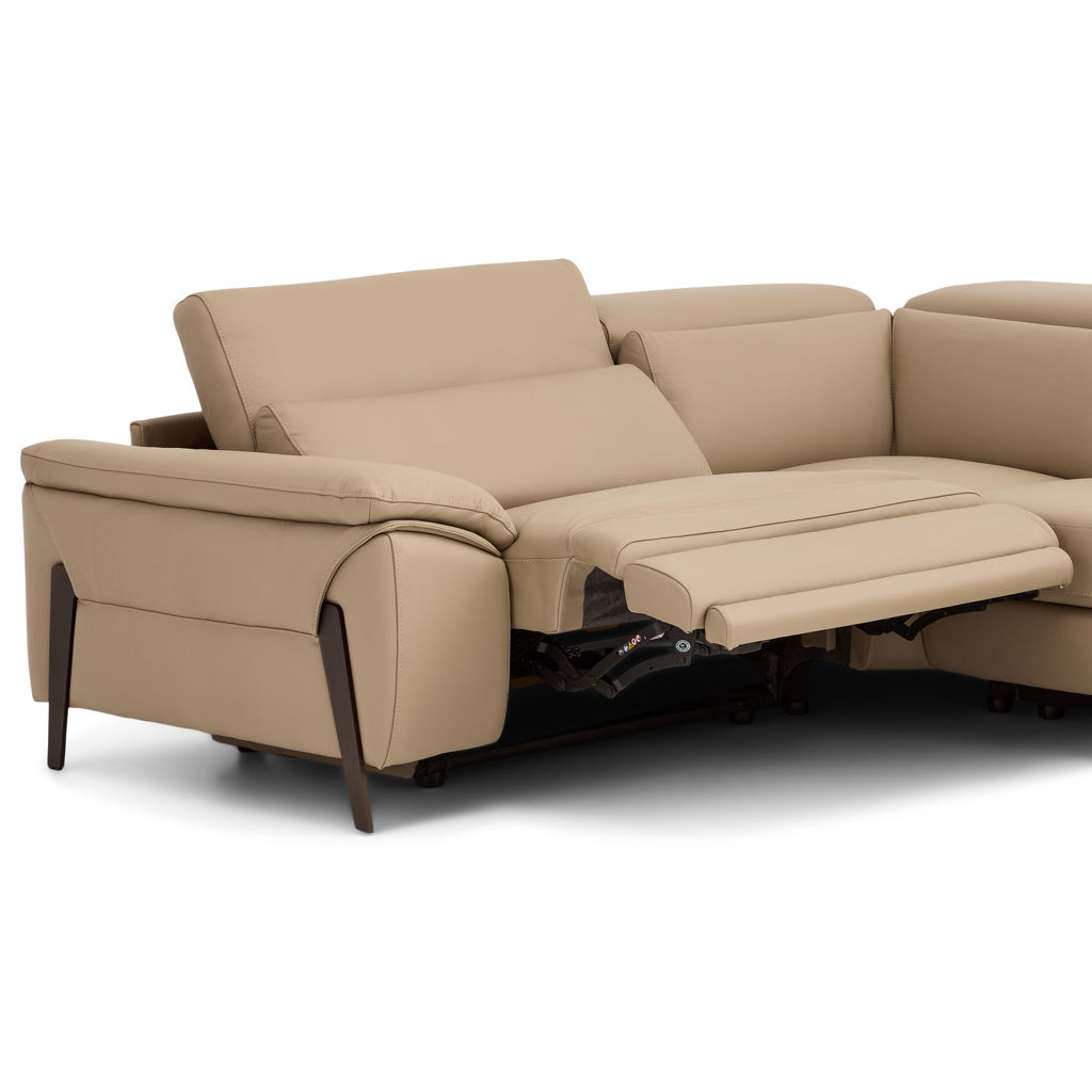 Its clean lines and timeless beige tone blend effortlessly with any décor style. Electric reclining mechanisms offer personalized comfort at the touch of a button, while the dark wood legs add a touch of modern elegance.