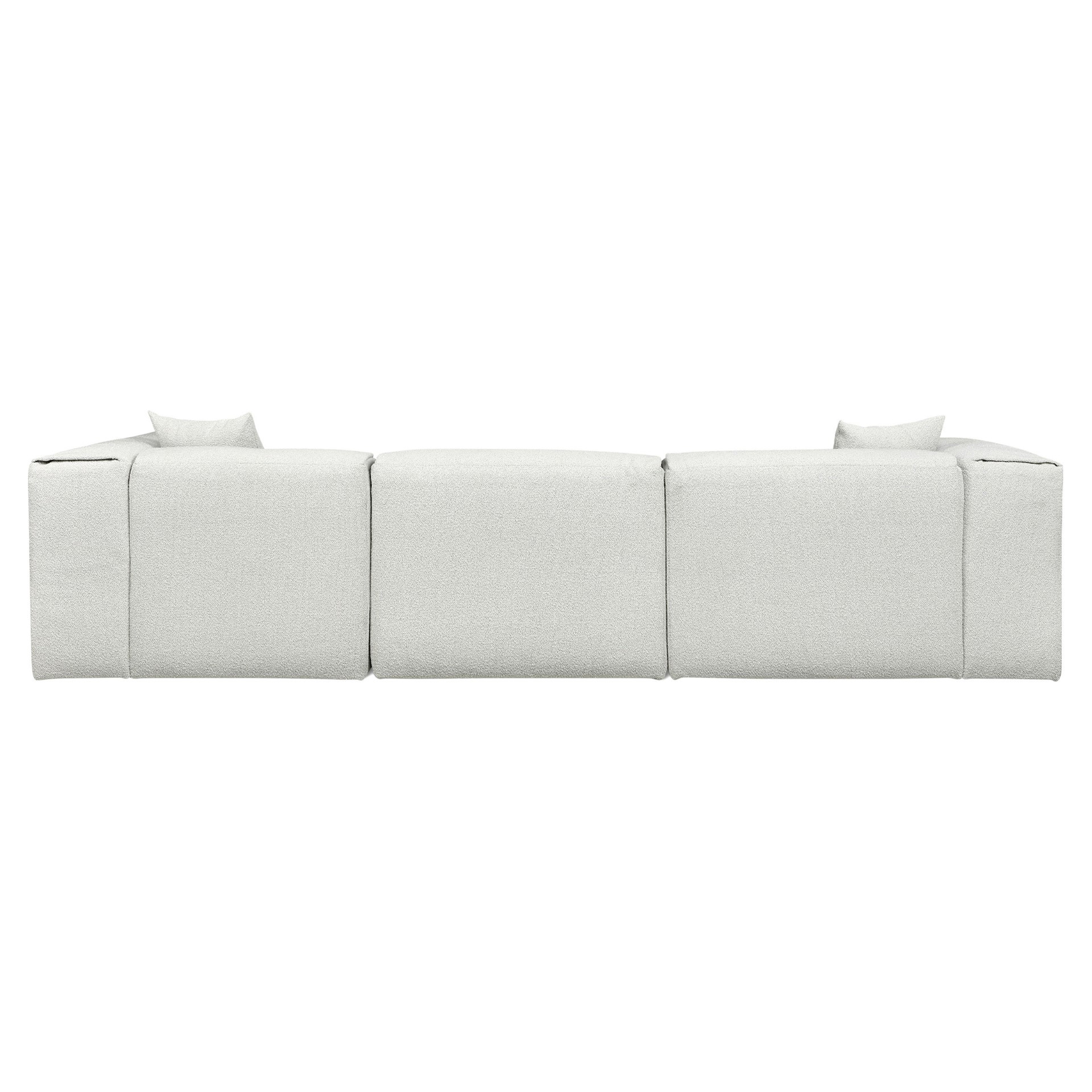 Each piece showcases a low, generously rounded profile, thanks to premium feather fill, upholstered in a textured nubby bouclé. The modern, Scandinavian-inspired silhouette is versatile enough to hold court in a beach house, mountain retreat, or boutique hotel lounge.