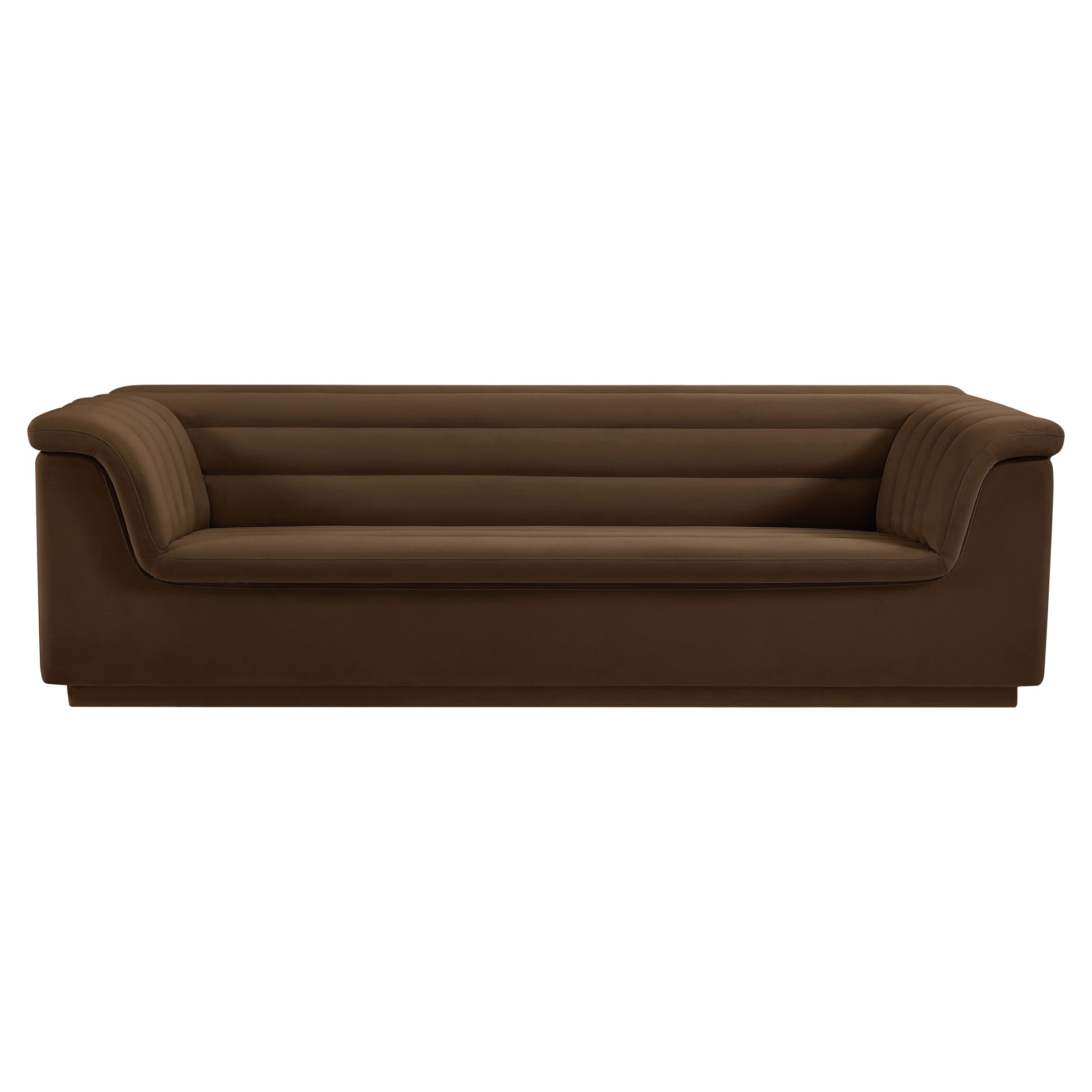 Add instant modern pizzazz to your living room or den with this Cascade velvet fabric sofa. Upholstered from top to bottom in soft brown velvet upholstery, this chic sofa adds contemporary flair to any space you choose to use it in.