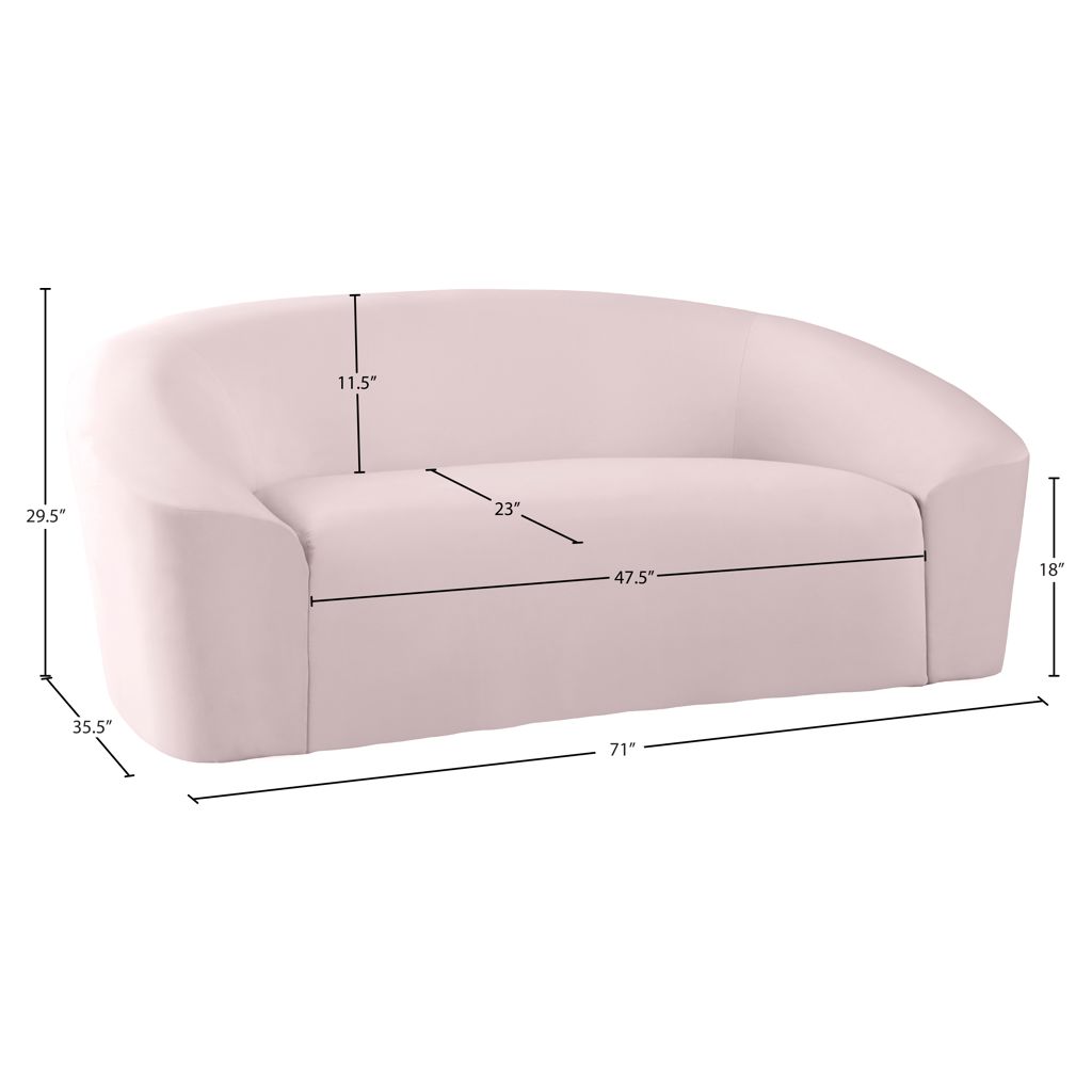 Go for easy, breezy style with this lovely Riley velvet love seat. The sleek pink velvet is a showstopper in the living room, den, or great room, adding a casual yet modern vibe wherever you choose to use it. The velvet material feels soft and welcoming to the touch, ensuring that your leisure time is well spent in cloud-like comfort. Pair it with other items in the Riley collection, or use it on its own as a standalone piece.