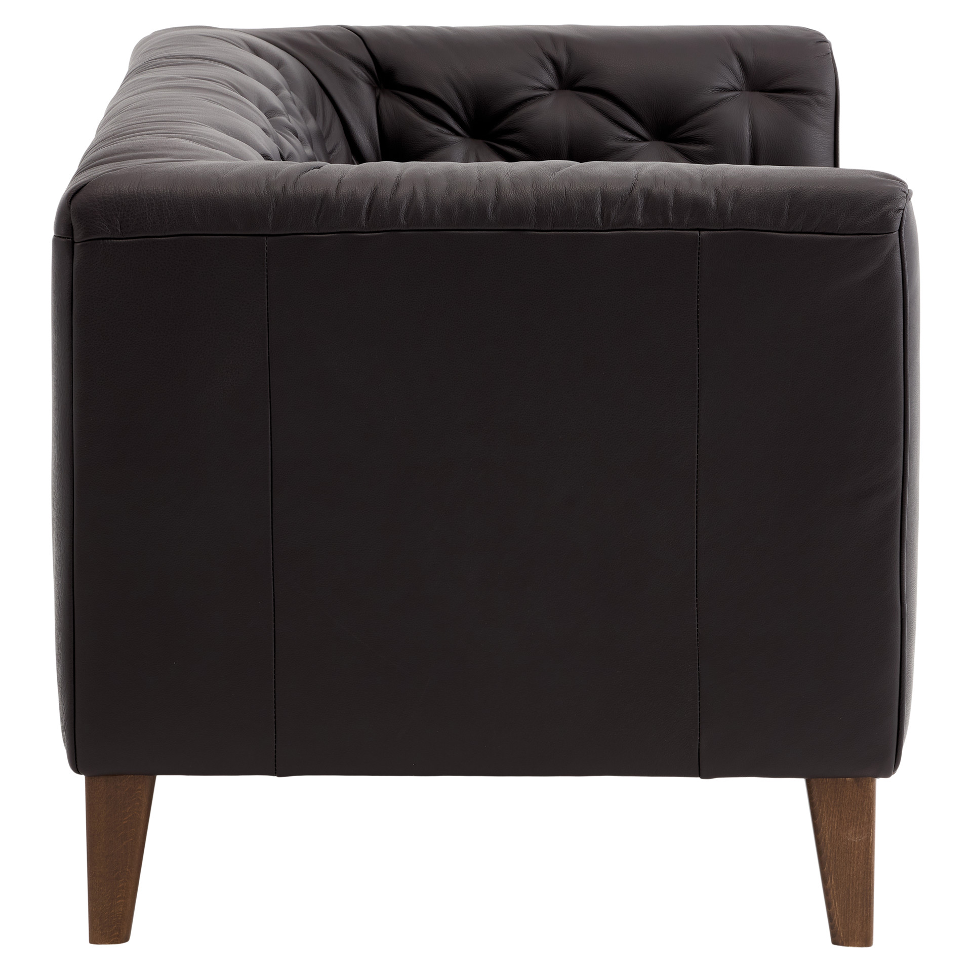 The noble wood legs add a warm, authentic touch, creating a harmonious contrast with the dark leather.