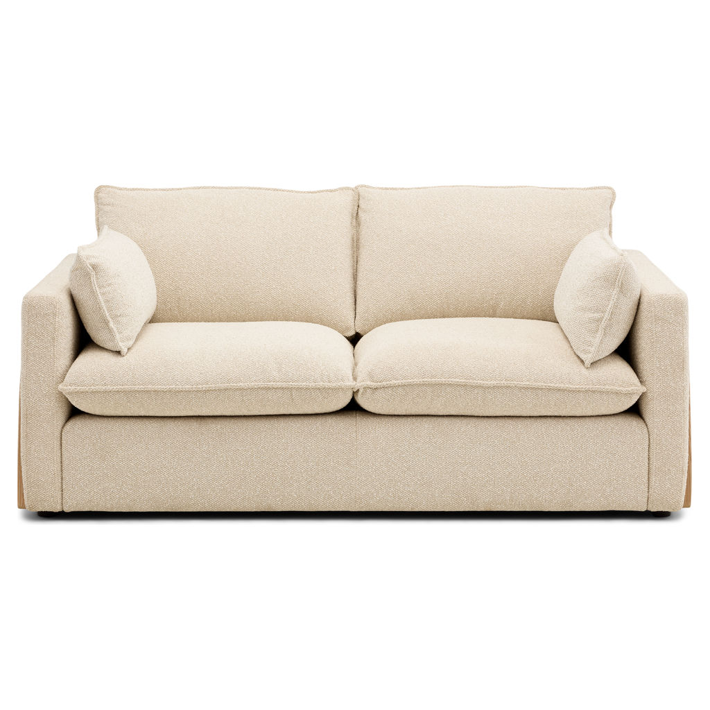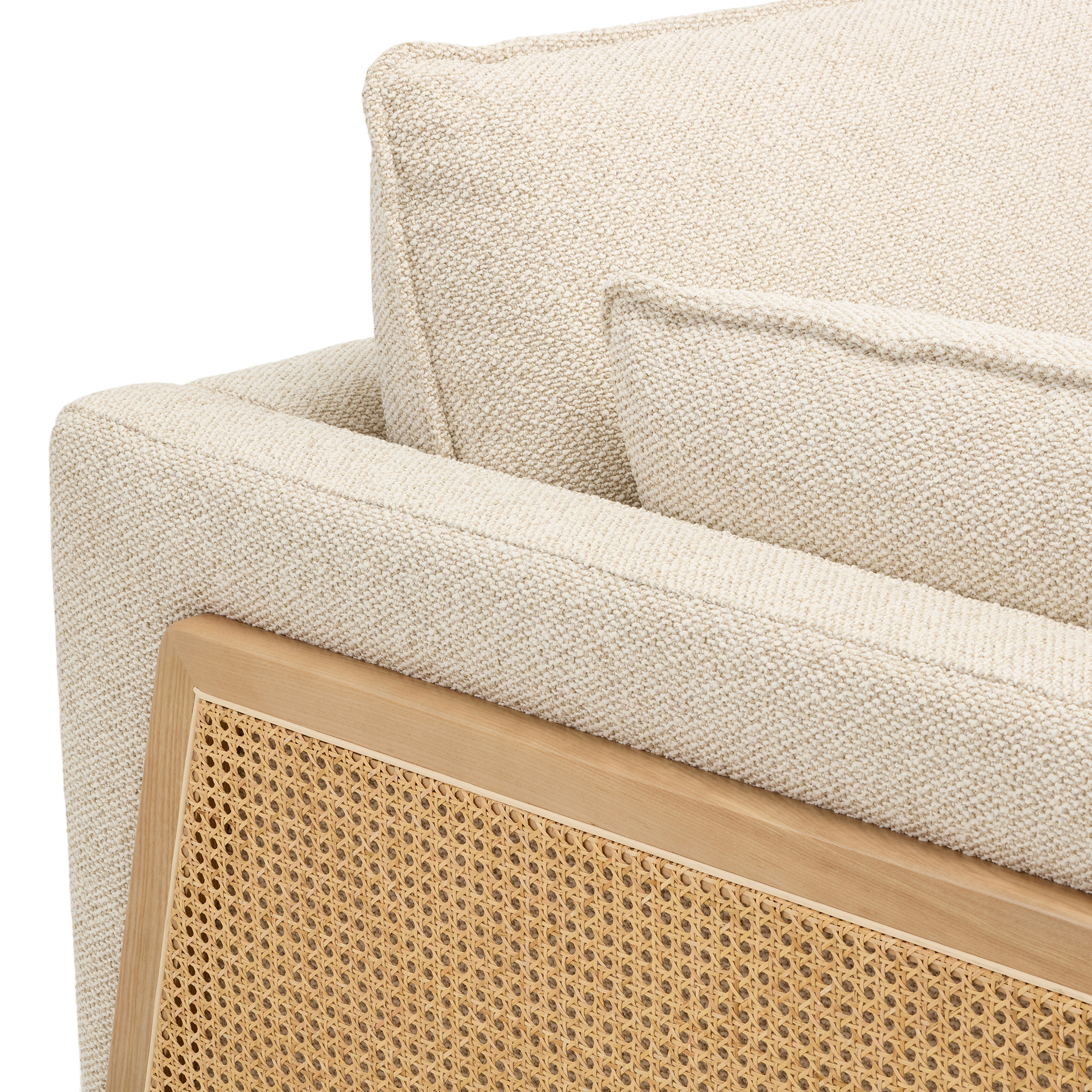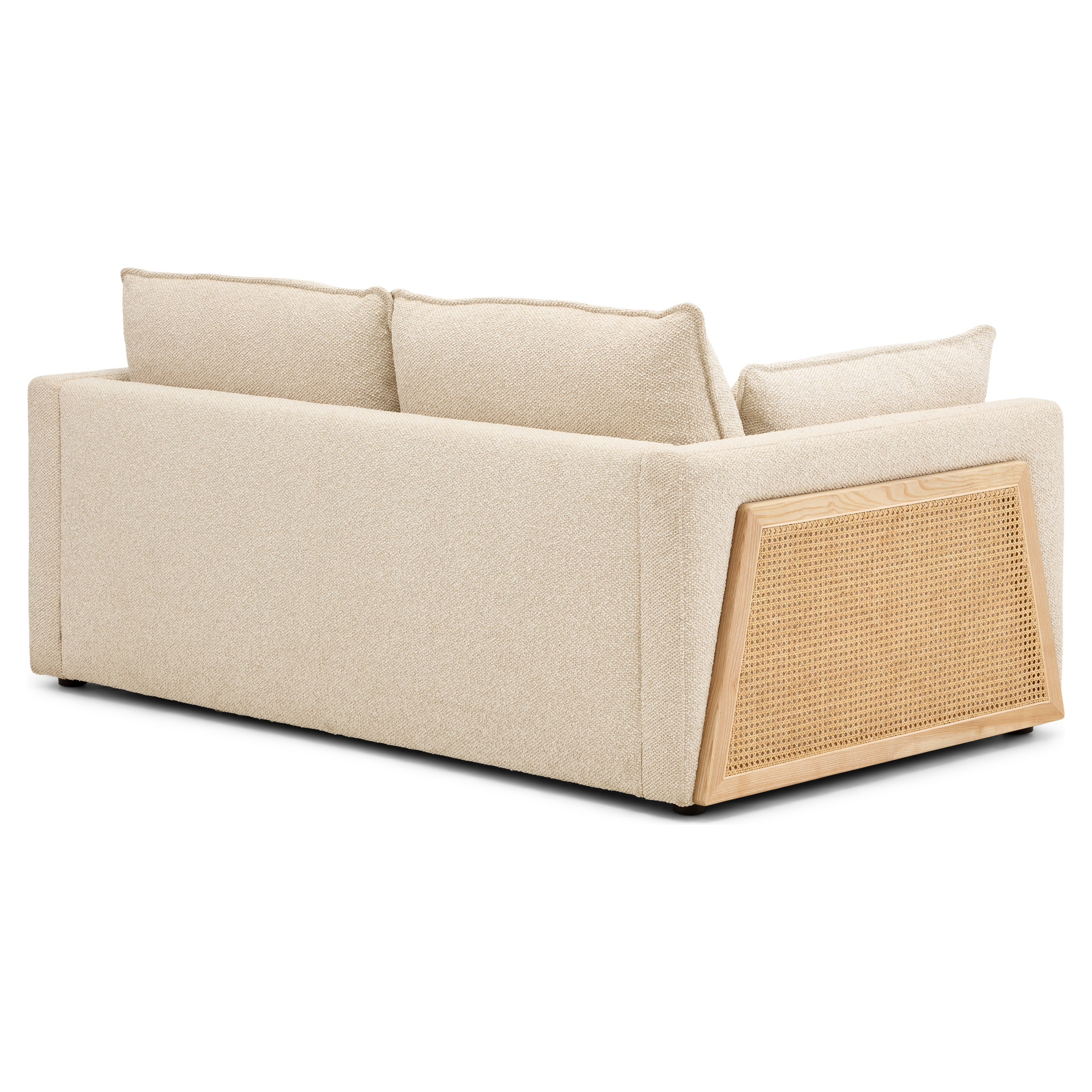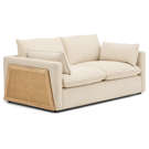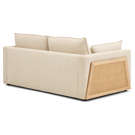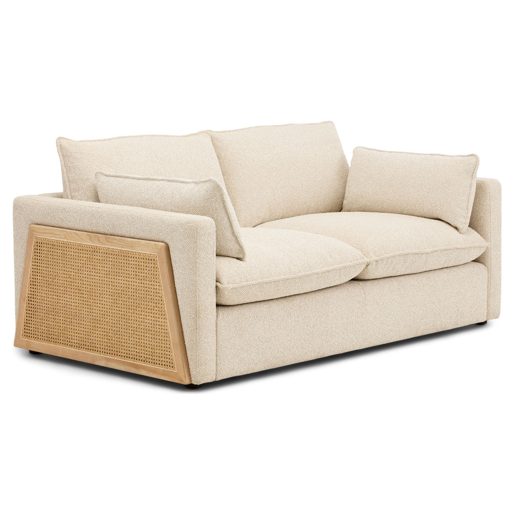 Fall under the spell of this stunning 2-seater sofa, featuring a unique contemporary design. With its bold blend of heathered beige fabric and natural cane accents, this piece brings a touch of originality and elegance to your home.