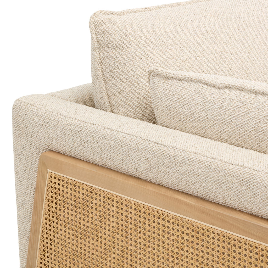 Fall in love with the charm of this stunning 2-seater condo sofa, featuring a unique contemporary design. With its bold mix of heathered beige fabric and natural rattan cane accents, this piece adds a touch of originality and elegance to your interior.