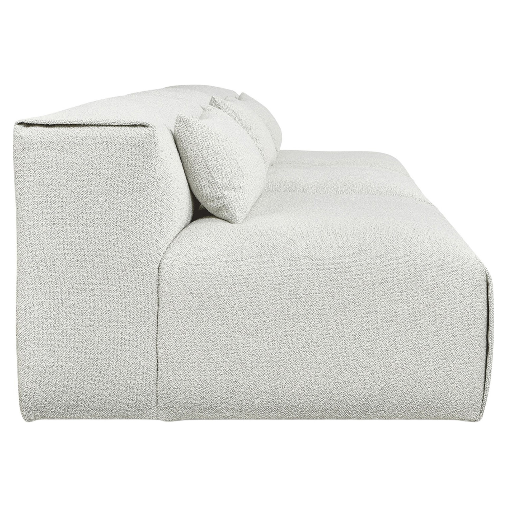 Each piece showcases a low, generously rounded profile, thanks to premium feather fill, upholstered in a textured nubby bouclé. The modern, Scandinavian-inspired silhouette is versatile enough to hold court in a beach house, mountain retreat, or boutique hotel lounge.