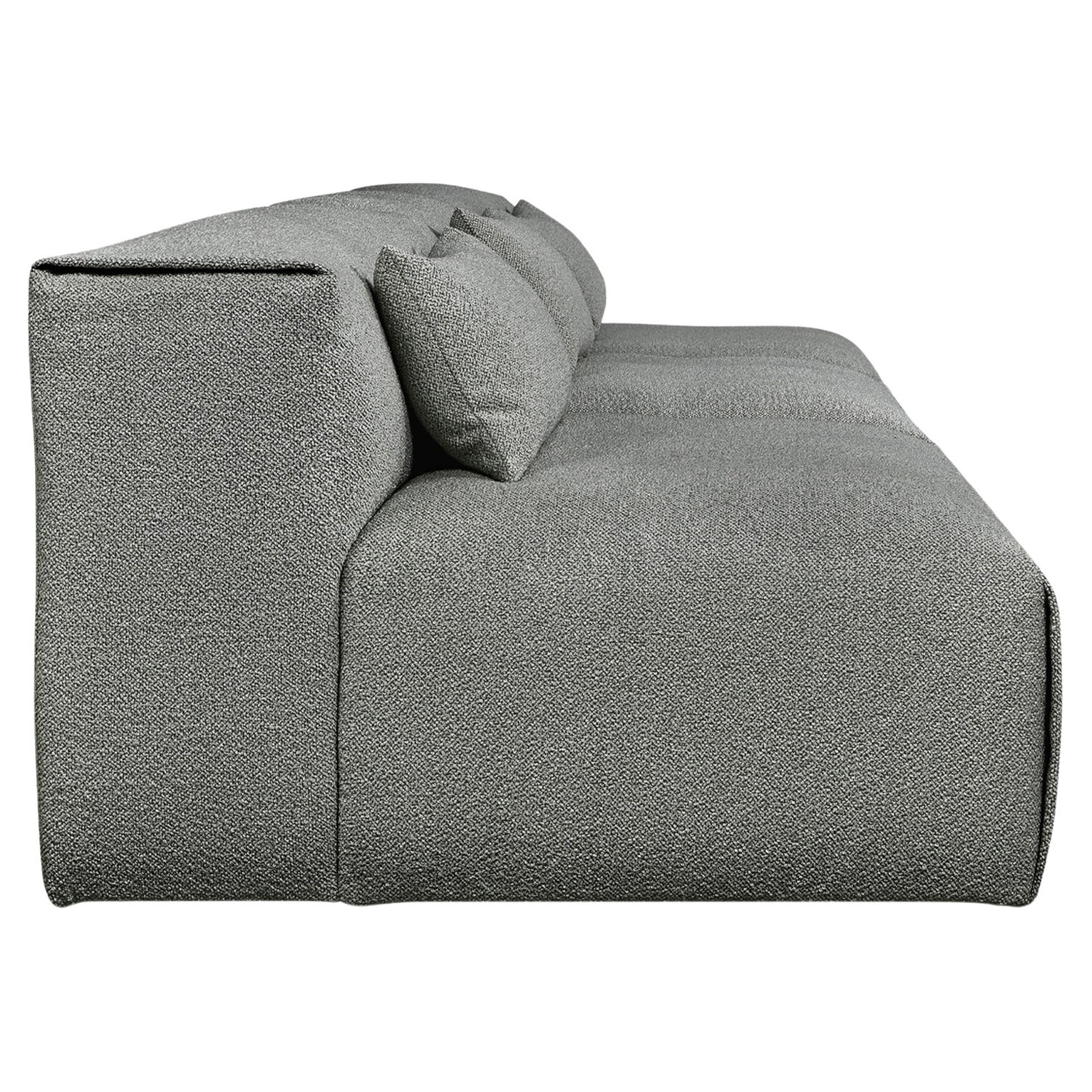 Each piece showcases a low, generously rounded profile, thanks to premium feather fill, upholstered in a textured nubby bouclé. The modern, Scandinavian-inspired silhouette is versatile enough to hold court in a beach house, mountain retreat, or boutique hotel lounge.