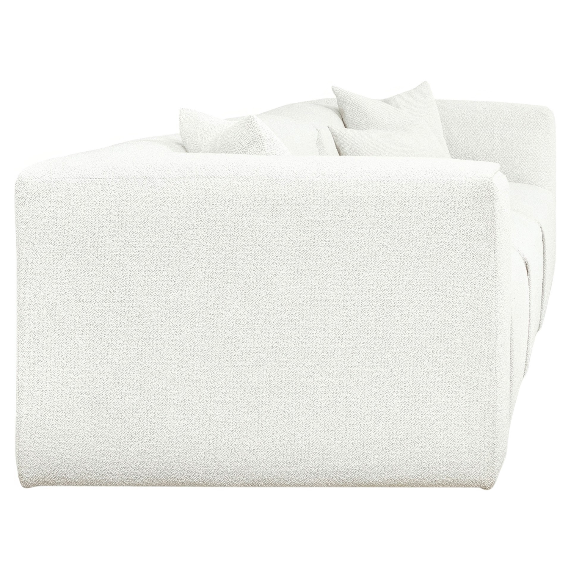 Each piece showcases a low, generously rounded profile, thanks to premium feather fill, upholstered in a textured nubby bouclé. The modern, Scandinavian-inspired silhouette is versatile enough to hold court in a beach house, mountain retreat, or boutique hotel lounge.