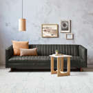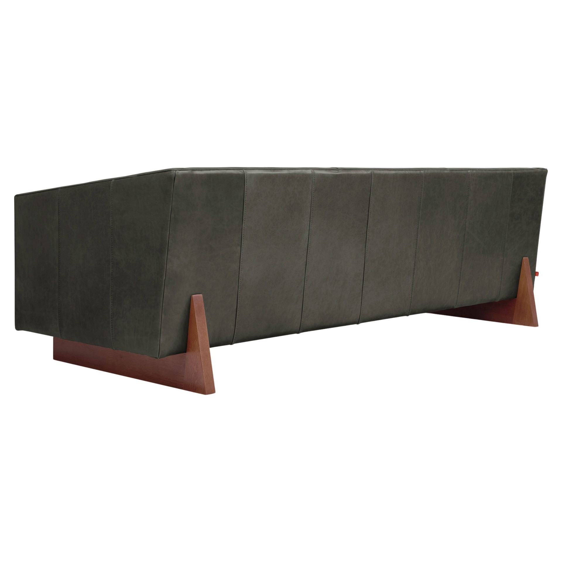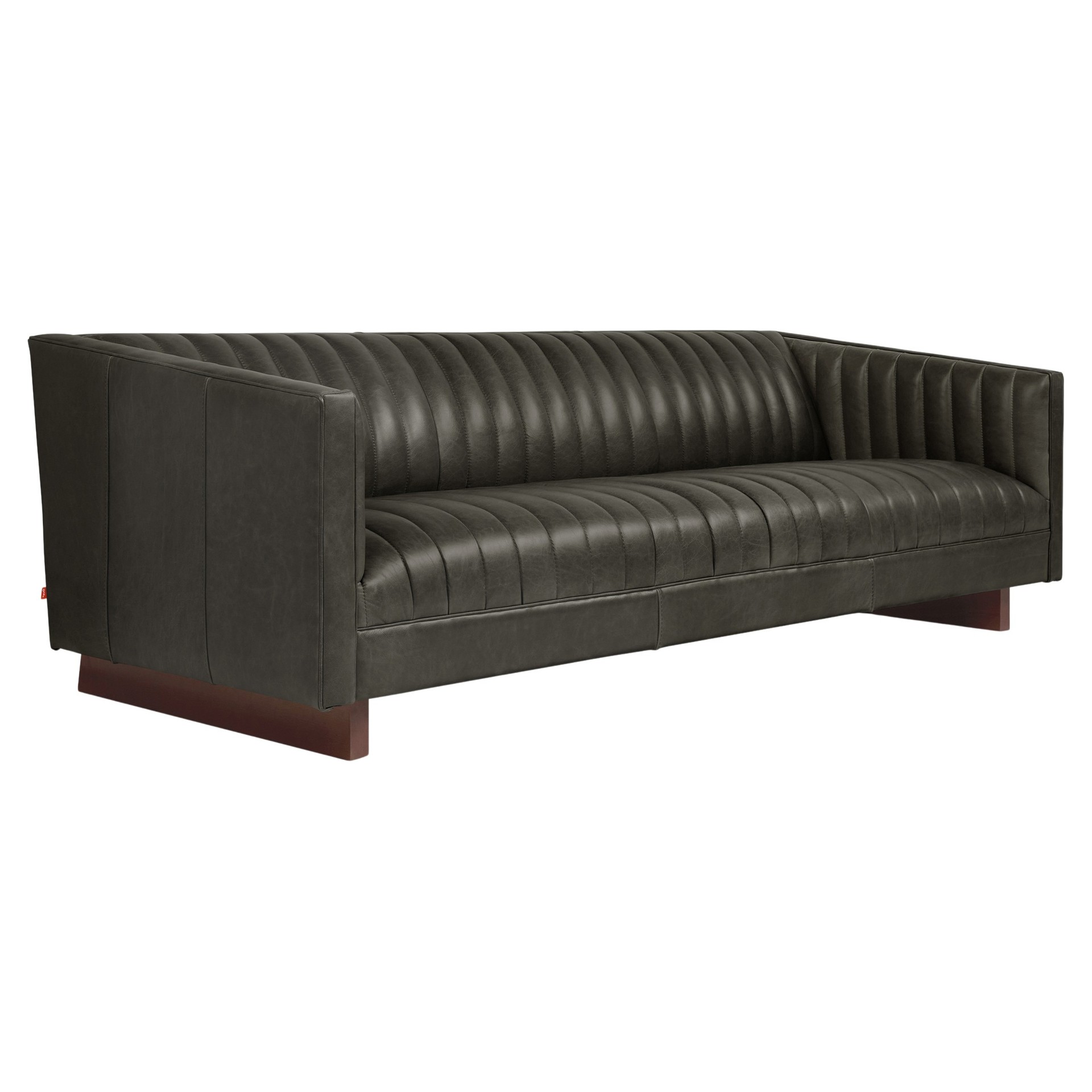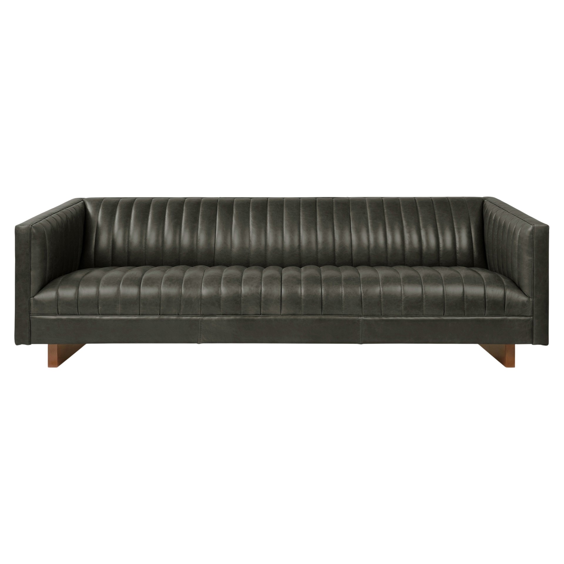 The Wallace Sofa is a modern reinterpretation of the classic English Chesterfield design. Channel-stitched leather upholstery on the seat, back, and arms creates a surface that’s both visually striking and remarkably comfortable.