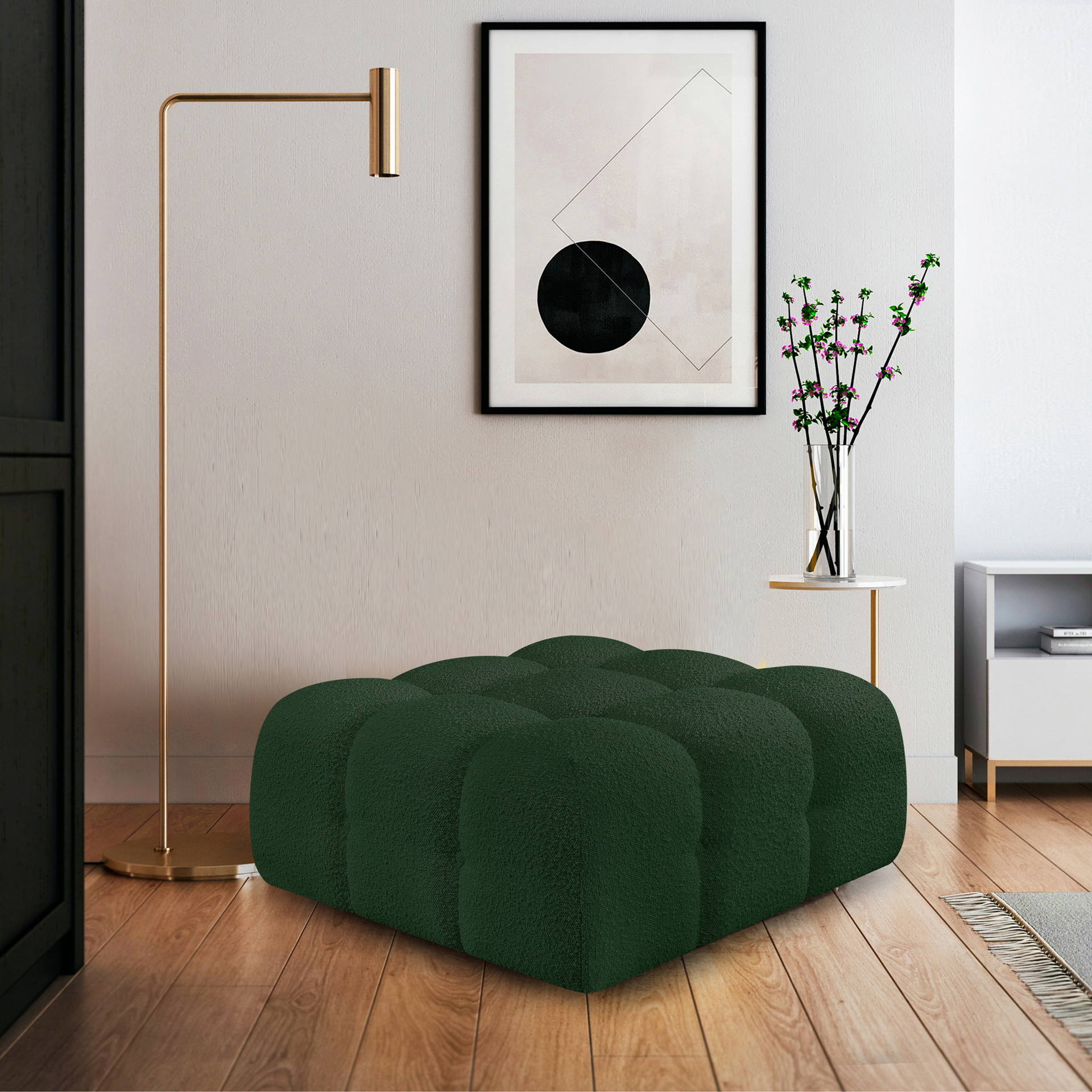 Introduce a touch of modern sophistication to your living area with the exquisite Ames Boucle Fabric Ottoman.
