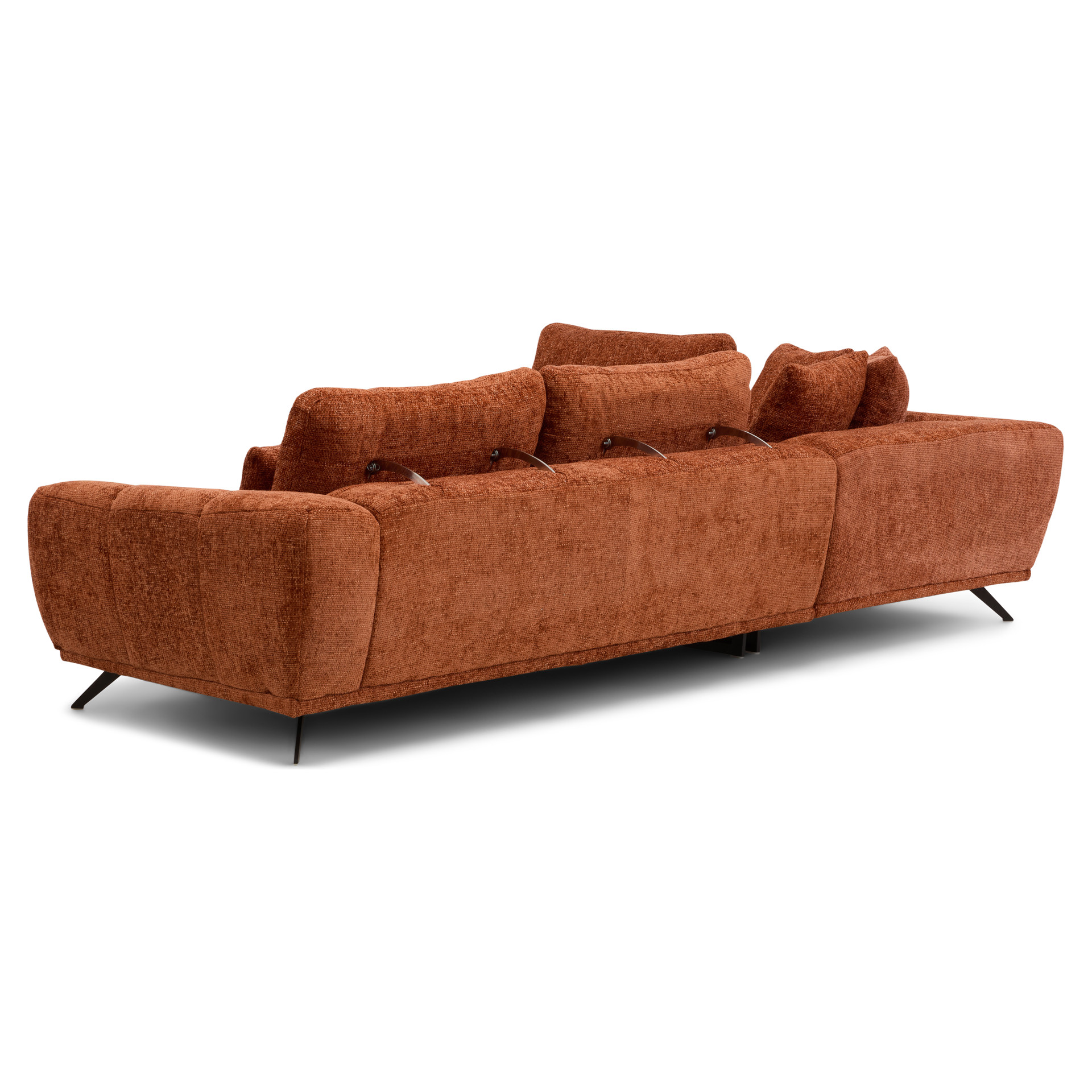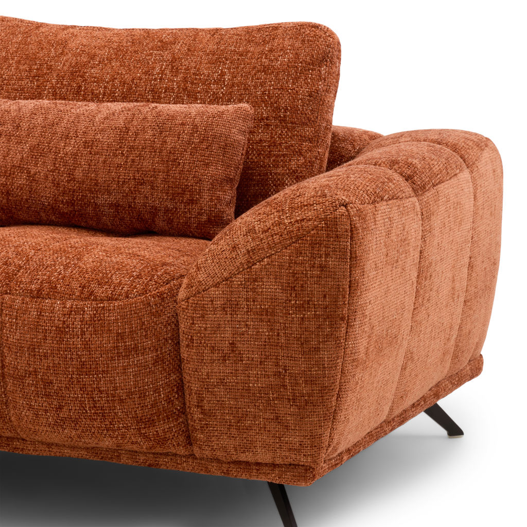 Generous cushions and a spacious seat offer plush comfort, while metallic accents on the backrests add a touch of contemporary elegance. The tapered, elevated legs create a sense of openness and make cleaning easier.