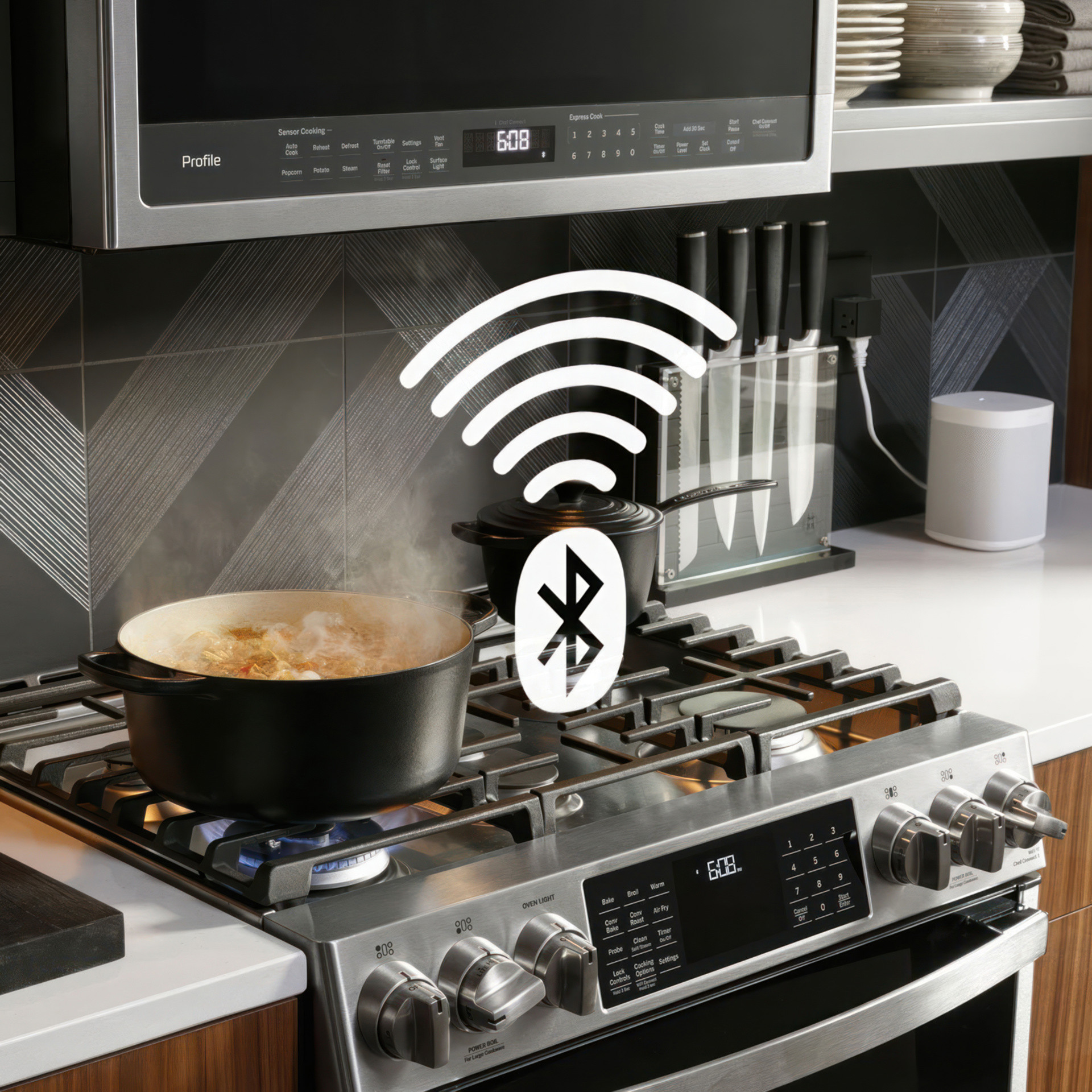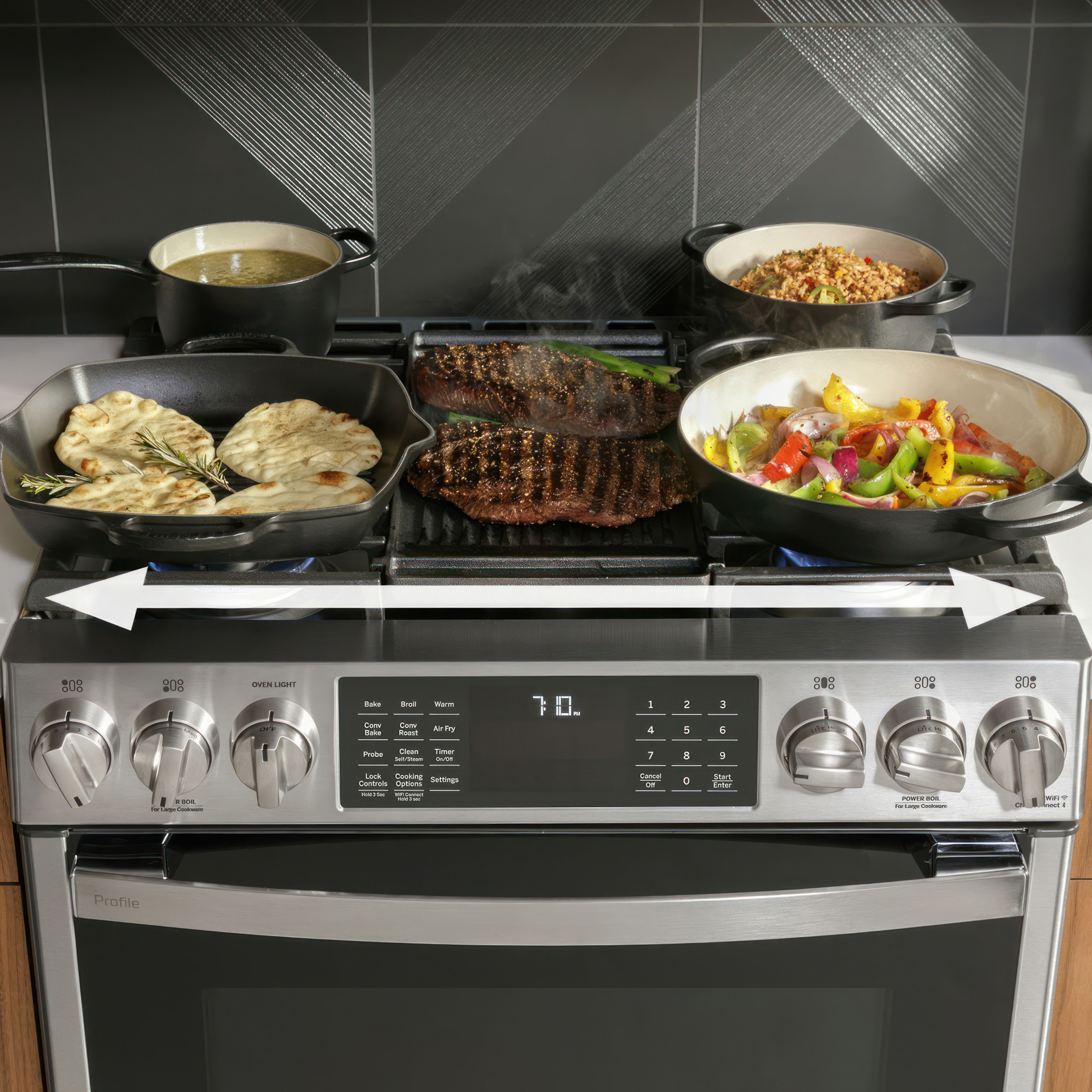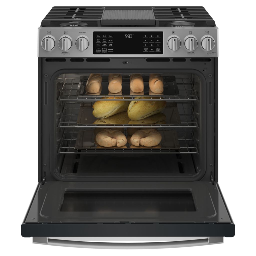 GE Profile 30” slide-in gas range with convection and Wi-Fi Connect. It features Chef Connect, true European convection and a hot-air fryer directly in the oven and without preheating for crispy, healthy versions of your favorite foods in less time.