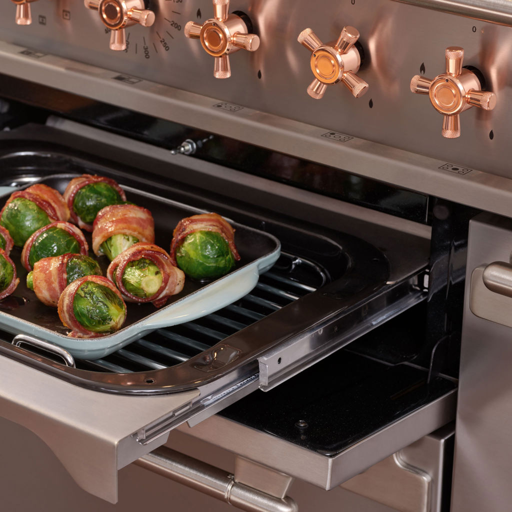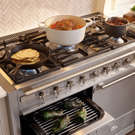 A second European convection oven offers the possibility of cooking several large dishes at once using different heating modes and temperatures, while a third oven with dedicated sliding grill allows dedicated top broiling.