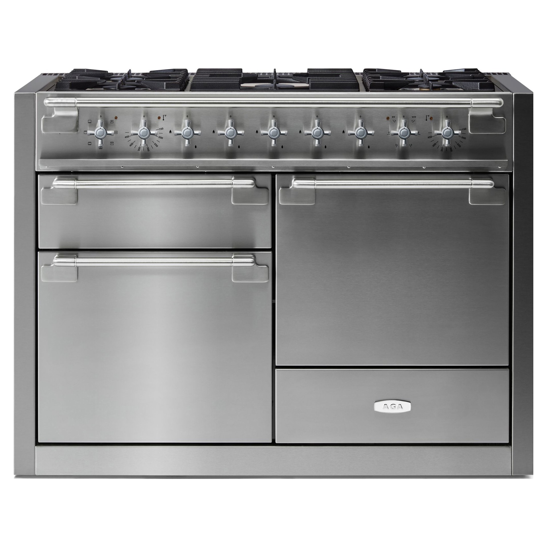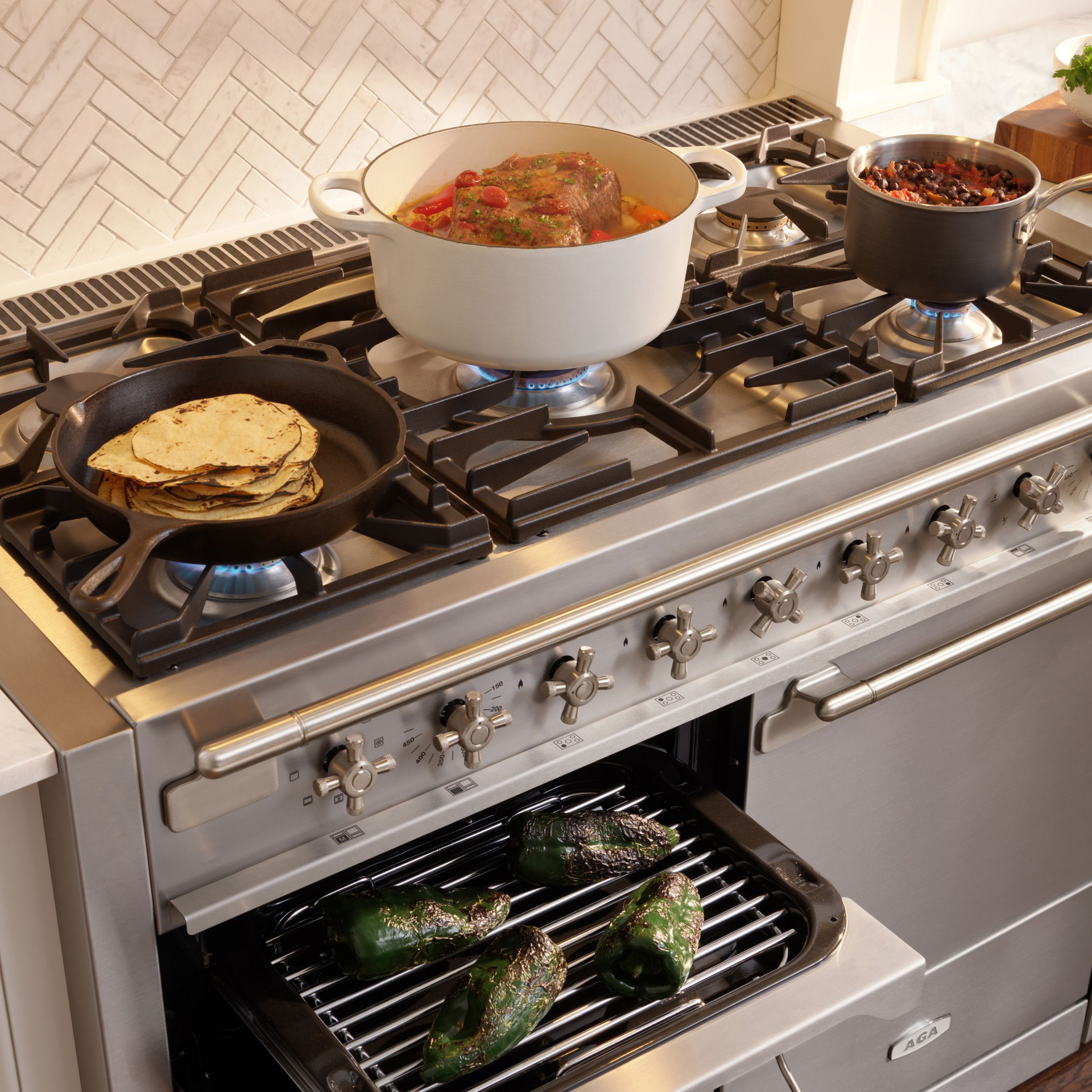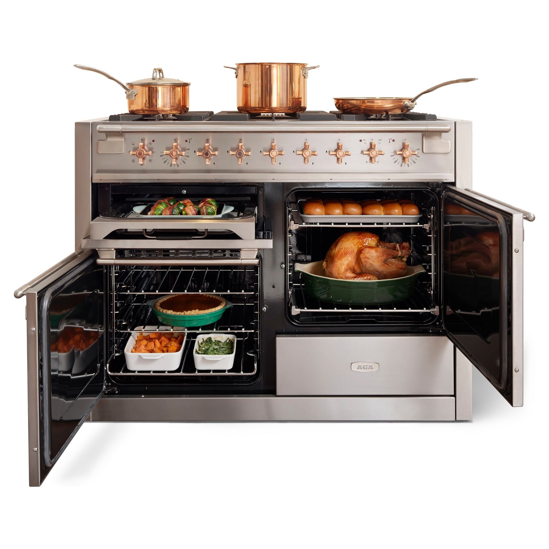 The 48” AGA Elise dual-fuel model features three separate ovens. The first is a multi-function electric oven with seven settings, including true European double-convection baking, convection-assisted baking, browning, defrosting and serving, convection broiling, reheating and conventional baking.
