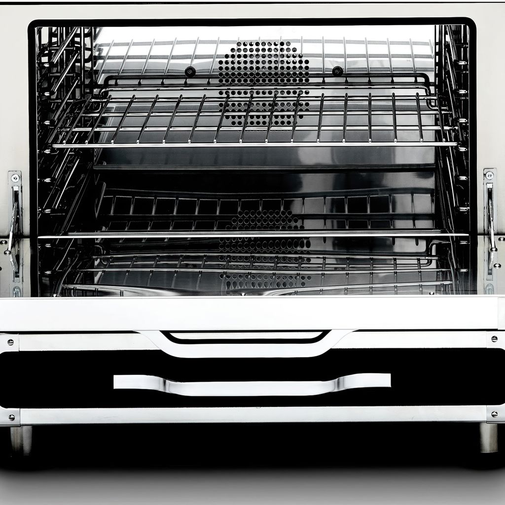 A durable stainless steel oven interior with two oven racks, including a TruGlide rack and five rack positions.