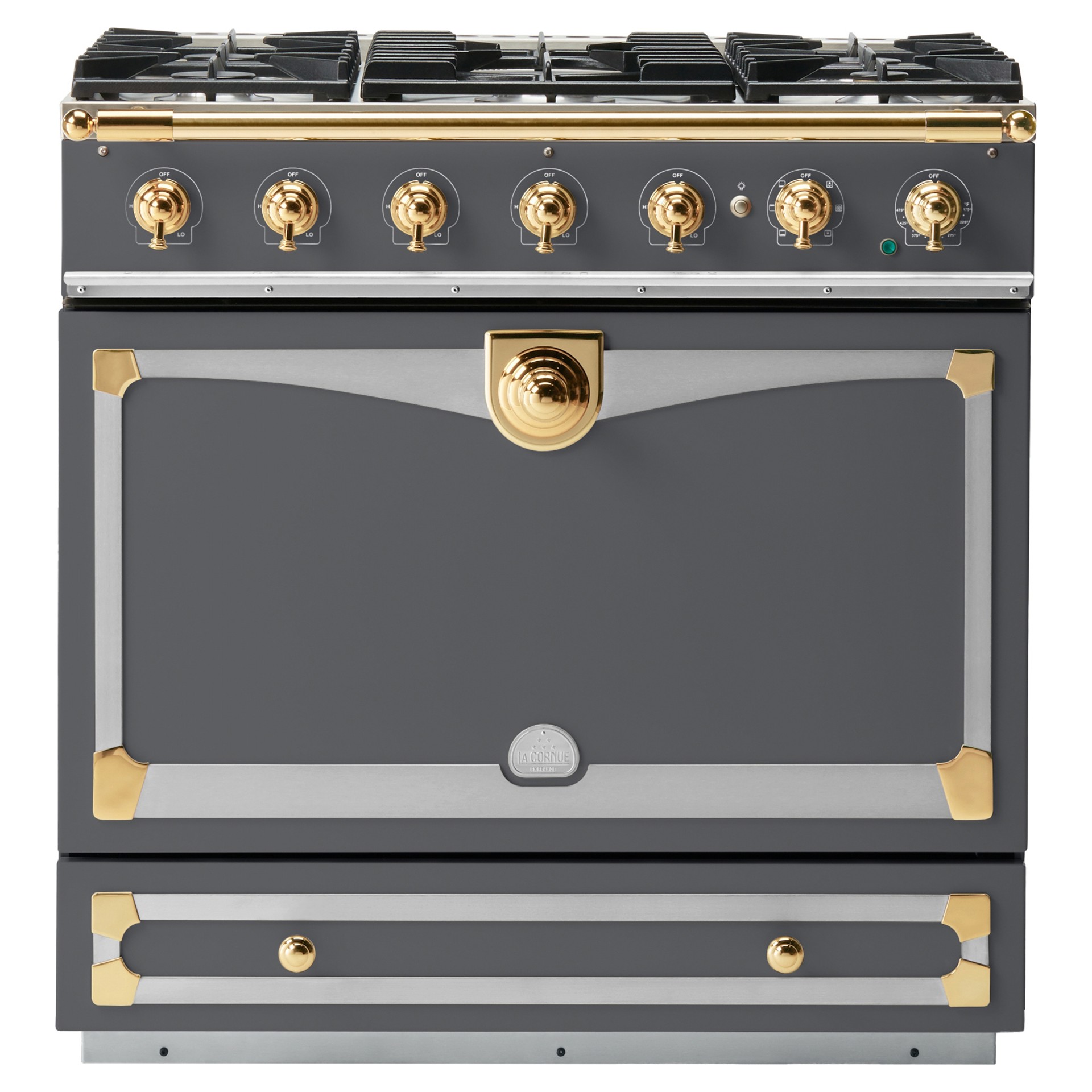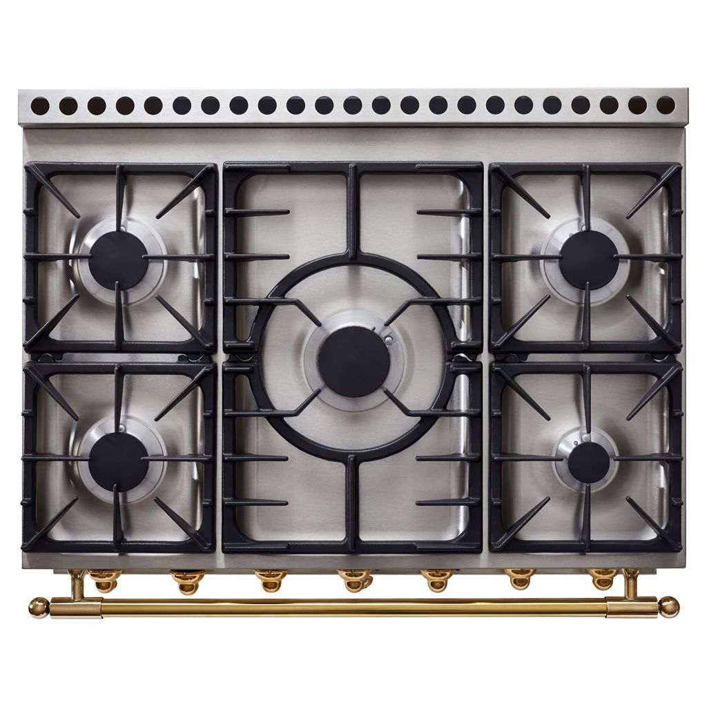 The La CornuFé 90 features continuous cast-iron grates that allow easy movement of cookware, an integrated storage drawer for utensils, and sliding oven racks for safe handling of dishes. Its surface is easy to clean, and while it does not include a self-cleaning function, the materials are designed for effortless manual maintenance. Safety is also prioritized, with a flame-failure device (thermocouple) that automatically cuts off the gas if the flame goes out, ensuring peace of mind with every use.