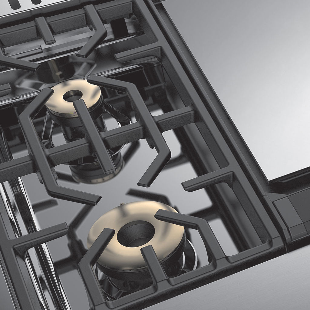 The Elevation™ brass flame ports deliver 23,000 BTU of power on the front burners across all width configurations, complemented by multiple 15,000 BTU burners and 8,000 BTU center burners for precise, versatile cooking performance.