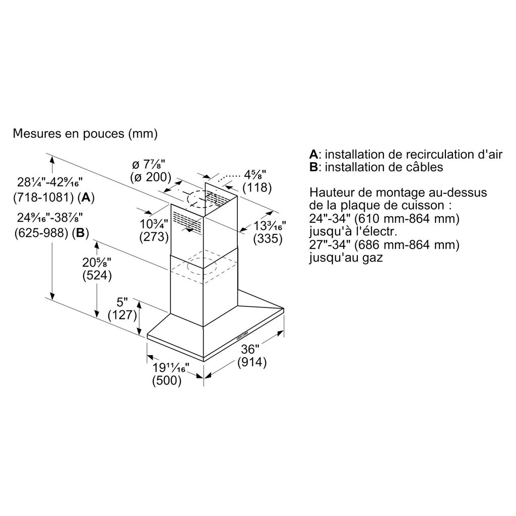 • Telescopic chimney design fits standard 8' or 9' high ceilings.
